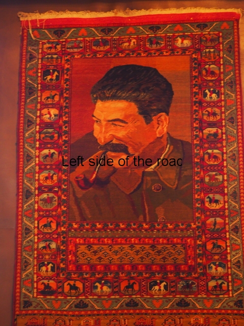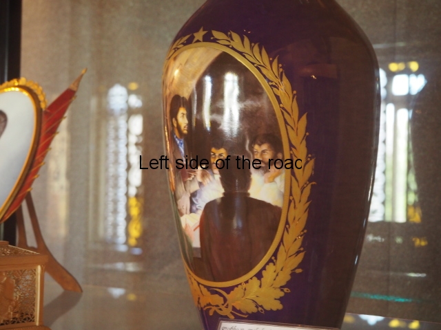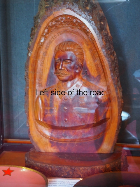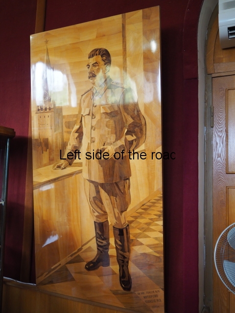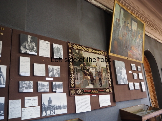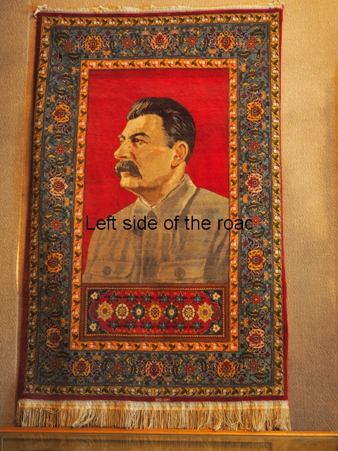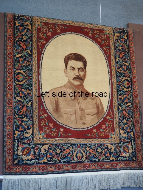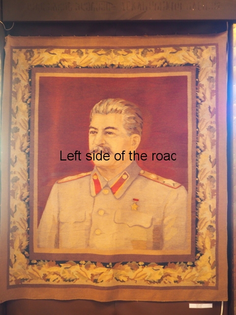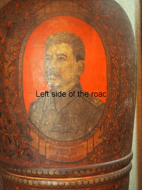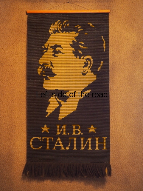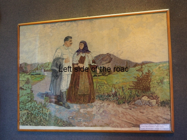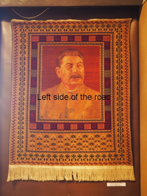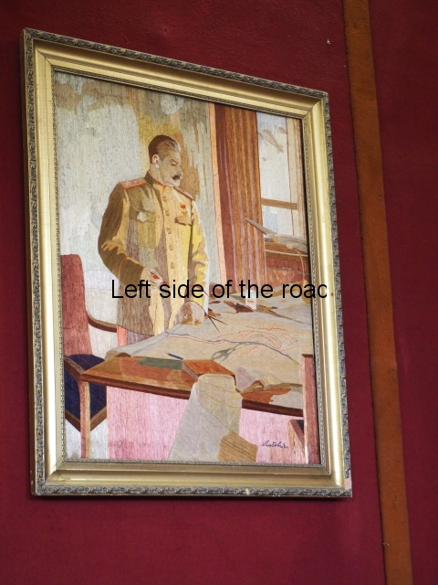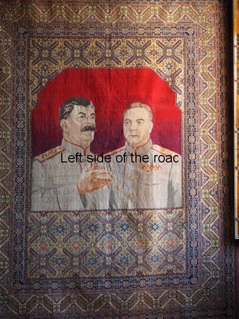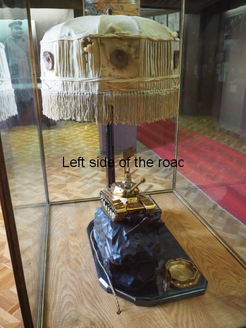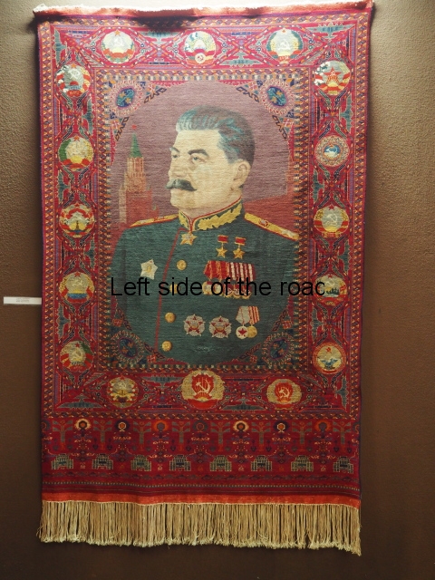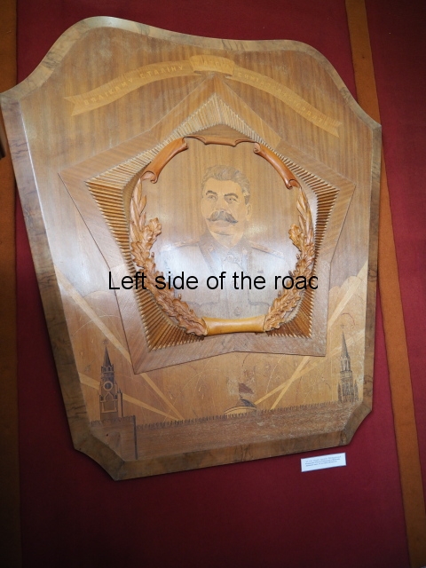 It’s in this room where there are more artefacts and this consists of presents and other objects bearing the image of Stalin, of other Communist leaders and items brought from former Socialist countries representing their culture. There are many objects (many depicted in the slide show) but it’s worth mentioning a picture of Stalin and his daughter, Svetlana, as a young girl; a textile print of a meeting between Stalin and Chairman Mao Tse-tung; a number of large carpets with Stalin as the central image; a couple of images of Stalin with his mother; a large, Chinese silk portrait of Stalin and a large, circular, metal plate with a mosaic of Stalin in the centre.