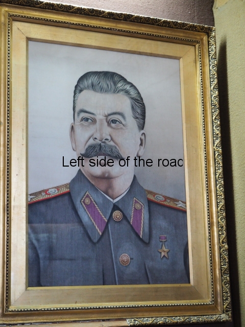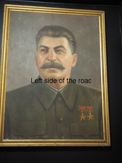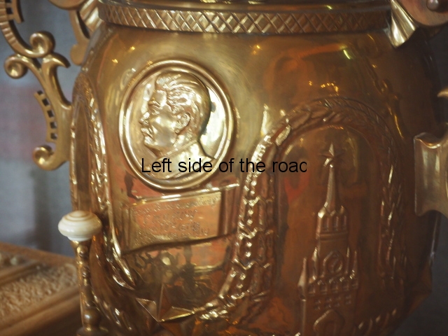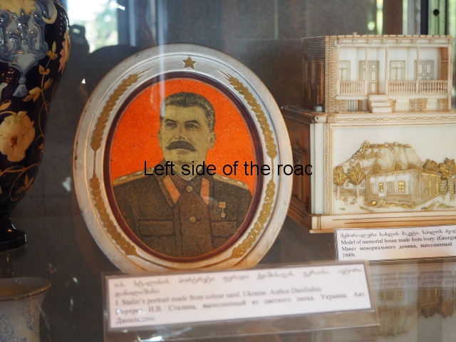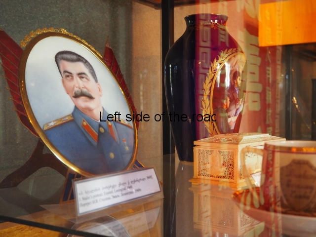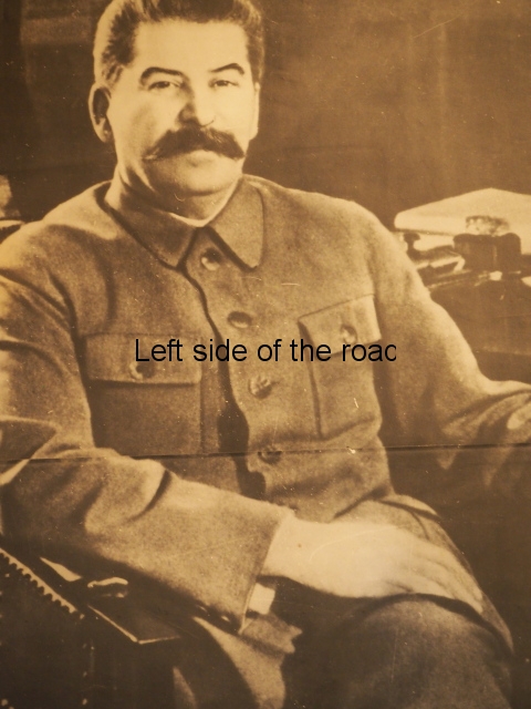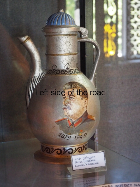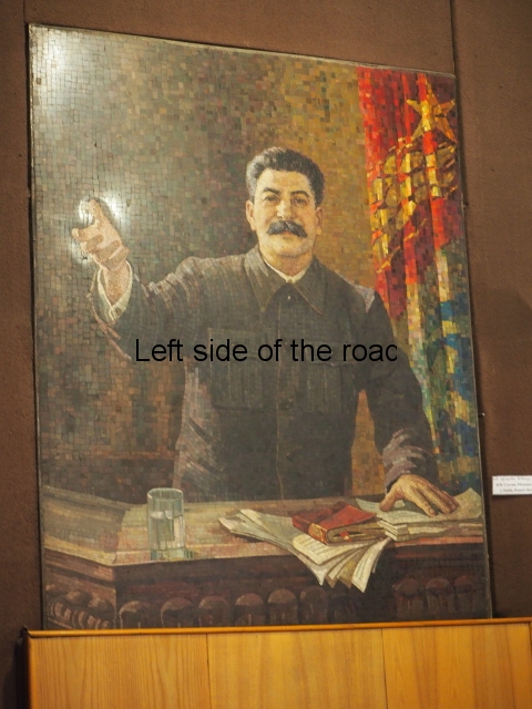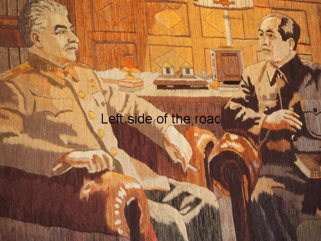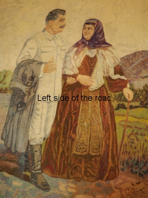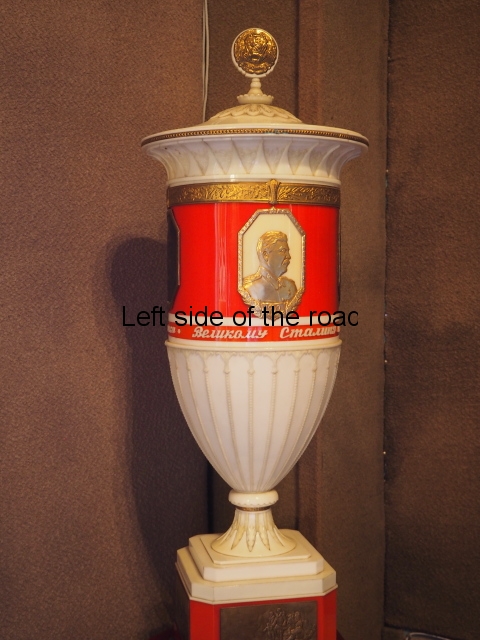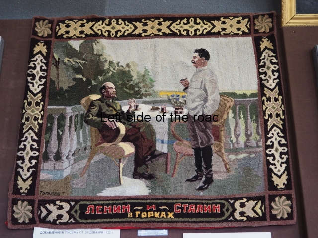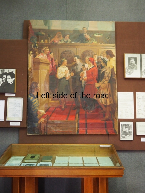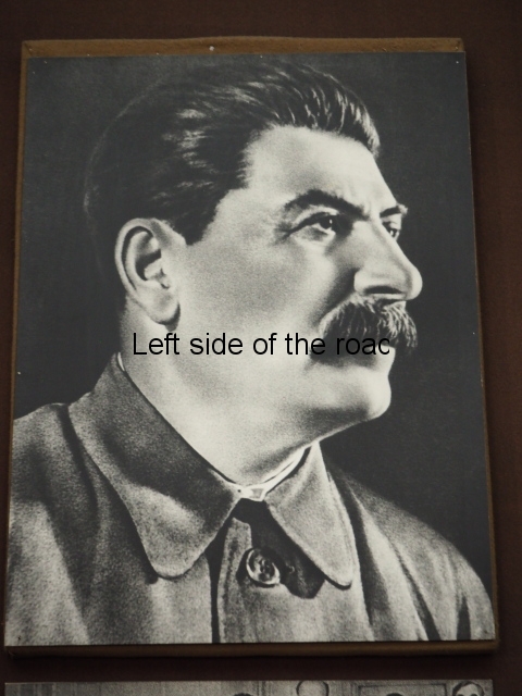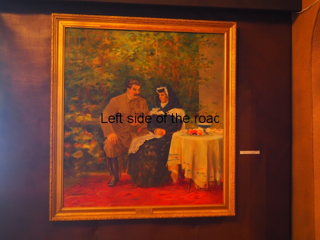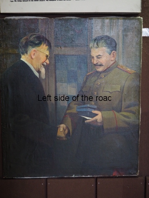 It’s in this room where there are more artefacts and this consists of presents and other objects bearing the image of Stalin, of other Communist leaders and items brought from former Socialist countries representing their culture. There are many objects (many depicted in the slide show) but it’s worth mentioning a picture of Stalin and his daughter, Svetlana, as a young girl; a textile print of a meeting between Stalin and Chairman Mao Tse-tung; a number of large carpets with Stalin as the central image; a couple of images of Stalin with his mother; a large, Chinese silk portrait of Stalin and a large, circular, metal plate with a mosaic of Stalin in the centre.