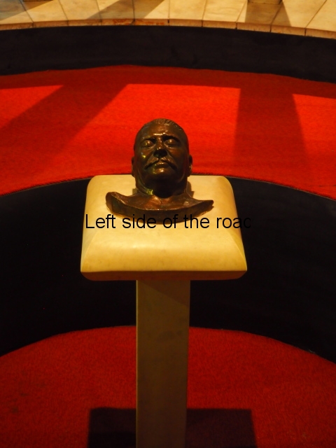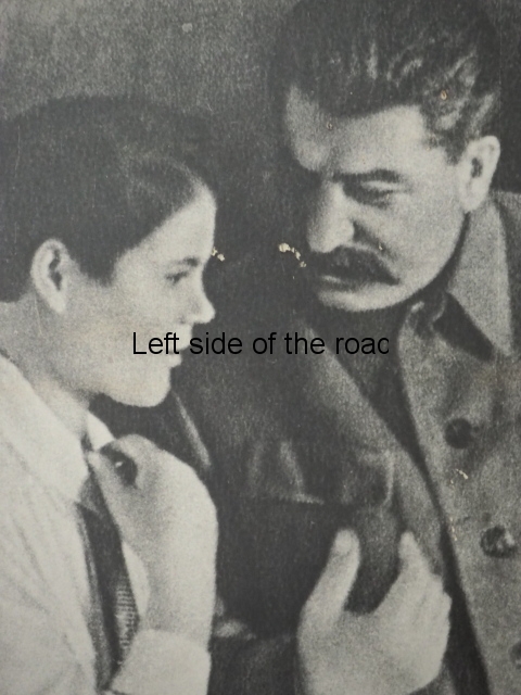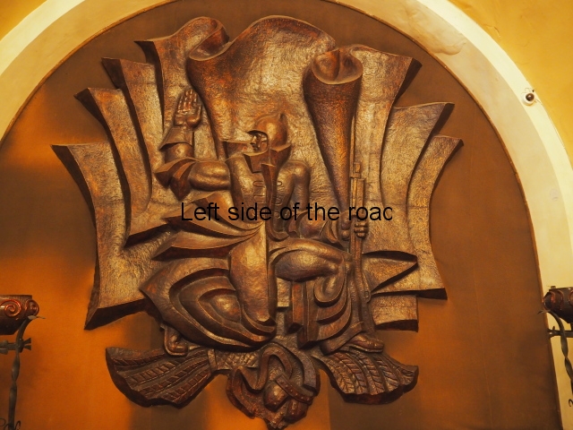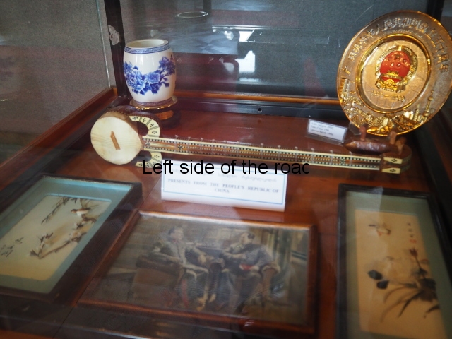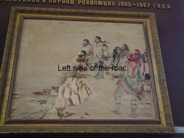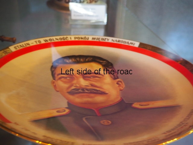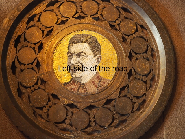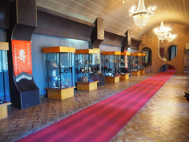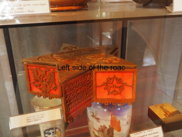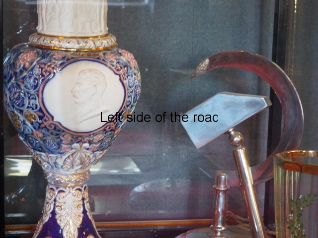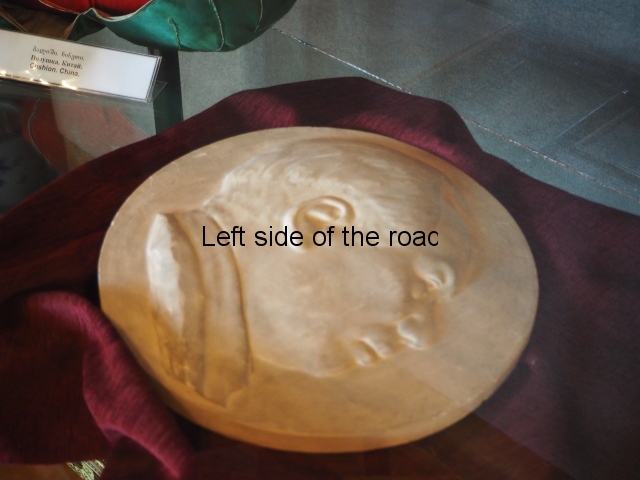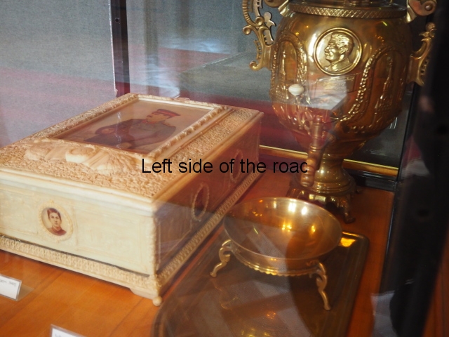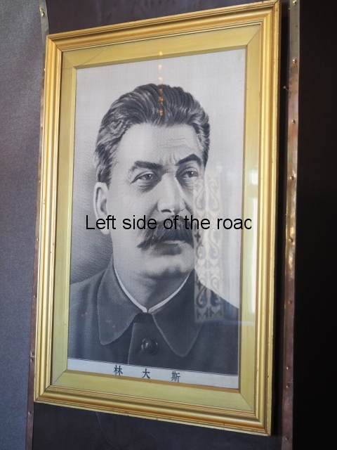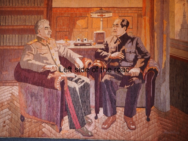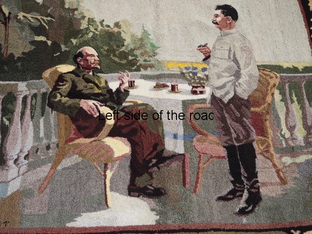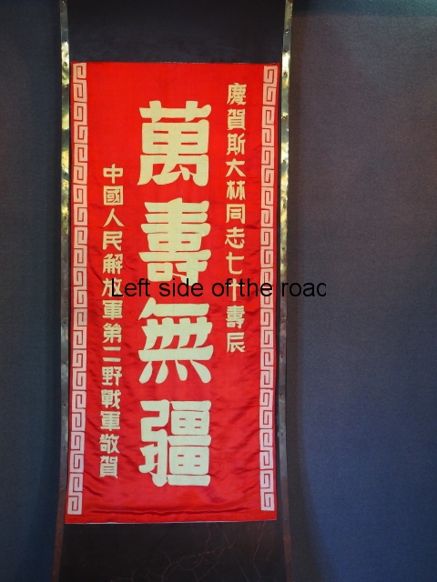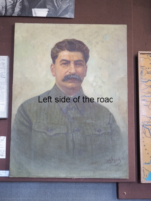 It’s in this room where there are more artefacts and this consists of presents and other objects bearing the image of Stalin, of other Communist leaders and items brought from former Socialist countries representing their culture. There are many objects (many depicted in the slide show) but it’s worth mentioning a picture of Stalin and his daughter, Svetlana, as a young girl; a textile print of a meeting between Stalin and Chairman Mao Tse-tung; a number of large carpets with Stalin as the central image; a couple of images of Stalin with his mother; a large, Chinese silk portrait of Stalin and a large, circular, metal plate with a mosaic of Stalin in the centre.