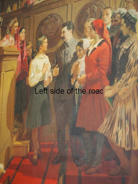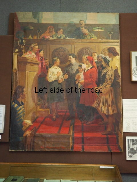 Highlights in this room include: Stalin at a meeting with workers in a locomotive works; Stalin with Collective Farm workers; Stalin greeting a young female collective farm worker; a series of postcards produced in the 1930s and a large bust of an older Stalin.