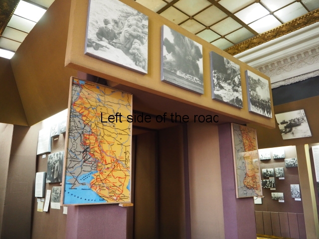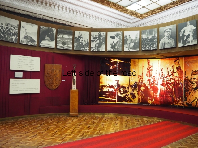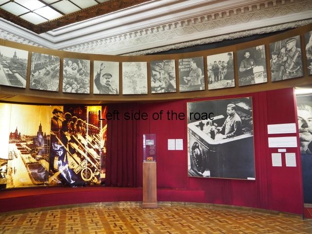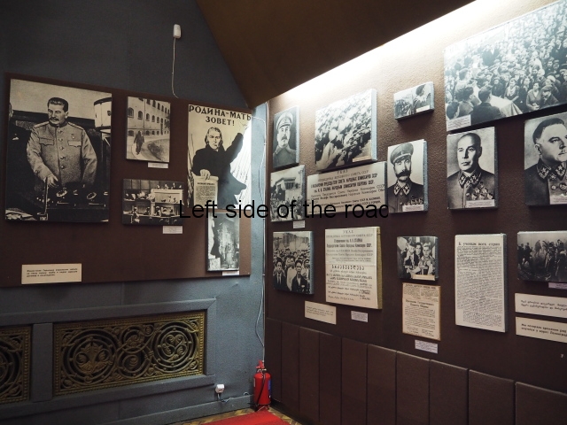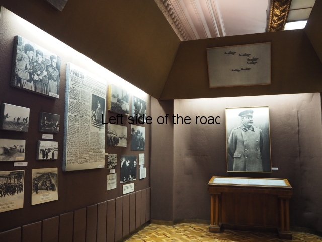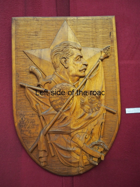 Highlights in this room include: a carved wooden shield with Stalin in profile amongst a number of symbols representing the Soviet Union and the image of a Russian sword smashing through a swastika at the bottom right; pictures taken a various stages of Stalin’s life; two large carpets with an image of Stalin (one of them also with Kliment Voroshilov); an image of Nazi banners being dragged through the dirt of Red Square in front of the Lenin Mausoleum and a picture of one of Stalin’s last public appearances at the 19th Congress of the CPSU.