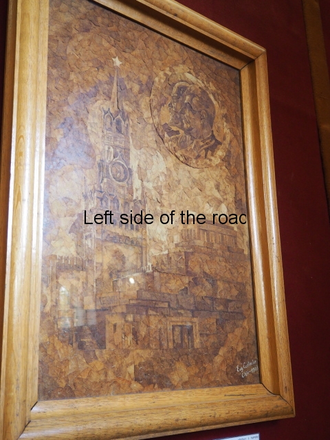 On leaving the first floor, where the majority of the exhibits will be found, by taking the right hand staircase this will lead you to the reconstruction of Stalin’s Kremlin Office (the first door on the right). Really the office is just the collection of chairs and sofas with a desk immediately on the right as you walk through the door. The rest of the space is taken up with further images of Stalin, both in paint and intricate marquetry; one of his ceremonial uniforms; two maquettes of the Stalingrad War Memorial and (quite unique) an image of both Lenin and Stalin made from tobacco leaves (just above the piano).