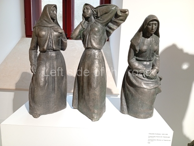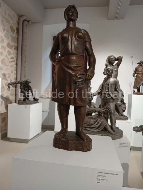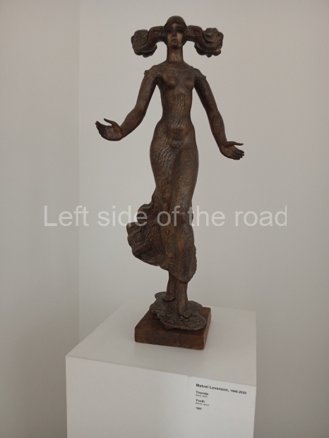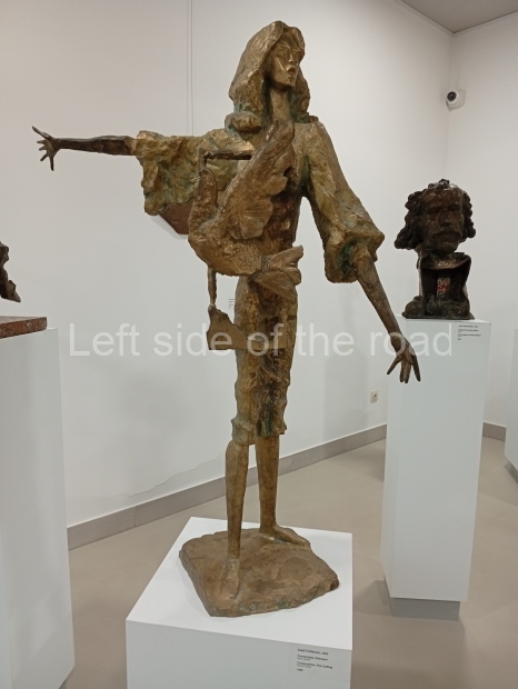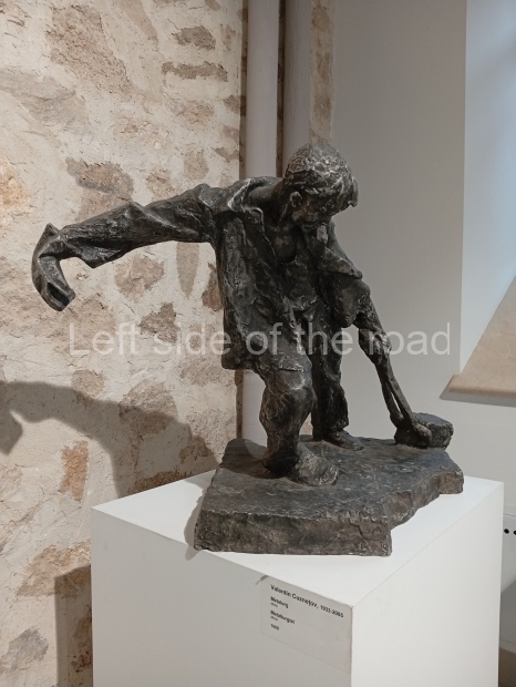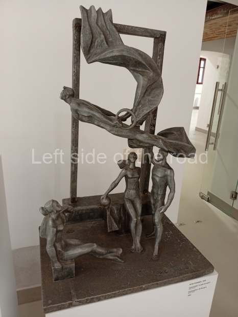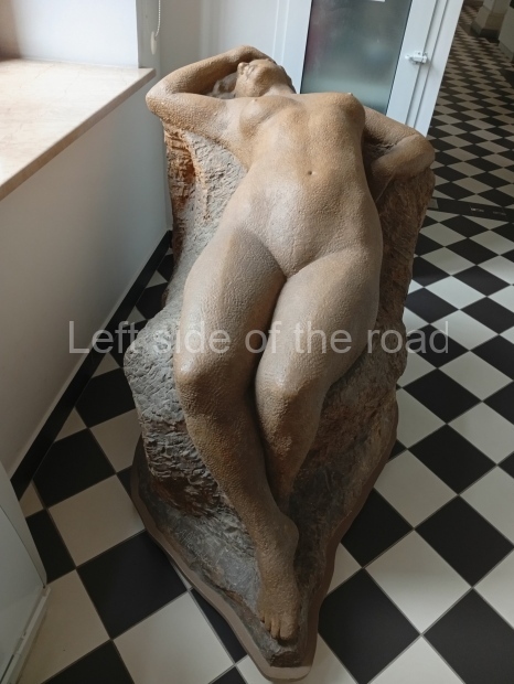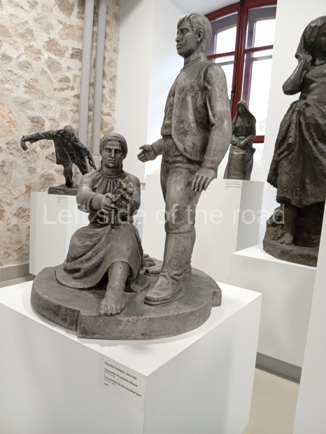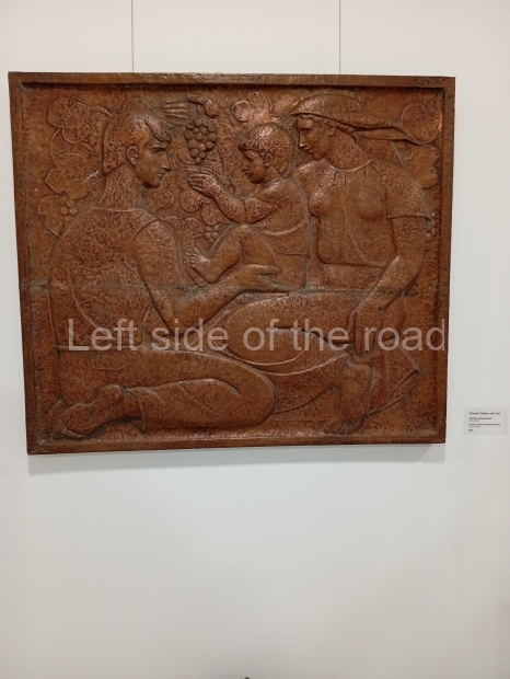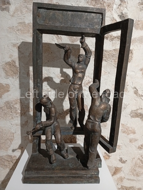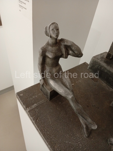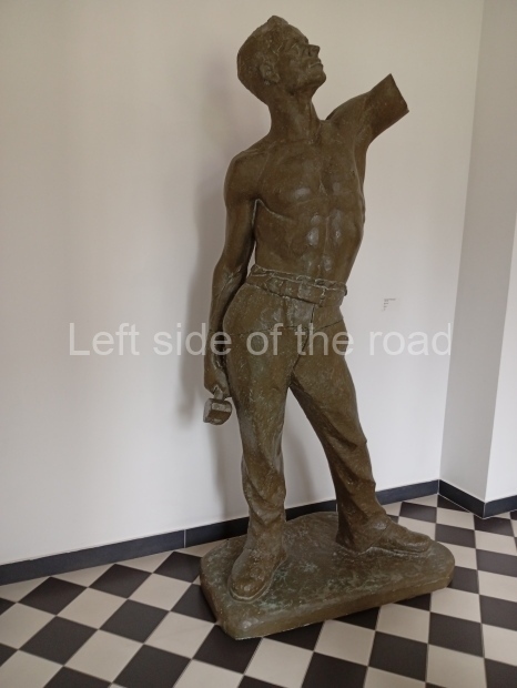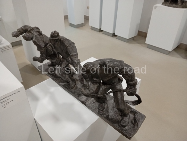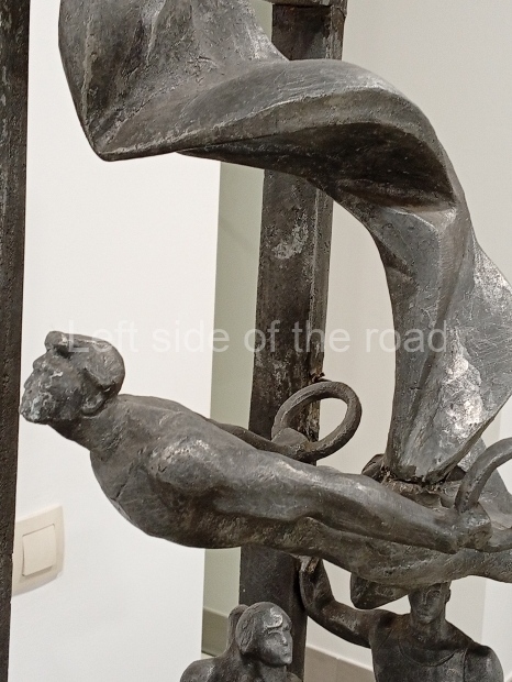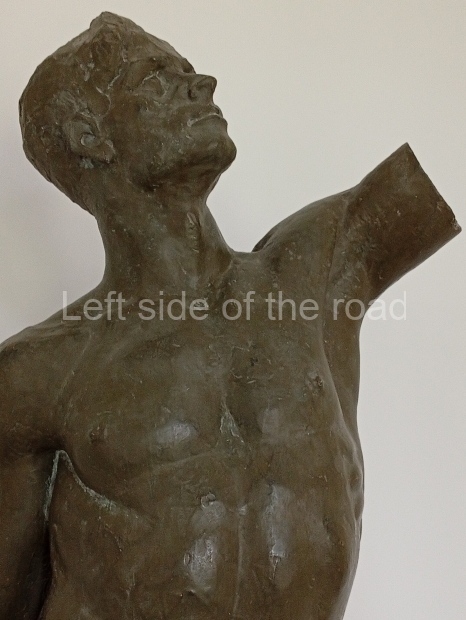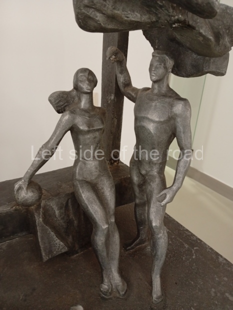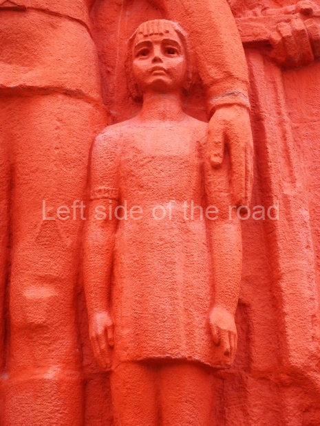 The first, the one on the left as you look towards the main cemetery with the road at your back, makes an allegorical reference to the war. Here we have a young, almost naked muscular male sitting on the ground (not obviously injured in any way) with his right arm raised, above his head and slightly behind his back. In his hand he holds a huge sword with its point reaching to the edge of the stela. This might mean a willingness and preparedness to fight to defend the cause of Socialism and the lives of his family, friends and comrades. Not really sure I understand why he’s on the ground.