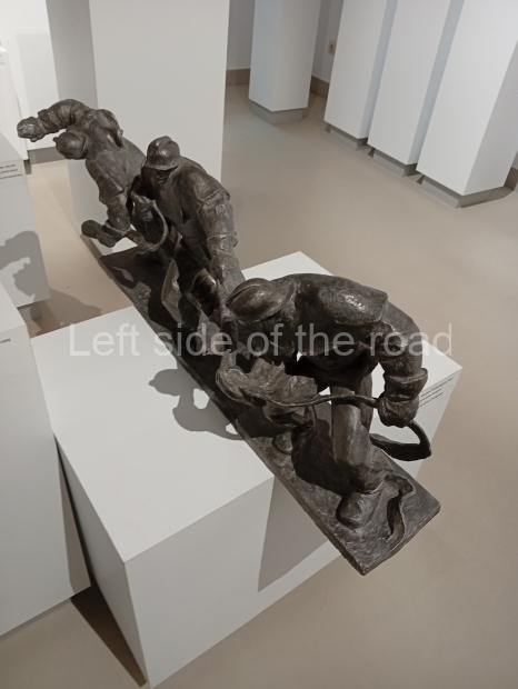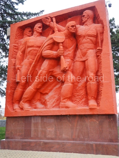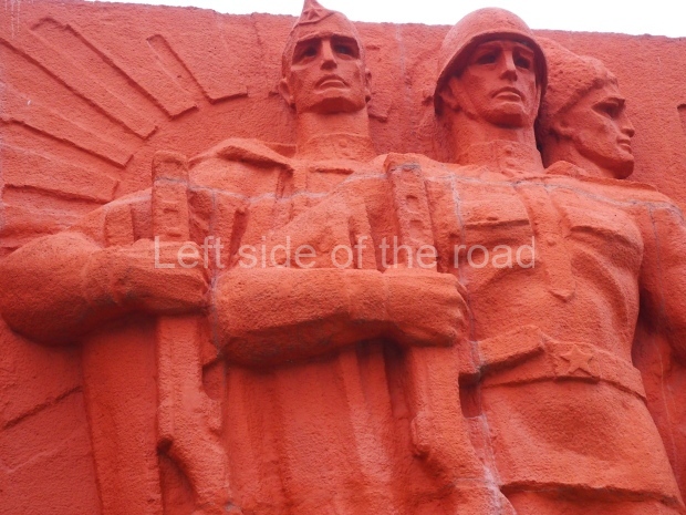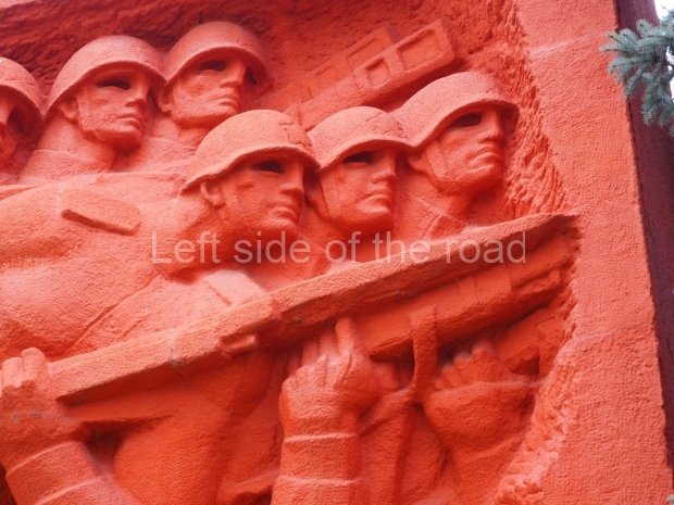 As stated above there are six, very large, square stelae (also now painted the same bright orange as the monument containing the Eternal Flame) which contain images of soldiers but at the same time none of them reference the enemy against which they were fighting – that is, German Nazism. Without knowing the context they could be fighting in any 20th century war.