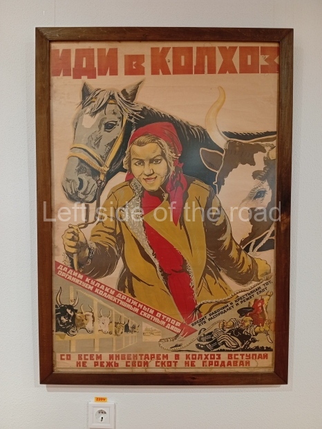 The final one, with the year 1945 in the top, right-hand corner, celebrates the victory. Here we have the image of three soldiers, almost standing to attention – their weapons no longer pointing towards the enemy. Their uniforms and headwear demonstrating the different units involved and the fur hat of the soldier on the right emphasising that this was a war of all the people’s of the Soviet Republics. The idea of peace is shown by the fact that there’s a young girl standing by the central soldier – who has his left hand resting on her shoulder. It is now safe for her carry on her life as normal, for her and all the children in the Soviet Union.