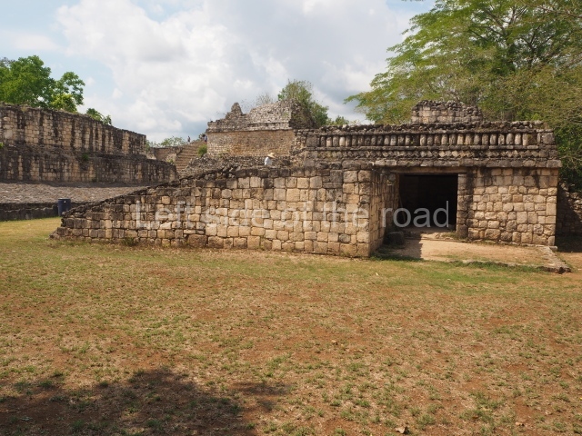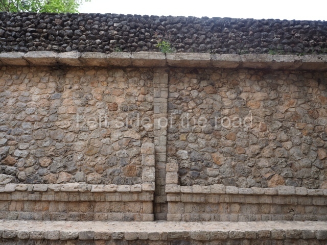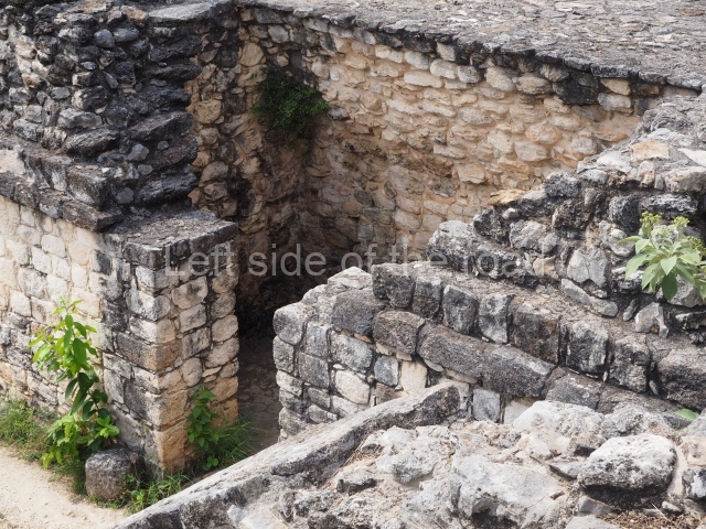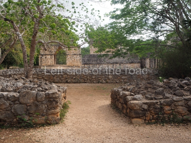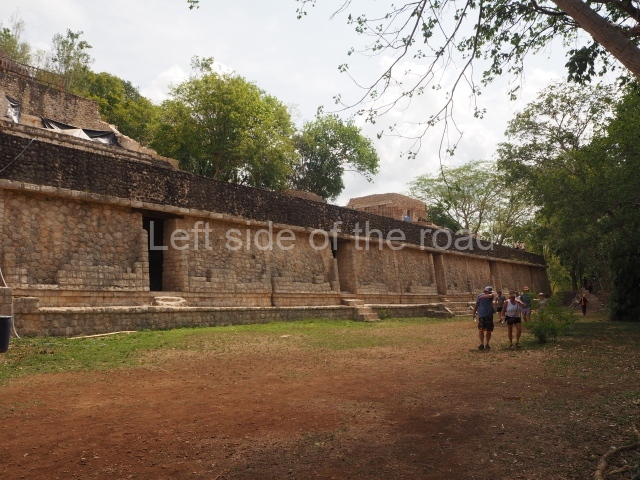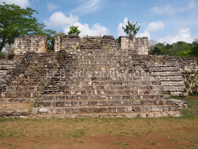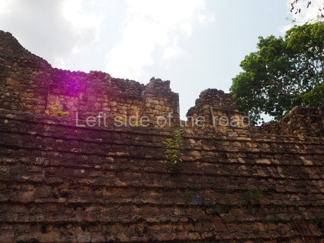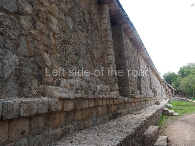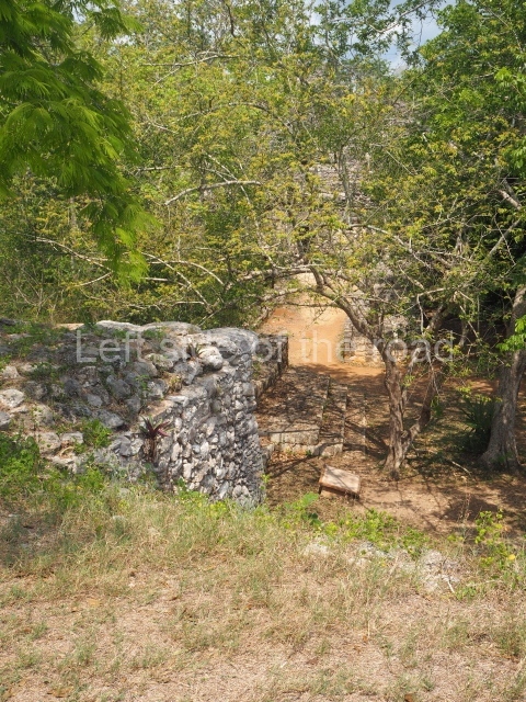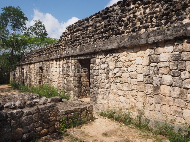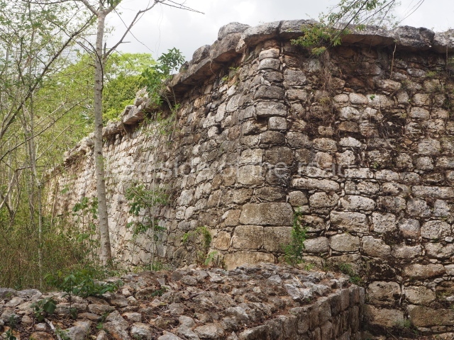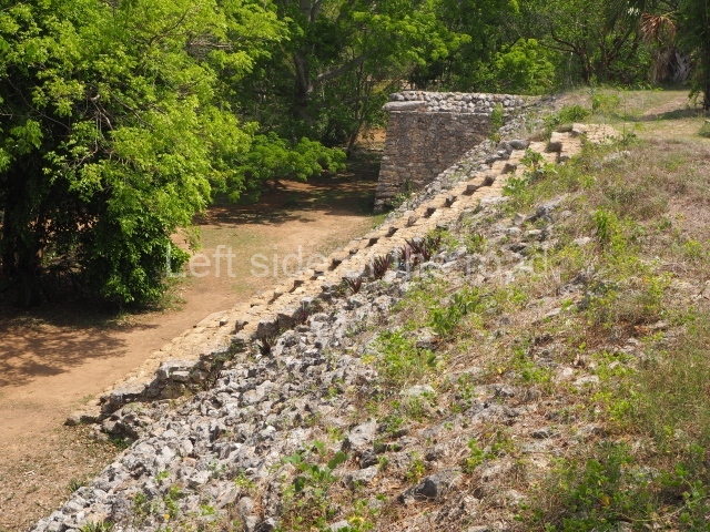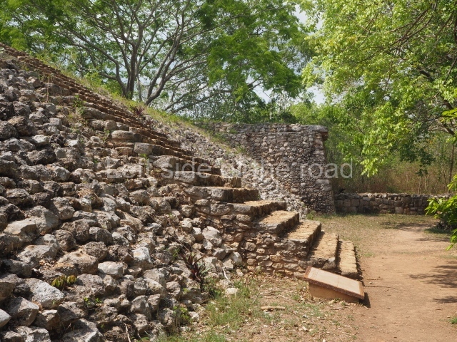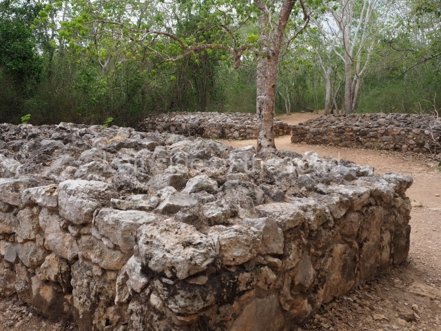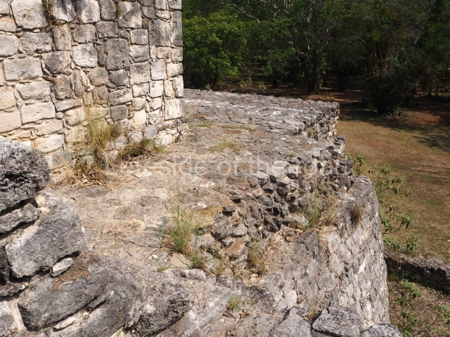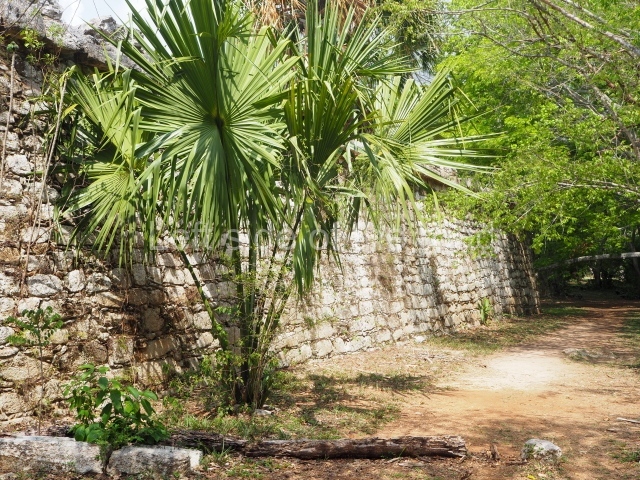 The walled enclosure occupies 1.25 sq km and is surrounded by two concentric stone walls – called Exterior Wall and Interior Wall – relatively low in height but originally with high wooden palisades. There is a Third Wall which connects some of the main buildings and during pre-Hispanic times provided greater protection to the royal seat. Five causeways or sacbeob once departed from the Exterior Wall to other parts of the city, and one of them even appears to have led directly to another city. Two of these causeways are situated on the south side and the remaining ones at the other cardinal points and the ramp of Structure 8 furnished an important offering of more than 90 vessels and numerous burnt stone balls. Structure 9 contains a partly concealed room with a stucco-modelled frieze painted in blue, black, green and red; the scene depicts an important personage in profile, seated on a throne and holding a bird in his hand. During the excavations, the ring of Structure 8 was found but unfortunately the ring from Structure 9 was stolen many years ago. The last stage of the Ball Court was built in AD 841, as evidenced by a painted capstone bearing this date and the name Tz’ihb’am Tuun.