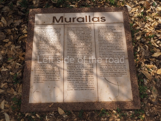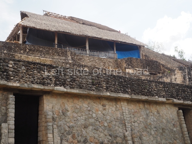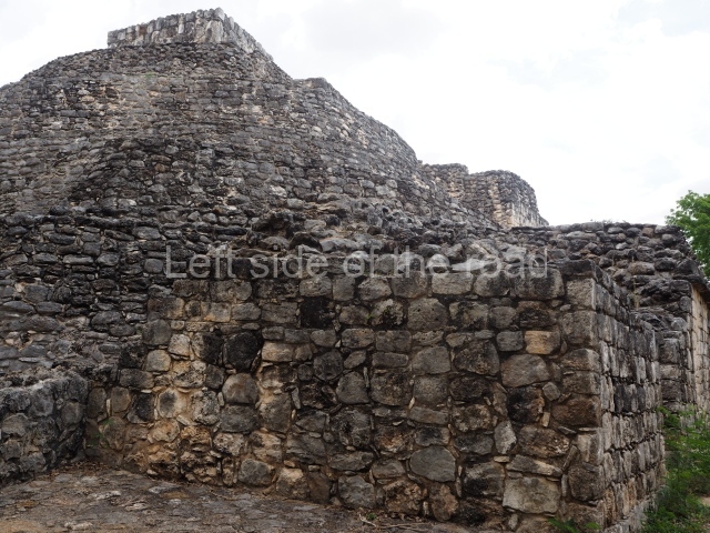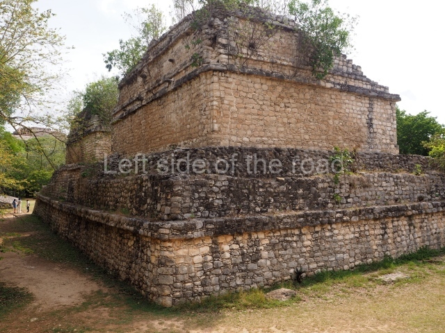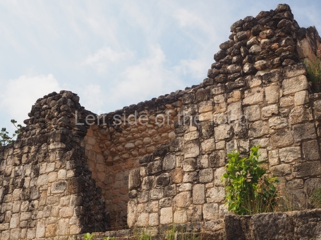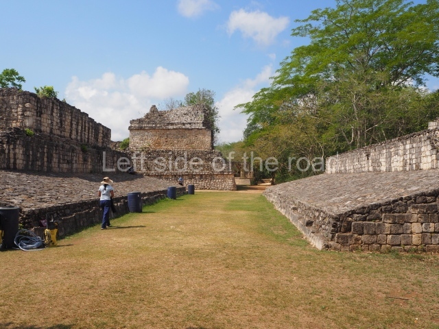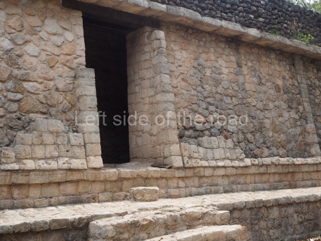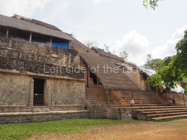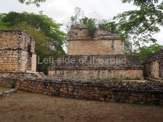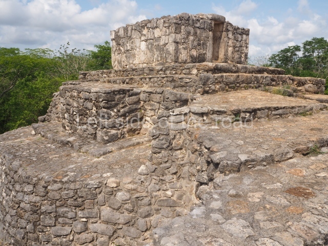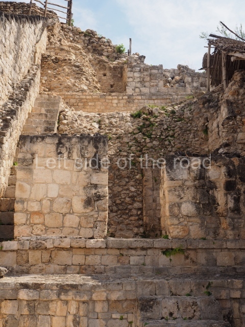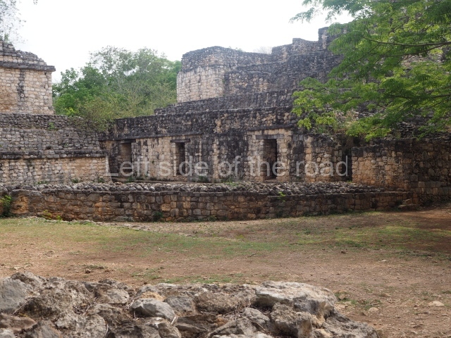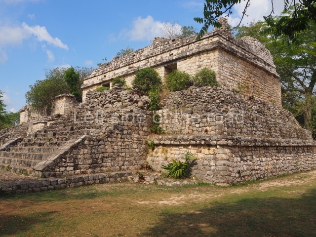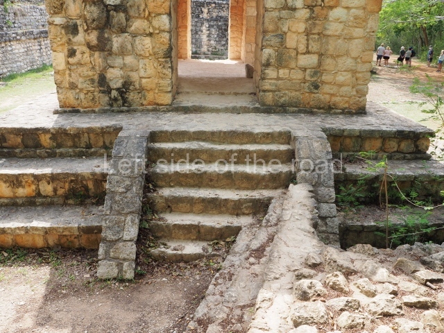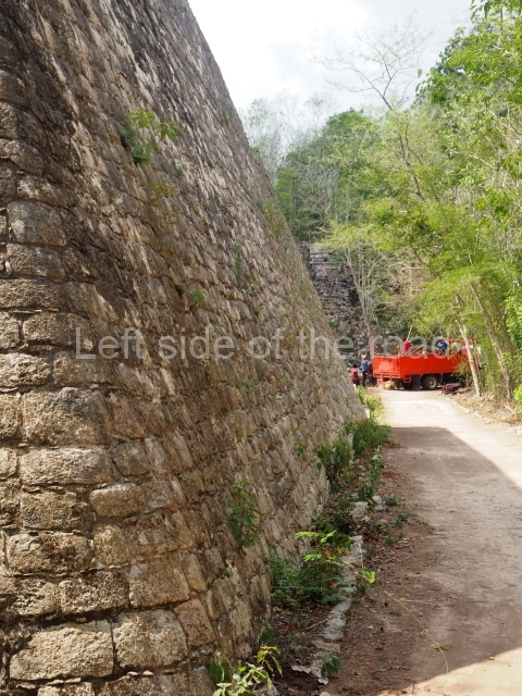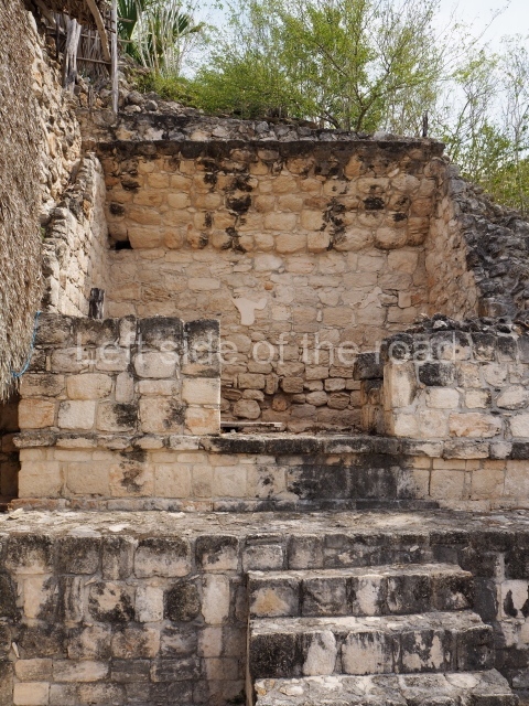 The walled enclosure occupies 1.25 sq km and is surrounded by two concentric stone walls – called Exterior Wall and Interior Wall – relatively low in height but originally with high wooden palisades. There is a Third Wall which connects some of the main buildings and during pre-Hispanic times provided greater protection to the royal seat. Five causeways or sacbeob once departed from the Exterior Wall to other parts of the city, and one of them even appears to have led directly to another city. Two of these causeways are situated on the south side and the remaining ones at the other cardinal points and the ramp of Structure 8 furnished an important offering of more than 90 vessels and numerous burnt stone balls. Structure 9 contains a partly concealed room with a stucco-modelled frieze painted in blue, black, green and red; the scene depicts an important personage in profile, seated on a throne and holding a bird in his hand. During the excavations, the ring of Structure 8 was found but unfortunately the ring from Structure 9 was stolen many years ago. The last stage of the Ball Court was built in AD 841, as evidenced by a painted capstone bearing this date and the name Tz’ihb’am Tuun.