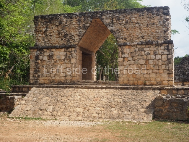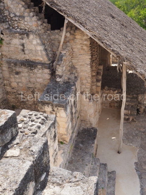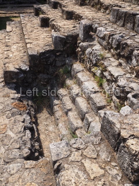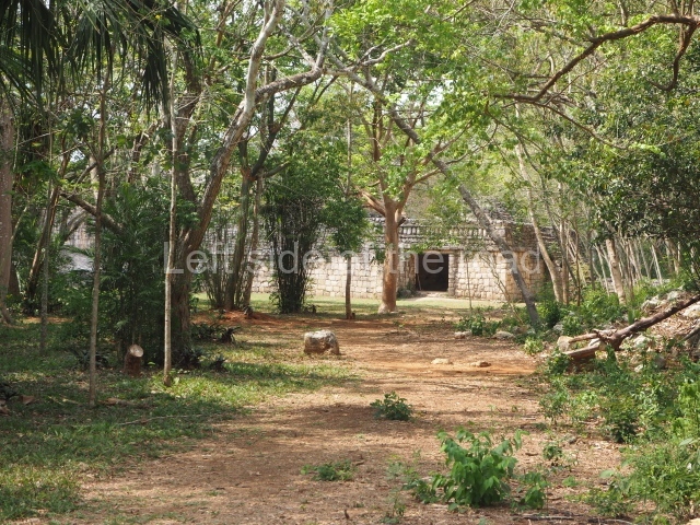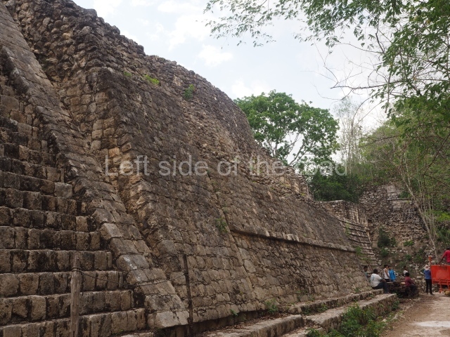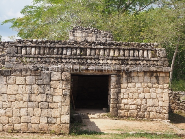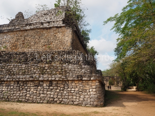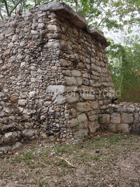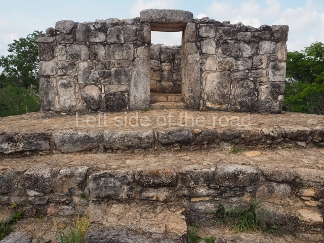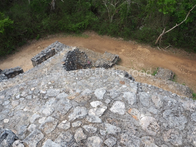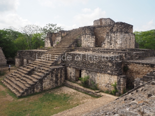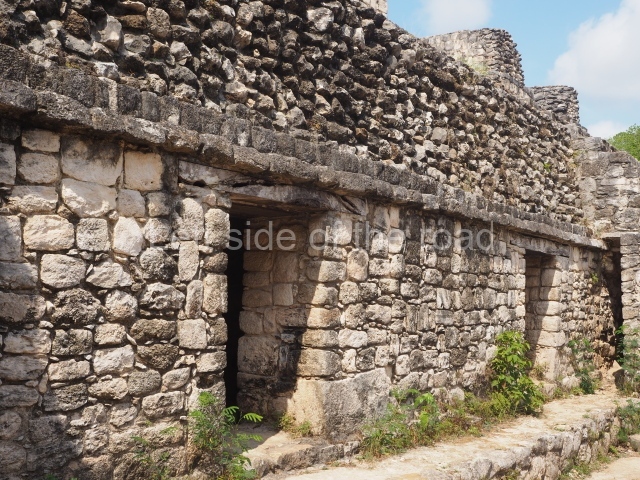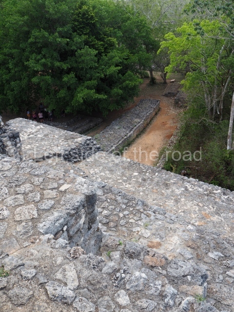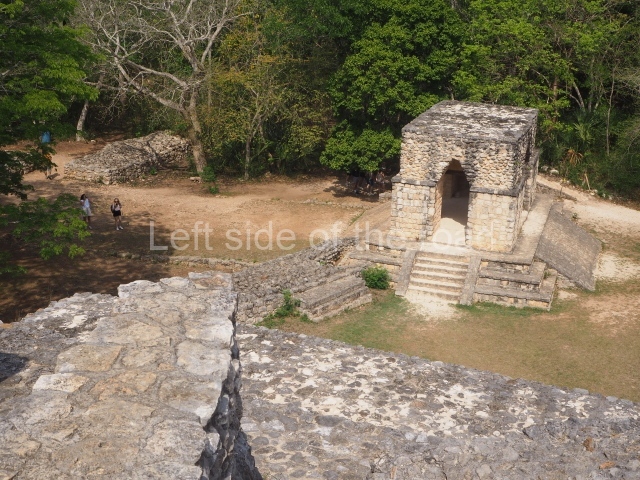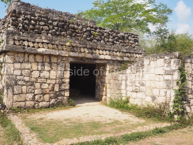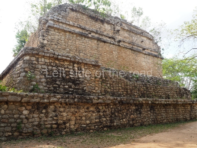 The walled enclosure occupies 1.25 sq km and is surrounded by two concentric stone walls – called Exterior Wall and Interior Wall – relatively low in height but originally with high wooden palisades. There is a Third Wall which connects some of the main buildings and during pre-Hispanic times provided greater protection to the royal seat. Five causeways or sacbeob once departed from the Exterior Wall to other parts of the city, and one of them even appears to have led directly to another city. Two of these causeways are situated on the south side and the remaining ones at the other cardinal points and the ramp of Structure 8 furnished an important offering of more than 90 vessels and numerous burnt stone balls. Structure 9 contains a partly concealed room with a stucco-modelled frieze painted in blue, black, green and red; the scene depicts an important personage in profile, seated on a throne and holding a bird in his hand. During the excavations, the ring of Structure 8 was found but unfortunately the ring from Structure 9 was stolen many years ago. The last stage of the Ball Court was built in AD 841, as evidenced by a painted capstone bearing this date and the name Tz’ihb’am Tuun.