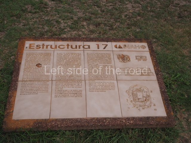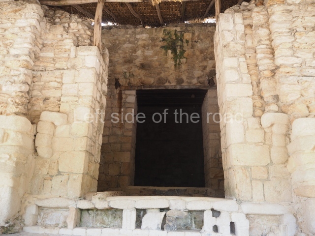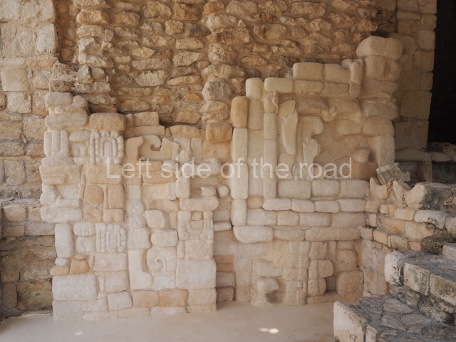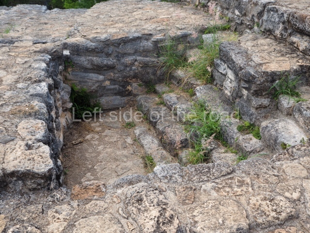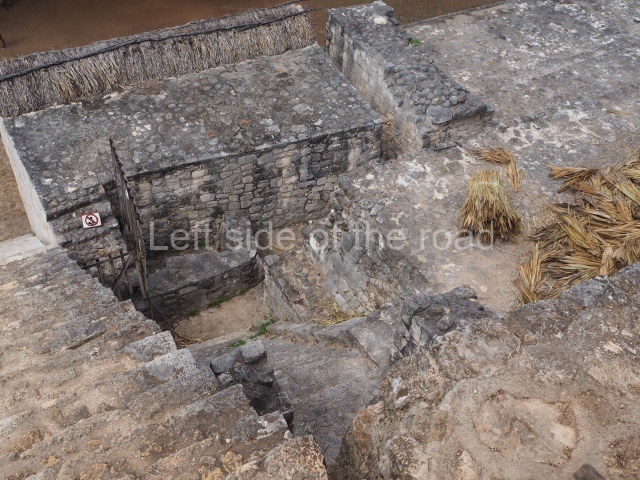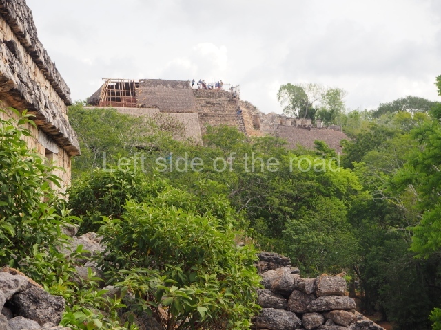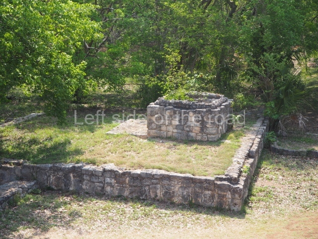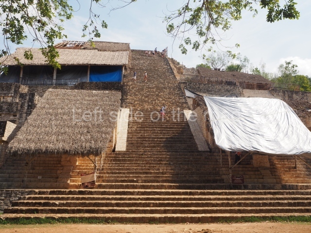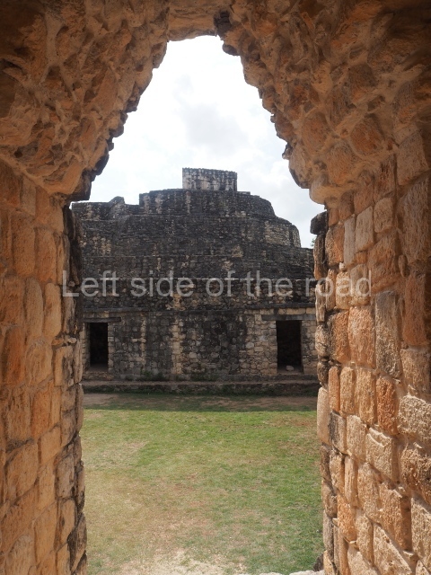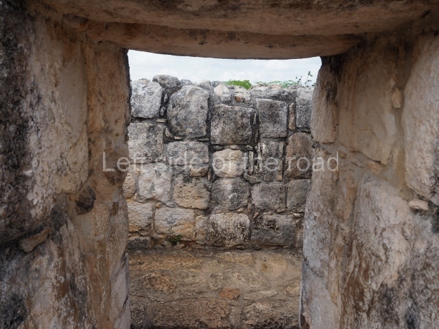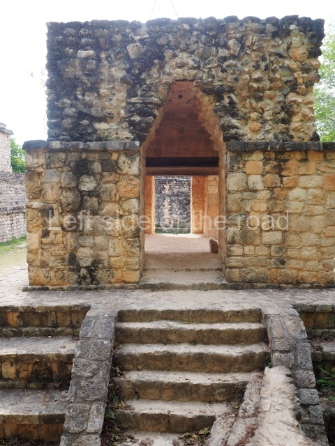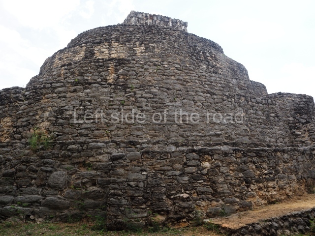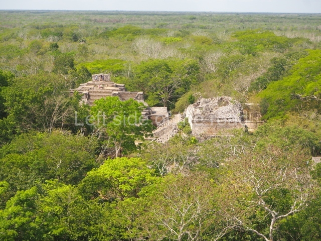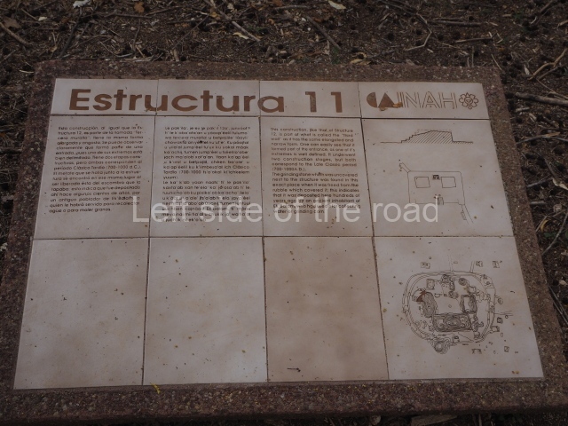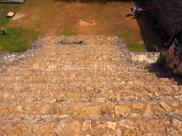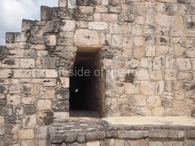 The walled enclosure occupies 1.25 sq km and is surrounded by two concentric stone walls – called Exterior Wall and Interior Wall – relatively low in height but originally with high wooden palisades. There is a Third Wall which connects some of the main buildings and during pre-Hispanic times provided greater protection to the royal seat. Five causeways or sacbeob once departed from the Exterior Wall to other parts of the city, and one of them even appears to have led directly to another city. Two of these causeways are situated on the south side and the remaining ones at the other cardinal points and the ramp of Structure 8 furnished an important offering of more than 90 vessels and numerous burnt stone balls. Structure 9 contains a partly concealed room with a stucco-modelled frieze painted in blue, black, green and red; the scene depicts an important personage in profile, seated on a throne and holding a bird in his hand. During the excavations, the ring of Structure 8 was found but unfortunately the ring from Structure 9 was stolen many years ago. The last stage of the Ball Court was built in AD 841, as evidenced by a painted capstone bearing this date and the name Tz’ihb’am Tuun.