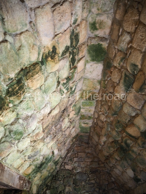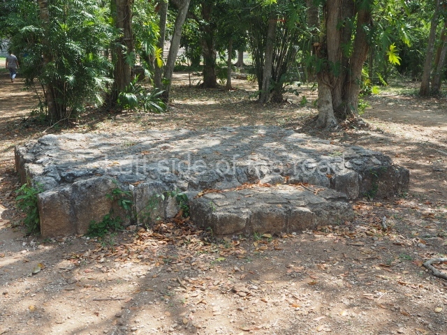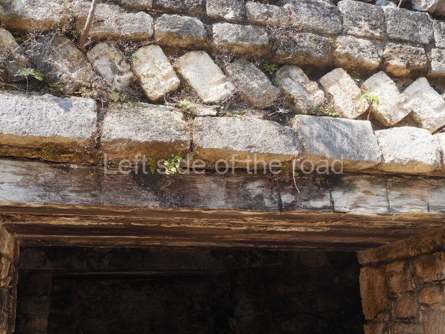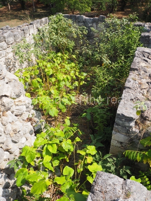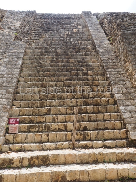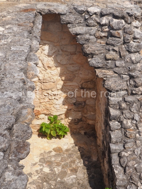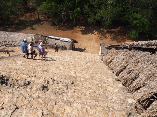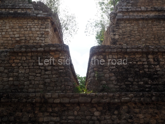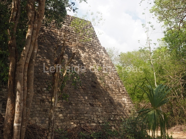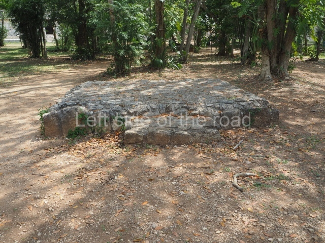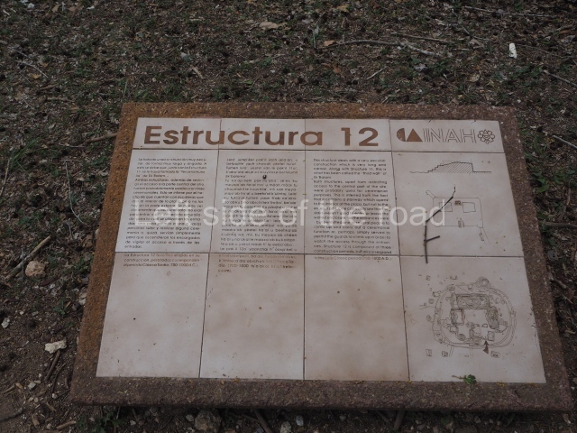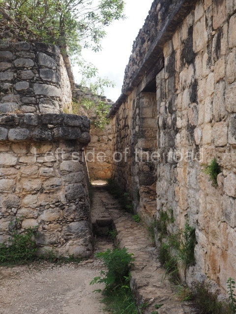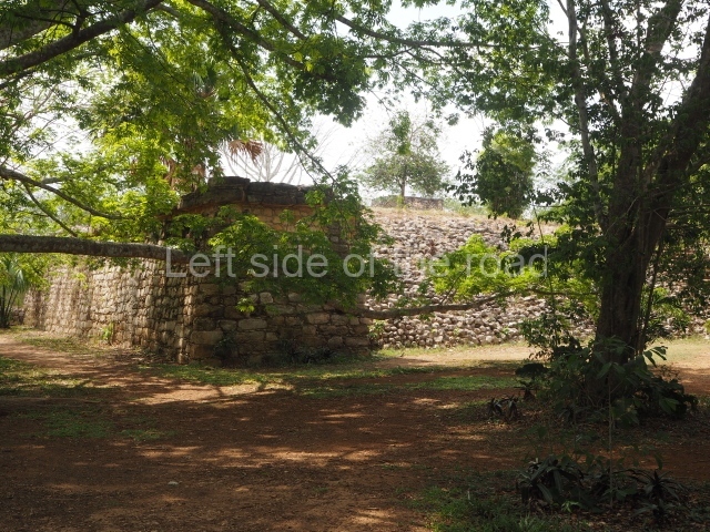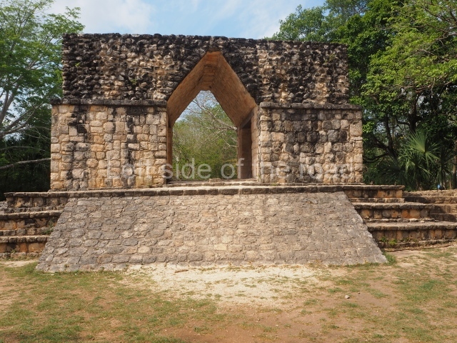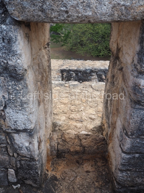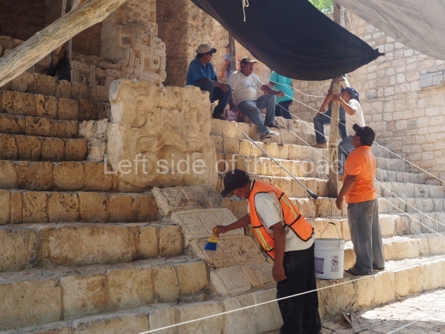 The walled enclosure occupies 1.25 sq km and is surrounded by two concentric stone walls – called Exterior Wall and Interior Wall – relatively low in height but originally with high wooden palisades. There is a Third Wall which connects some of the main buildings and during pre-Hispanic times provided greater protection to the royal seat. Five causeways or sacbeob once departed from the Exterior Wall to other parts of the city, and one of them even appears to have led directly to another city. Two of these causeways are situated on the south side and the remaining ones at the other cardinal points and the ramp of Structure 8 furnished an important offering of more than 90 vessels and numerous burnt stone balls. Structure 9 contains a partly concealed room with a stucco-modelled frieze painted in blue, black, green and red; the scene depicts an important personage in profile, seated on a throne and holding a bird in his hand. During the excavations, the ring of Structure 8 was found but unfortunately the ring from Structure 9 was stolen many years ago. The last stage of the Ball Court was built in AD 841, as evidenced by a painted capstone bearing this date and the name Tz’ihb’am Tuun.
