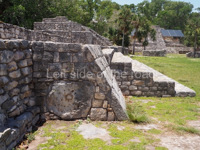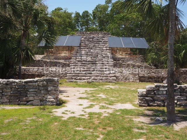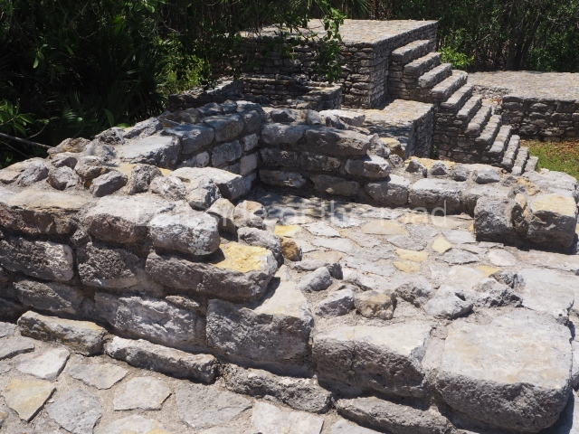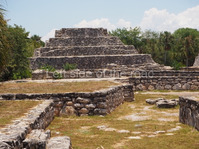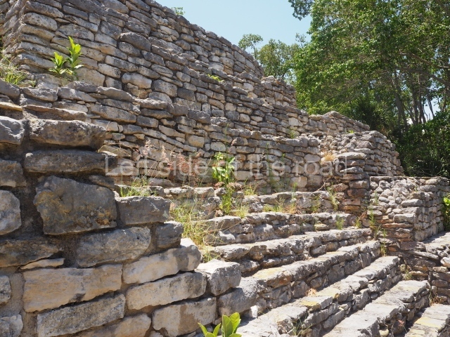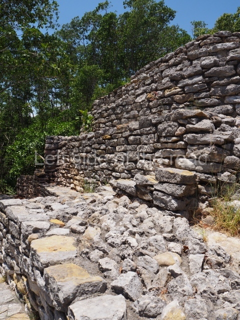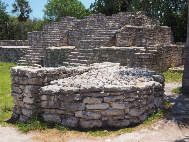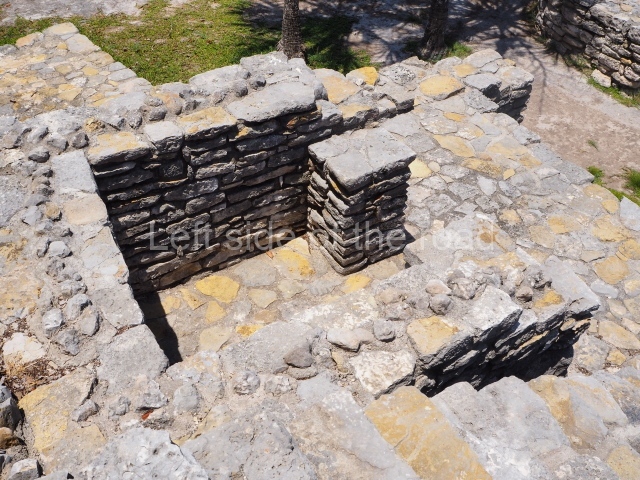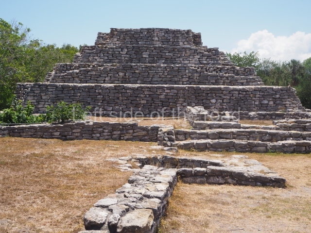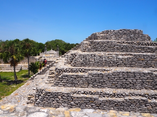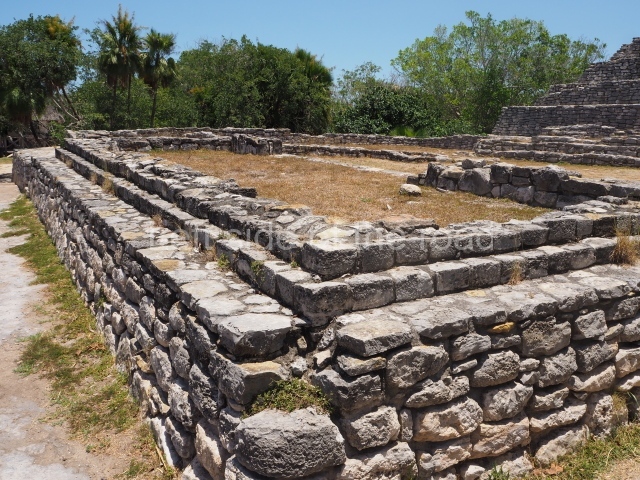 From the architectural point of view, the most notable buildings at Xcambo display a mixture of elements that are characteristic of at least two styles from the Classic period: the Peten and Megalithic or Izamaleno style, which characterises the Early Classic constructions in northern Yucatan (stepped pyramids, rounded corners, inset corners, sloping platforms, small decorative stairways, thick stucco floors and painted stucco masks). At this site it is also possible to see architecture based on coarse rectangular blocks and rough stone slabs with dry or mortar joints, covered with thick stucco floors to hide the imperfections in the walls.