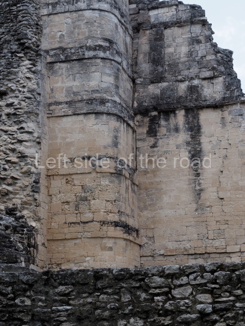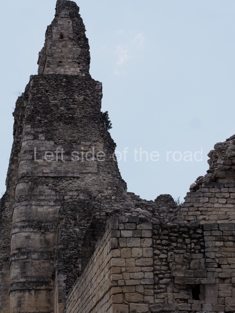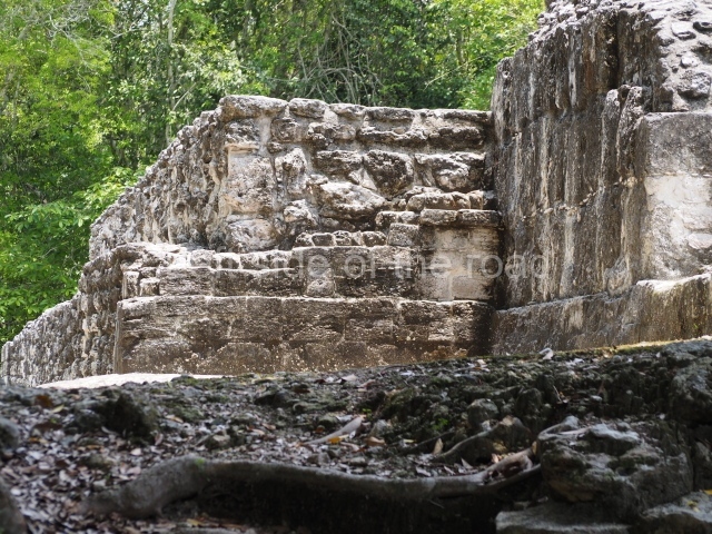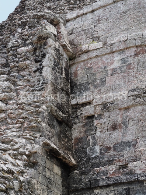 Structure III is similar to the previous one but has no pyramid. Situated on a solid masonry platform are four rooms comprising spacious benches; the centre of one of these is decorated with various small drums that are reminiscent of Puuc elements. The rooms were originally covered by corbel vaults and have been identified as the dwelling spaces of high-ranking figures in the ancient city. A little further west lies another mound, unexcavated, and on its north side another platform supports Structure II, a palatial complex with six rooms around a central courtyard. The access stairway is situated on the east side and has broad balustrades. The far west end of the archaeological area is occupied by the monumental Structure I, which stands atop a 60×30 m platform. The most outstanding elements of this construction are the three towers, two at the sides and one in the middle of the rear facade. There are 12 rooms distributed according to the cardinal points, most of them containing benches. Six rooms arranged in pairs can be accessed from the east side. The three facades have been lost and only parts of the stacks of stylised masks flanking the entrances can still be seen today. At the north and south ends of the building, behind each of the lateral towers, are two rooms. The other two rooms face west and are accessed from the west, being situated on both sides of the central tower. With their rounded corners and non-functional stairways, the towers are typical of Rio Bec architecture. The steps used to be adorned by three giant stone mosaic masks of Itzamnaaj, and each of the towers culminated in a false temple with a roof comb. The facade of these shrines repeated the ubiquitous image of the principal deity, with an open mouth surrounded by curved teeth, ear ornaments, a nose ring, volutes and associated symbols. The north and south towers must have once stood approximately 18 m high, and the central one, much better preserved, is 23 m high. The south tower has an interior staircase rising to a somewhat higher point than the roofs of the rooms.