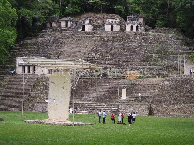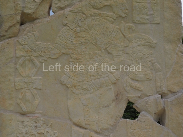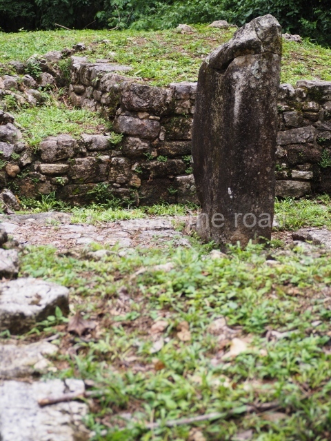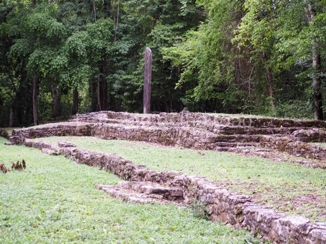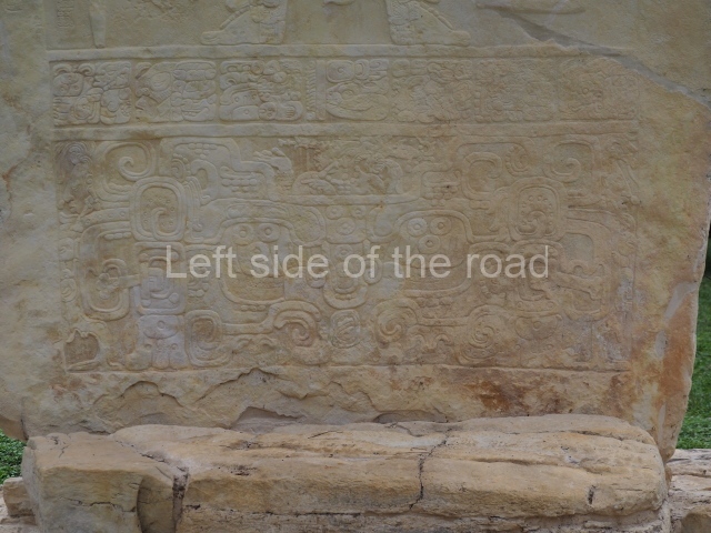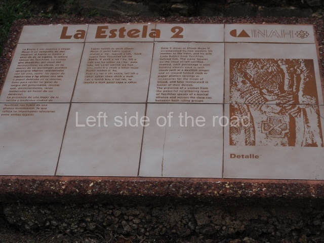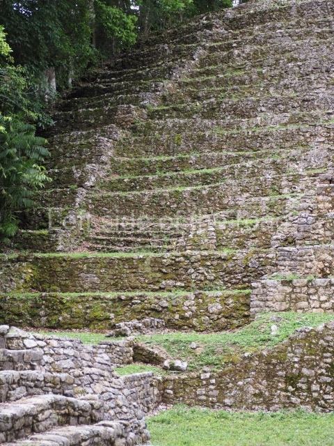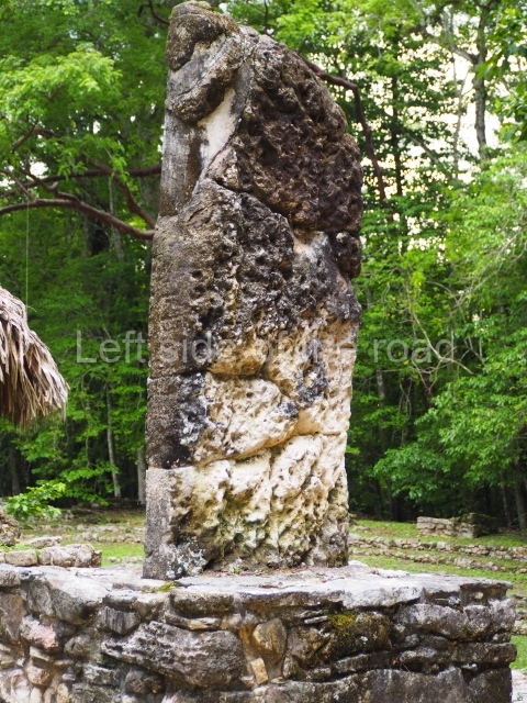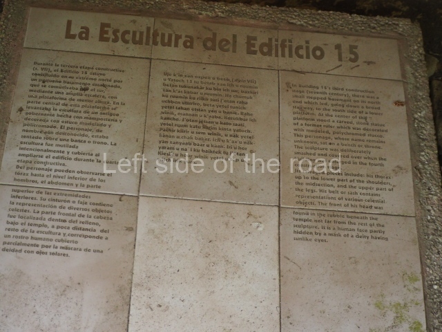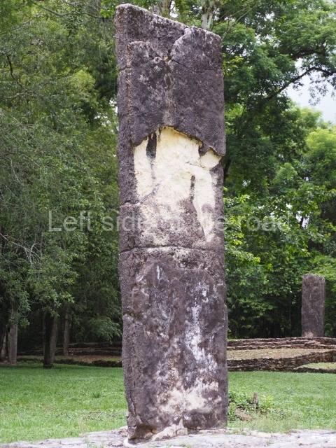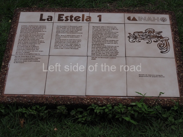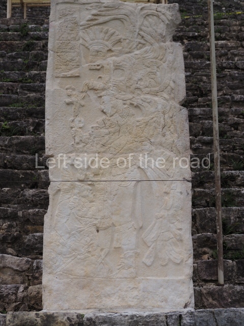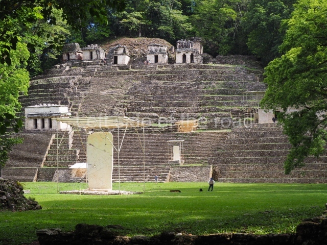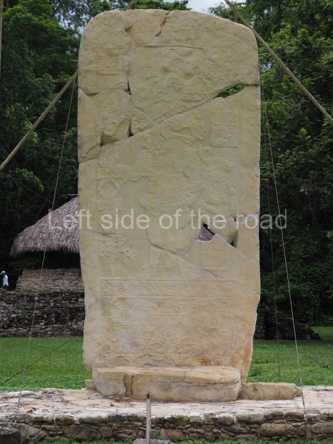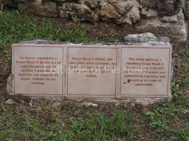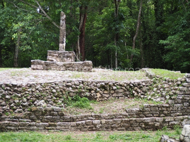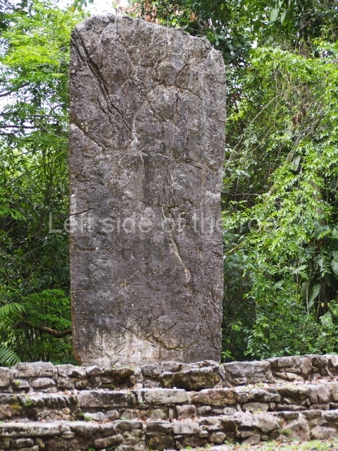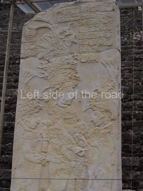 The Acropolis hill, which runs along the south side of the plaza, is covered by terraces and buildings. At the foot of it, almost at the centre of the plaza, stands the magnificent Stela 1, which is 5,06 m high, 2.6 m wide and 18-20 cm thick. Its carved face overlooks the Acropolis and depicts a richly garbed Chaan Muan II with a tall headdress. In his right hand, he holds the ceremonial sceptre; in his left, a shield with the face of the Jaguar god of the underworld. Under his feet is a band inscribed with the names of his parents and, next to his left leg, his own name.