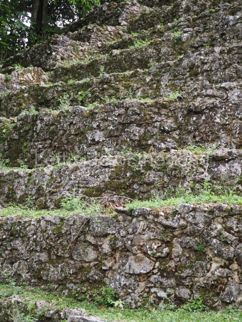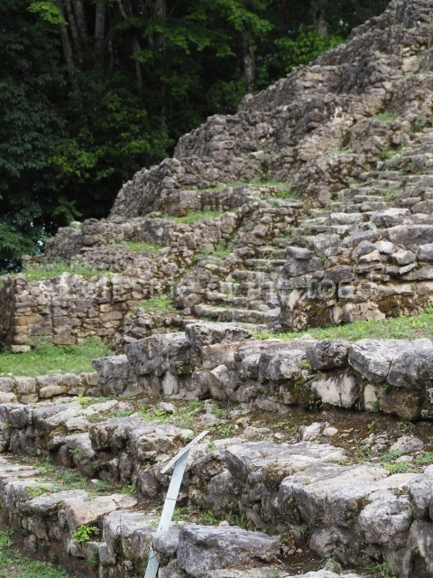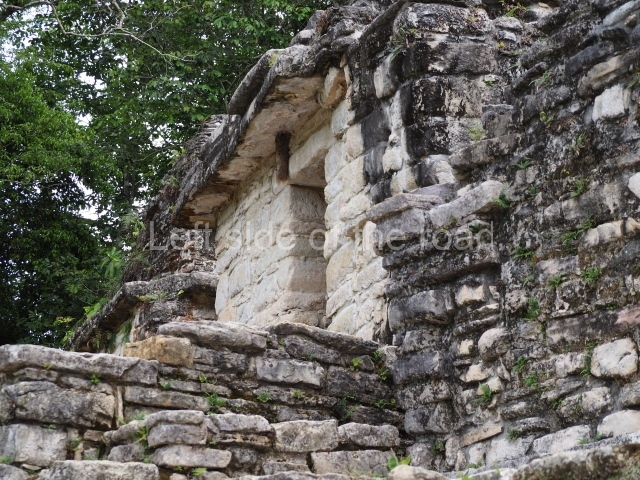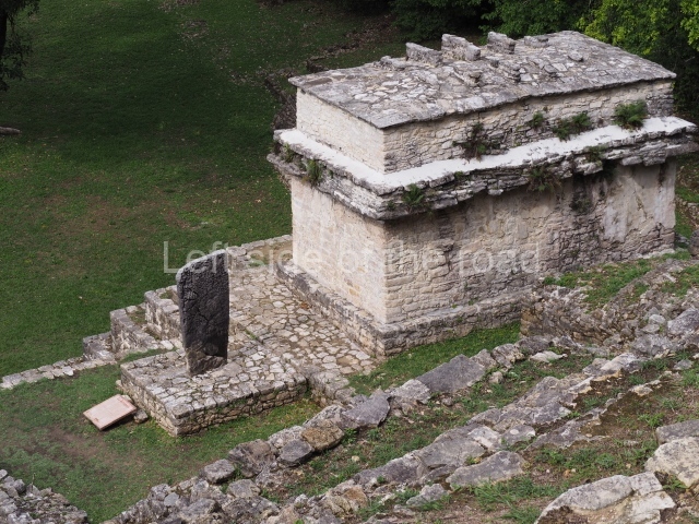 Situated at the foot of a natural hill modified by terraces, this group stands 46 m high. It displays two horizontal axes on different levels, which provide the basis for two groups of buildings. On the lower platform, situated approximately 15 m from the ground level of the plaza, are three buildings: the one on the right is the Temple of the Murals, in the middle are the ruins of Building 2, and on the left is Building 3. The main access to this level is via a monumental stairway, situated in the middle of the group. This comprises two flights with an intermediate landing on which stand Stela 2, to the left, and Stela 3, to the right. The former represents Chaan Muan II accompanied by his wife and his mother in a bloodletting sacrifice; the second stela shows the same dignitary with a prisoner. At the top of this first section of the stairway, on the right-hand side, is the Temple of the Murals, which has three doorways leading to three separate rooms decorated with the famous wall paintings; the doorways have carved lintels depicting the capture of enemy chiefs by two Bonampak rulers and a Yaxchilan ruler, respectively.
