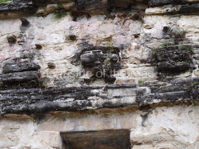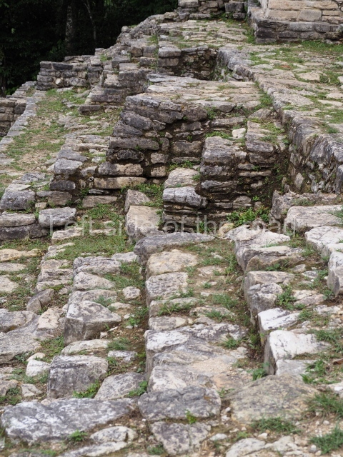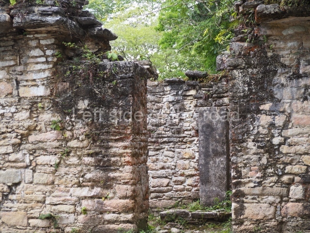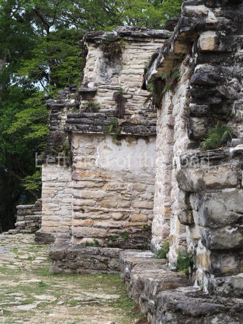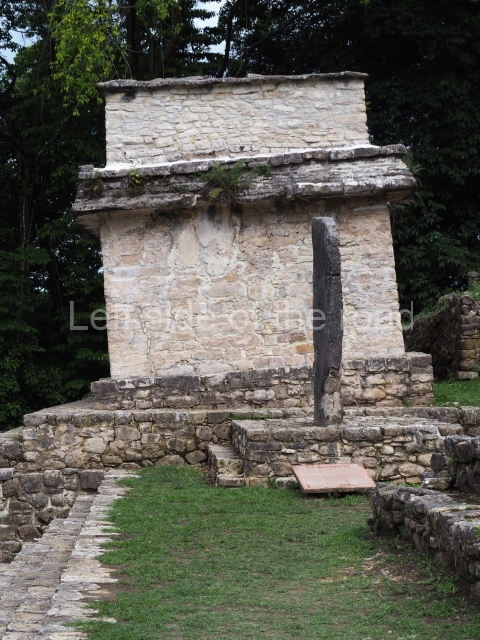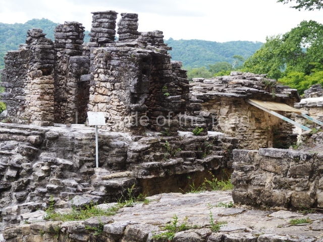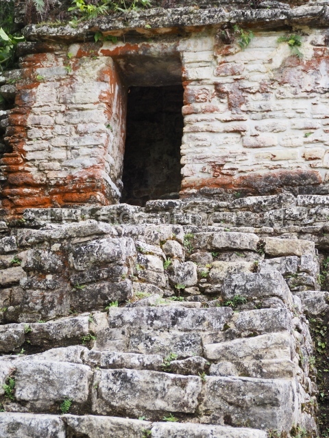 Situated at the far left of this first terrace is Building 3, which displays three doorways on its main facade and a stairway leading down to the plaza. Between this and the remains of Building 2 is the stairway leading up to the temples at the top, identified from left to right as Buildings 8, 7, 6, 5 and 4. All of them contain a single chamber and a single access; the exception is Building 4, which has two. All of them are very small and contain a cylindrical altar. Building 6 is the exception in this case and displays instead a carved lintel with the bust of Chaan Muan I, dated 603. Between buildings 5 and 6 is an interrupted stairway leading to the remains of Structure 19, which has a niche and a lintel. Situated next to this structure, behind Building 4, is a small plaza with Building 9 and its platform. The building facade faces west and contains a single doorway leading to a chamber in which there is an uncarved stela.
