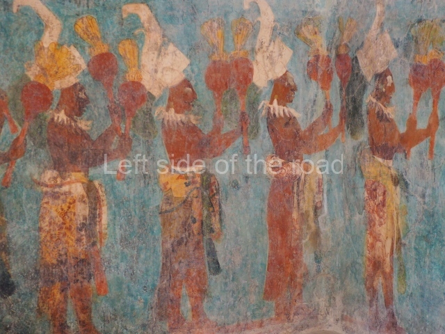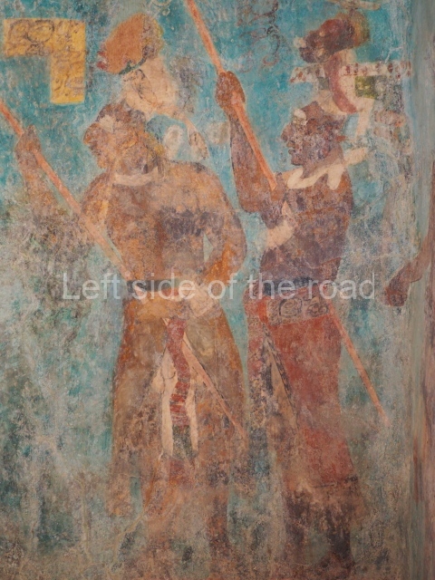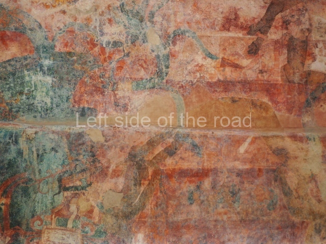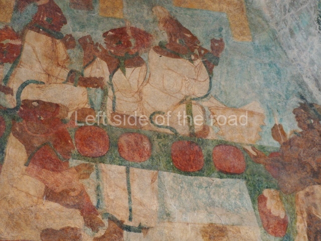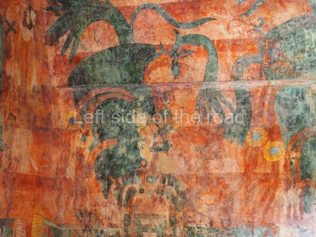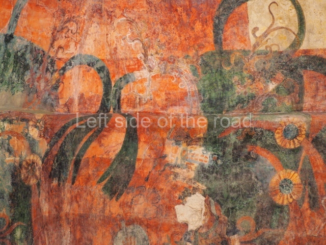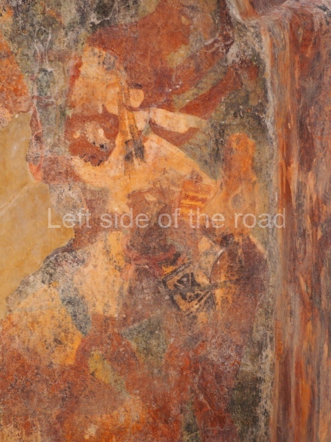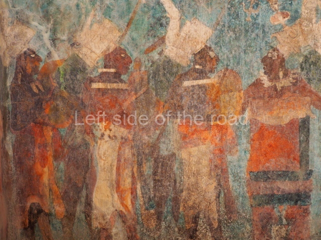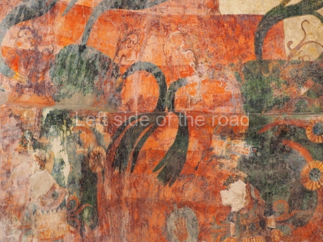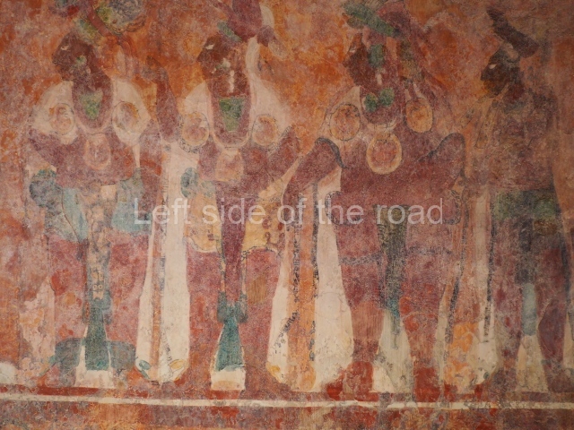 The walls of the three rooms are covered with magnificently executed paintings in deep colours. The event depicted is associated with the designation of Chaan Muan’s son as heir to the throne and to other events that took place over a period of two years. The correct order for interpreting the murals has been a topic of some debate, although the chronological order of the events represented suggests Room 1 followed by Room 2, followed by Room 3. Small benches occupy most of the interior space and the murals were probably designed to be viewed while seated on these benches.