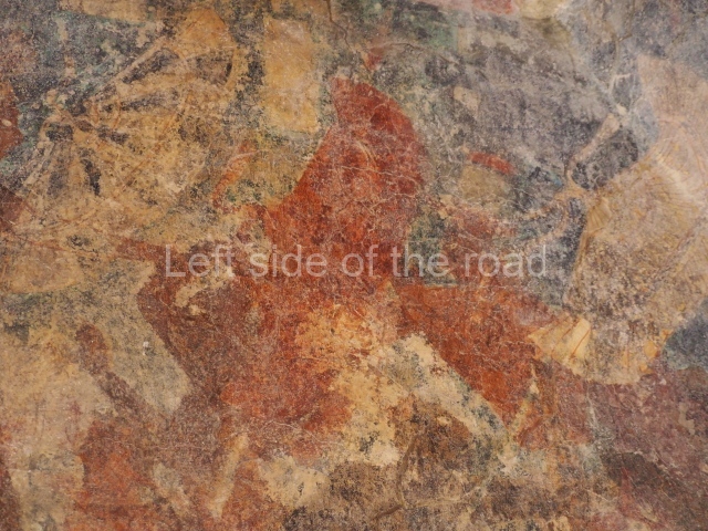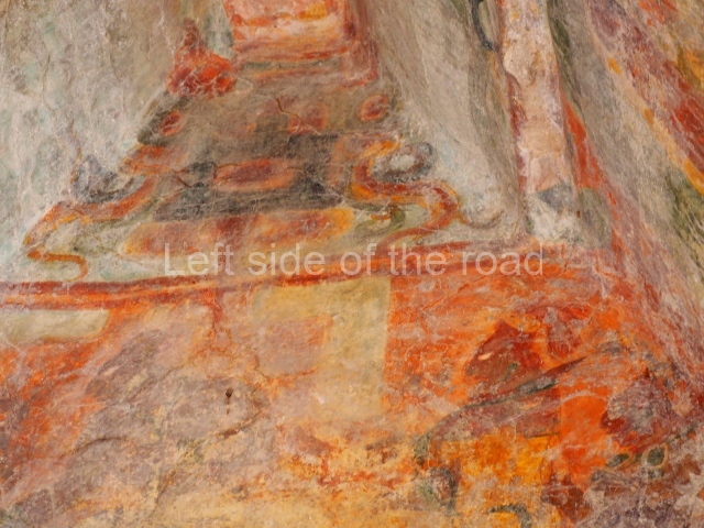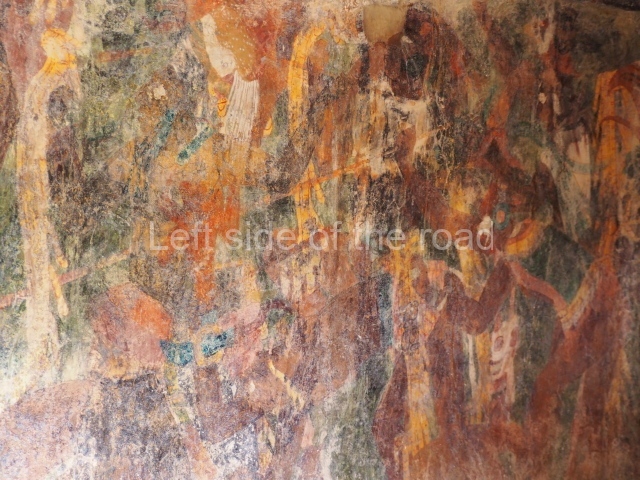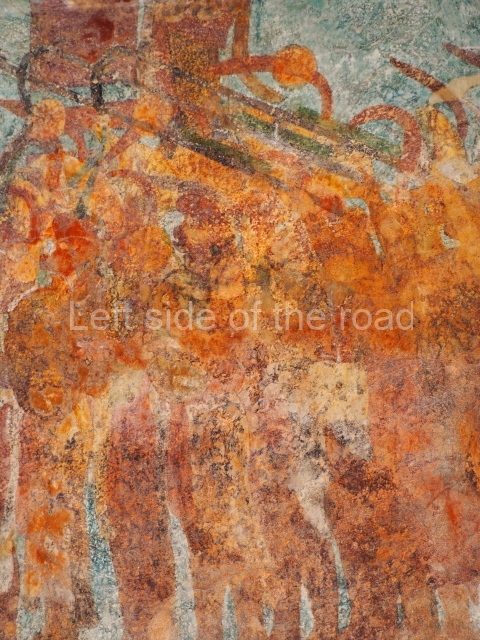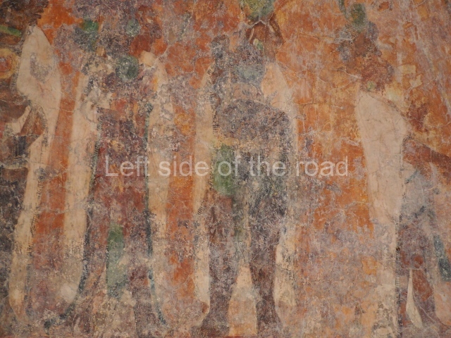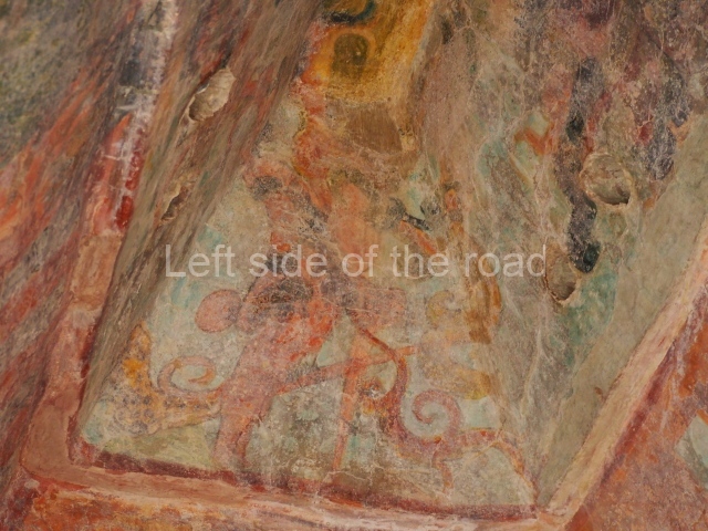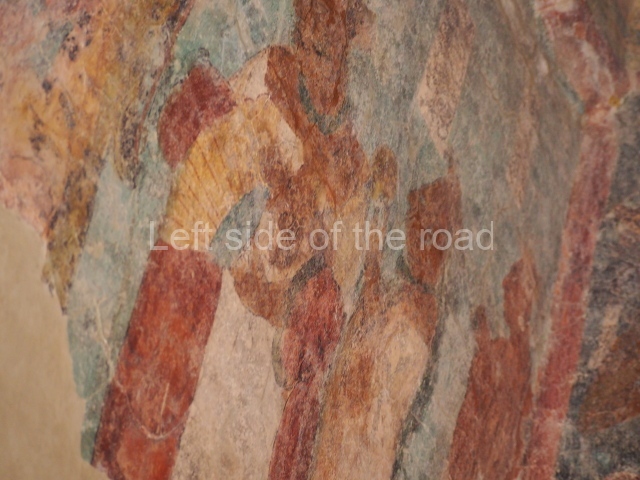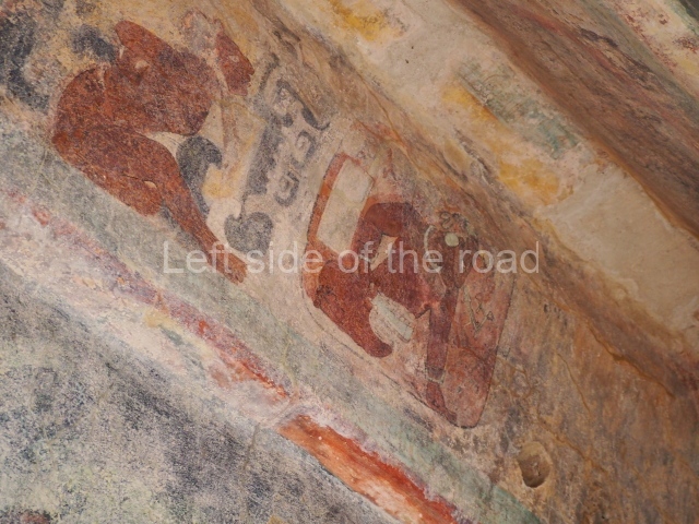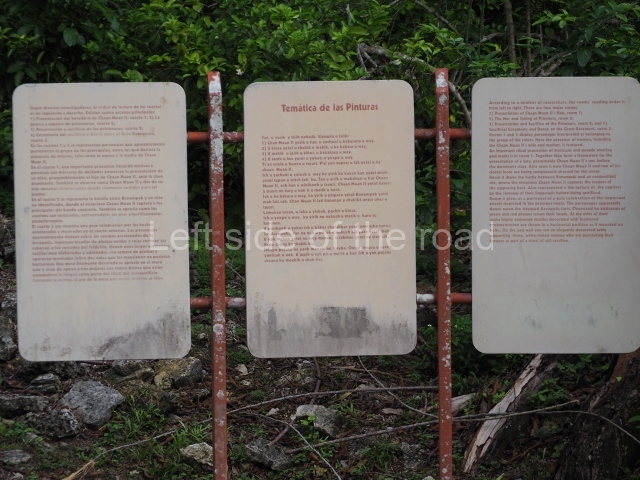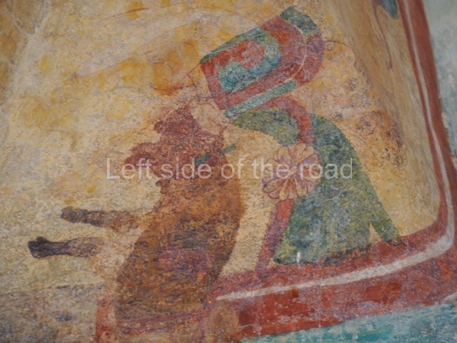 The walls of the three rooms are covered with magnificently executed paintings in deep colours. The event depicted is associated with the designation of Chaan Muan’s son as heir to the throne and to other events that took place over a period of two years. The correct order for interpreting the murals has been a topic of some debate, although the chronological order of the events represented suggests Room 1 followed by Room 2, followed by Room 3. Small benches occupy most of the interior space and the murals were probably designed to be viewed while seated on these benches.