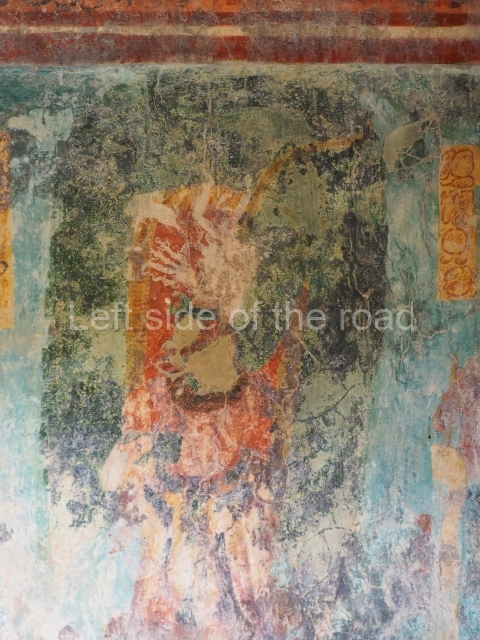 The murals in Room 3 are less well preserved, although many of the original designs can still be discerned. Again, they clearly represent a grand ceremony, probably the culmination of the two previous scenes, this composition is divided into two sections: the first shows a group of elaborately garbed individuals resting on a stepped pyramid while a group of musicians and dancers parade by; the second section shows a scene in a different place, probably inside a palace, and again depicts Chaan Muan, his family and a group of courtiers. In this final section, the royal family is engaged in a bloodletting ritual, thus completing the formal presentation of the royal heir.