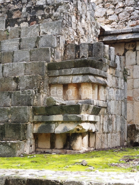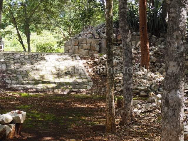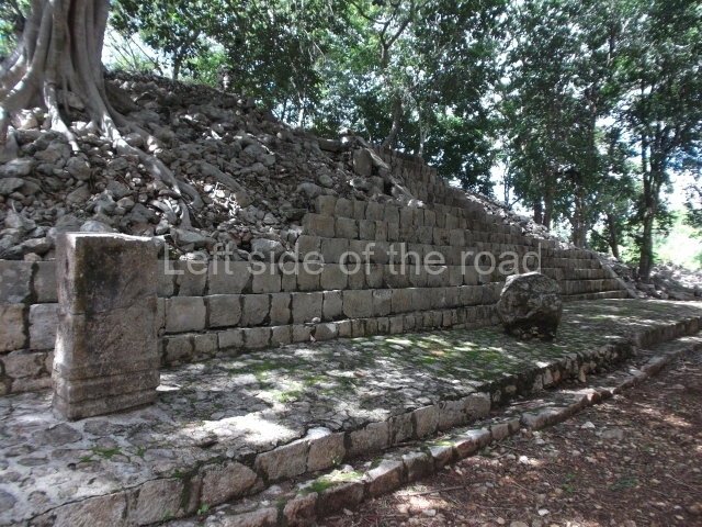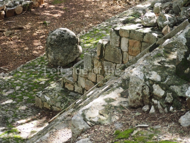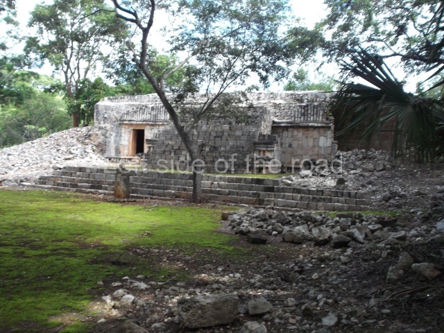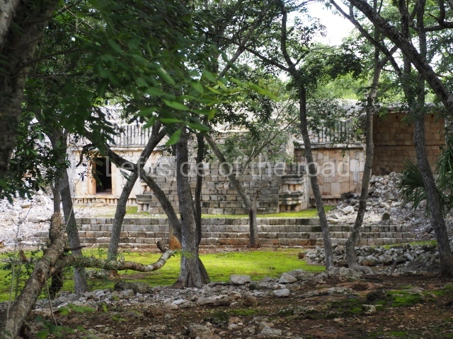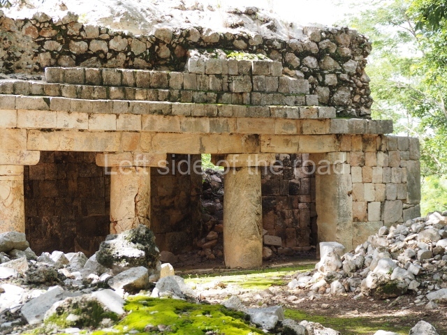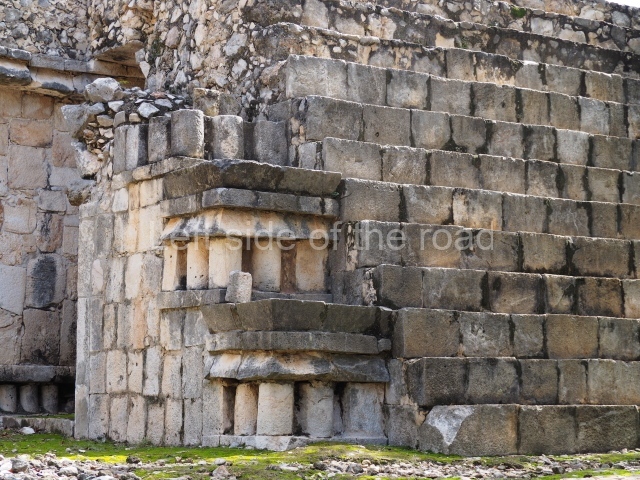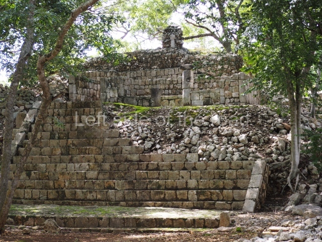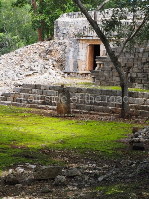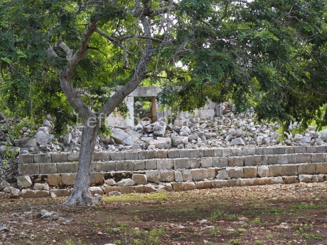 This is accessed via the north-west corner, coming from the previous courtyard. In the middle stands a large but low platform, quadrangular in shape, which had small stairways on two sides. Just south of the platform, two stairways lead to two separate temples built on older constructions from the Early Puuc phase. These have several entrances formed by columns, which now serve to support the temples. The stairway in the south-west section has balustrades and the temple at the top was accessed by a tripartite entrance formed by columns with several drums. Inside, it is still possible to see a small rectangular altar in the middle of the space. In the south-east section are two altars at the foot of a stairway. One adopts the form of a rectangular limestone prism decorated with criss-crossed lines to indicate a woven mat, the pre-Hispanic symbol for political authority. The other altar was a large colonnette, also made of limestone, but due to erosion and neglect it now looks like a large sphere.