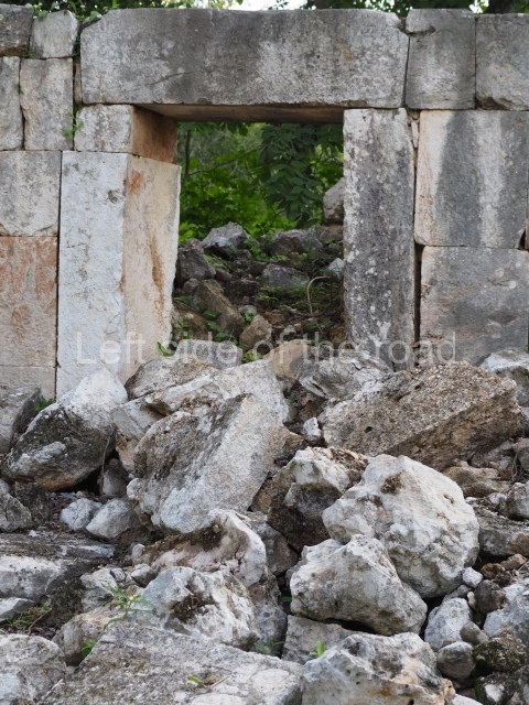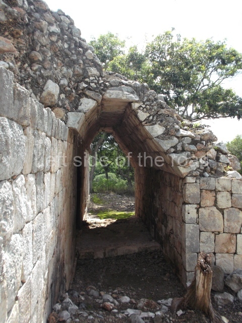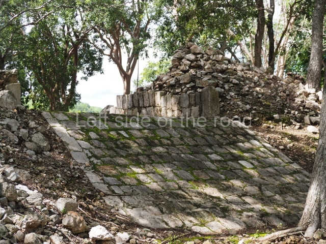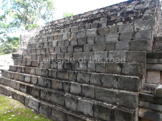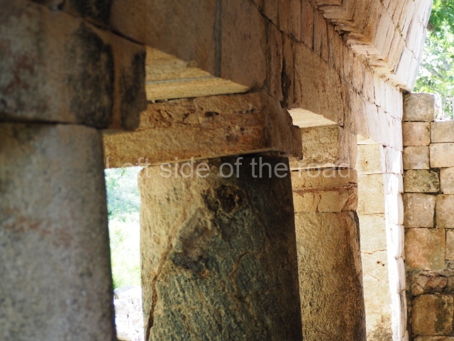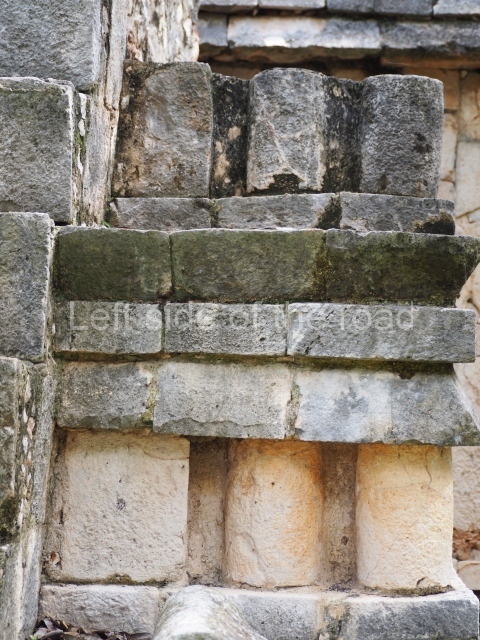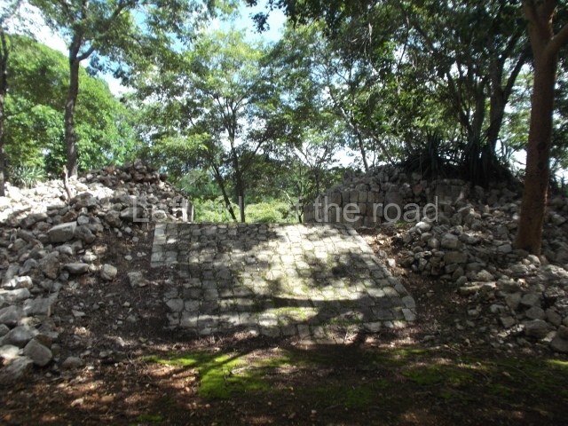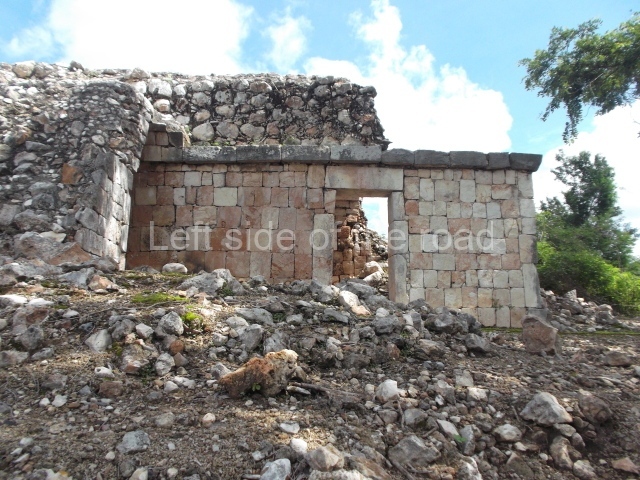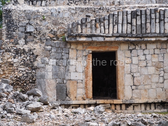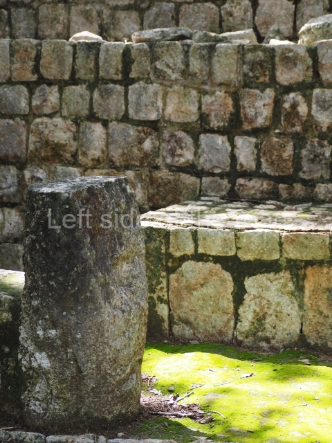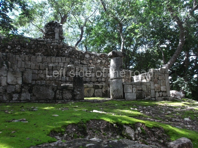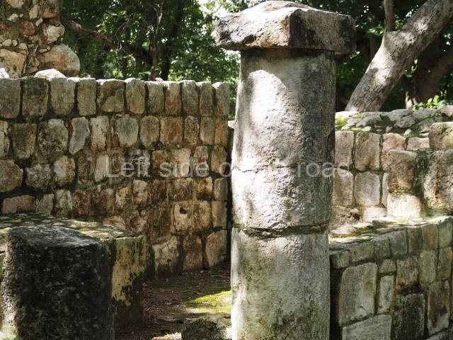 This is accessed via the north-west corner, coming from the previous courtyard. In the middle stands a large but low platform, quadrangular in shape, which had small stairways on two sides. Just south of the platform, two stairways lead to two separate temples built on older constructions from the Early Puuc phase. These have several entrances formed by columns, which now serve to support the temples. The stairway in the south-west section has balustrades and the temple at the top was accessed by a tripartite entrance formed by columns with several drums. Inside, it is still possible to see a small rectangular altar in the middle of the space. In the south-east section are two altars at the foot of a stairway. One adopts the form of a rectangular limestone prism decorated with criss-crossed lines to indicate a woven mat, the pre-Hispanic symbol for political authority. The other altar was a large colonnette, also made of limestone, but due to erosion and neglect it now looks like a large sphere.
