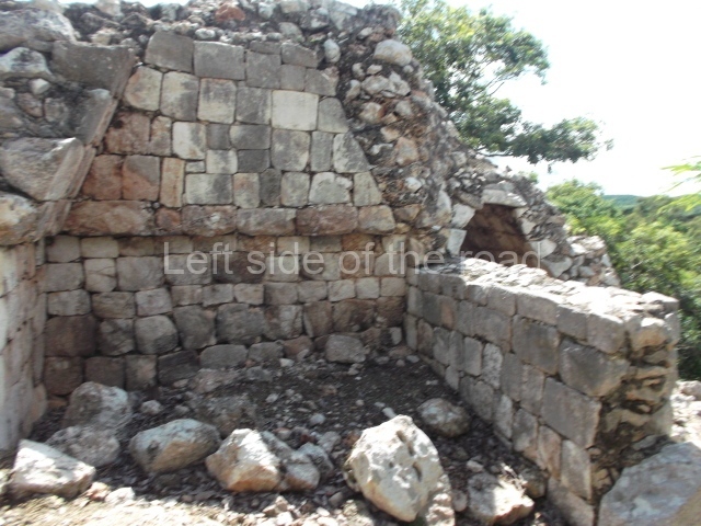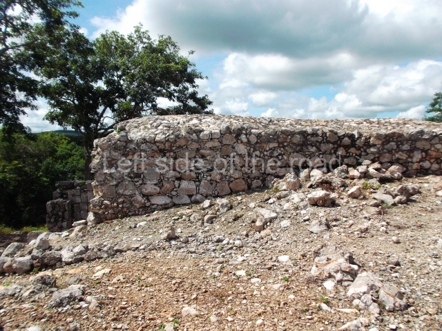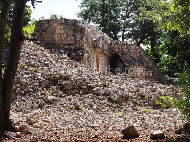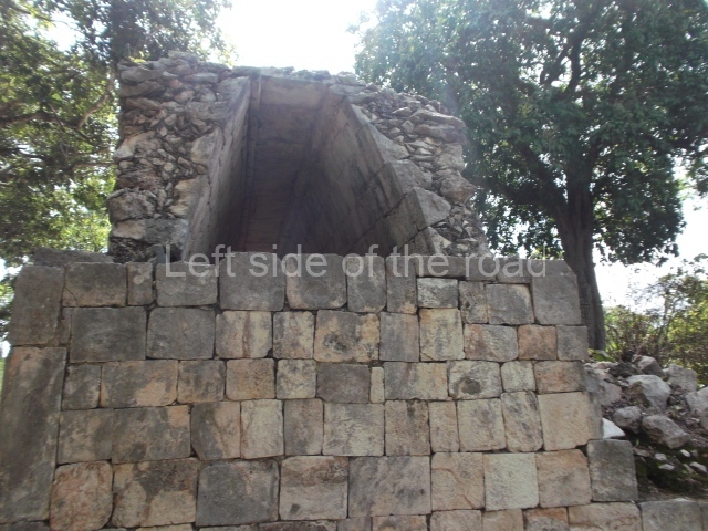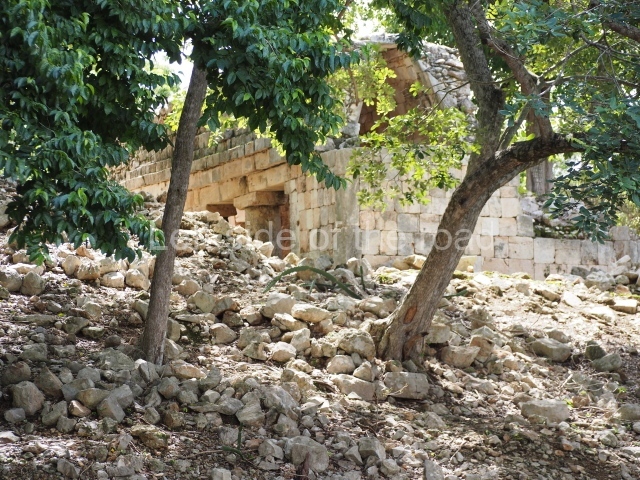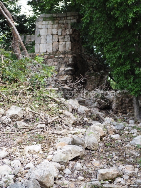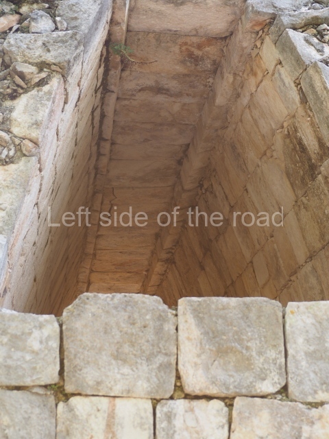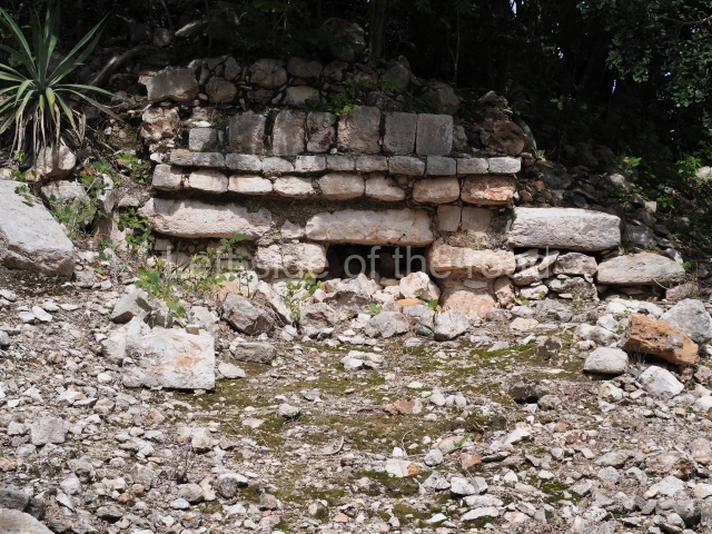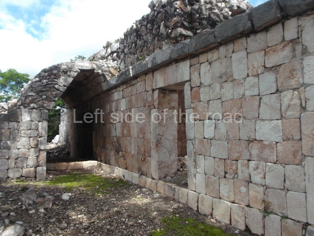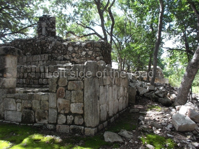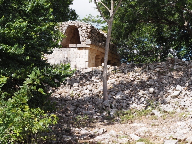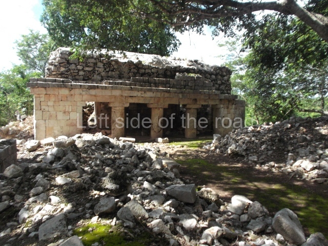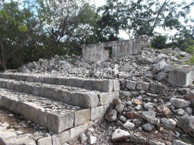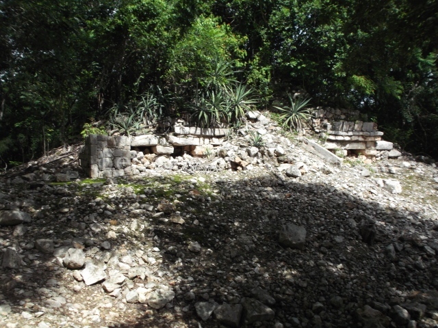 The first building that can be visited is situated at the top of a natural elevation some 15 m above ground level and consists of three south-facing rooms; the central one is connected to another interior space and its facade is partly covered by a projecting stairway leading to the roof or top floor. The northern section bounds a plaza at the top of the hill, at the centre of which the Maya built a cistern. Here, a new concrete ring protects the mouth of the chultun and prevents accidents. Originally, there was a carved stone ring with four perforations to channel the water.