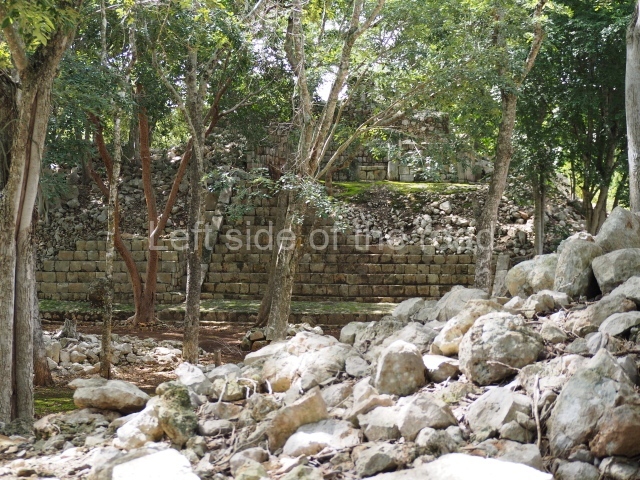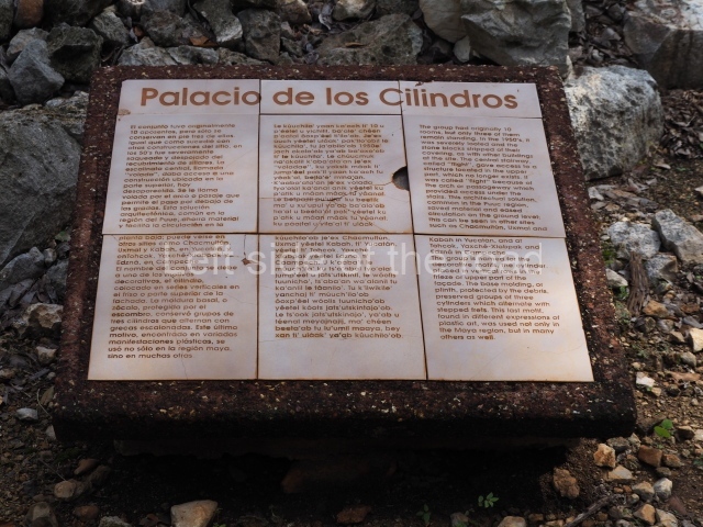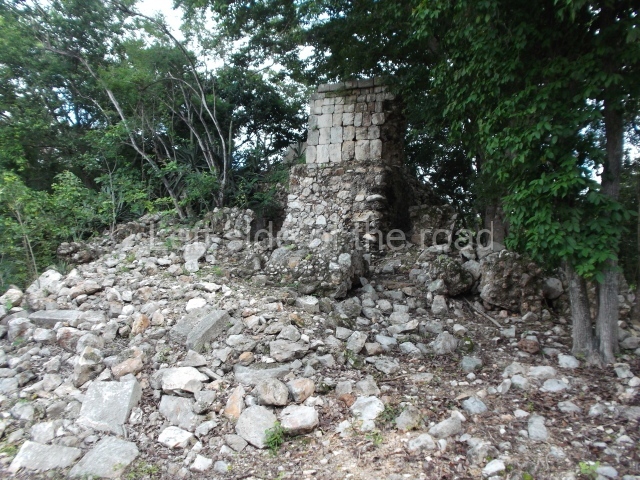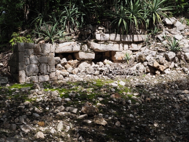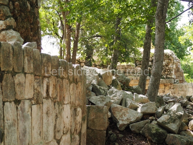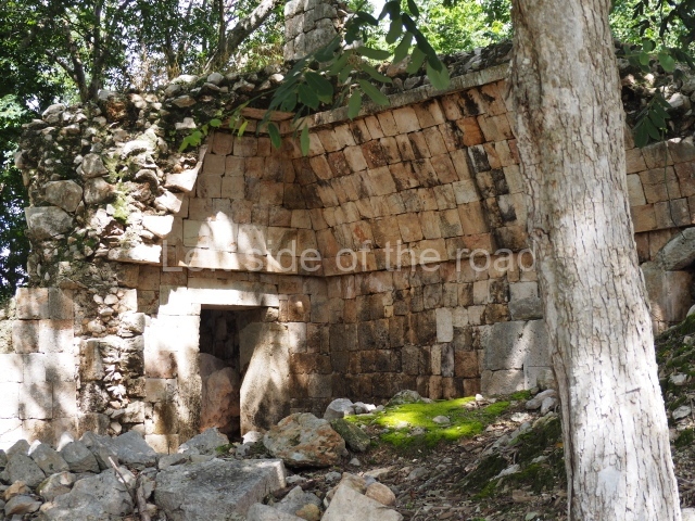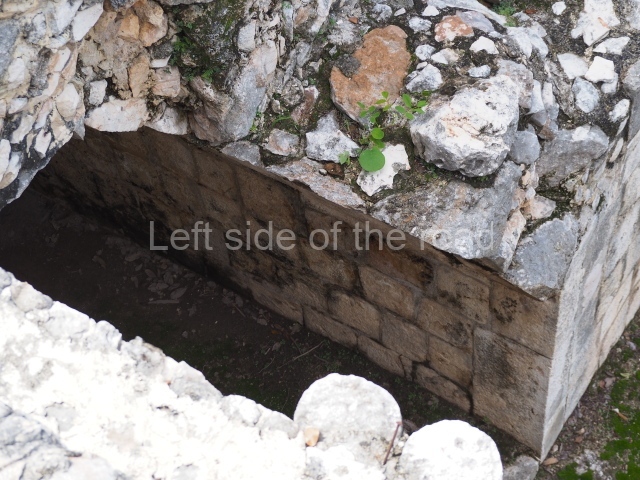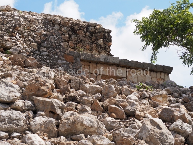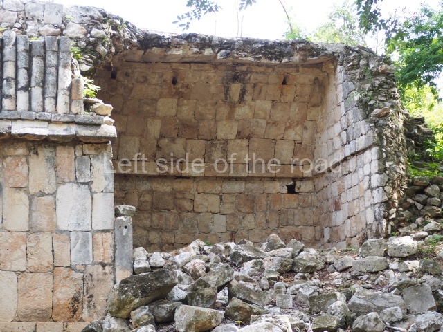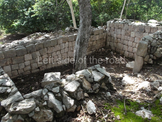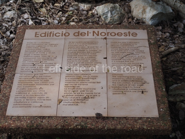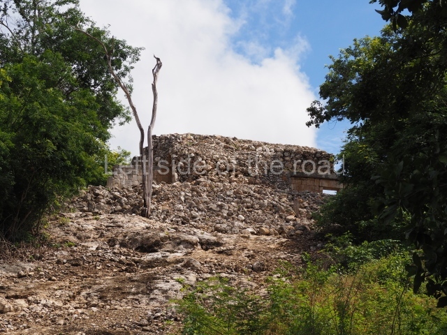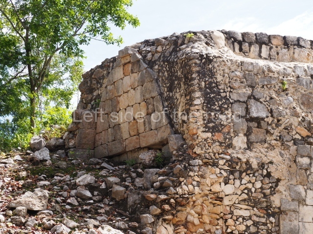 The first building that can be visited is situated at the top of a natural elevation some 15 m above ground level and consists of three south-facing rooms; the central one is connected to another interior space and its facade is partly covered by a projecting stairway leading to the roof or top floor. The northern section bounds a plaza at the top of the hill, at the centre of which the Maya built a cistern. Here, a new concrete ring protects the mouth of the chultun and prevents accidents. Originally, there was a carved stone ring with four perforations to channel the water.