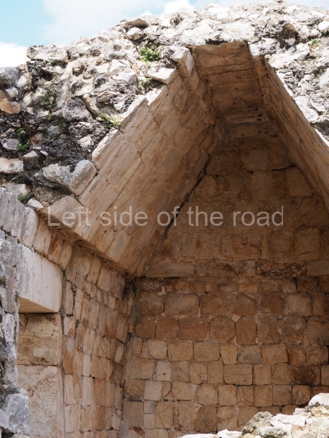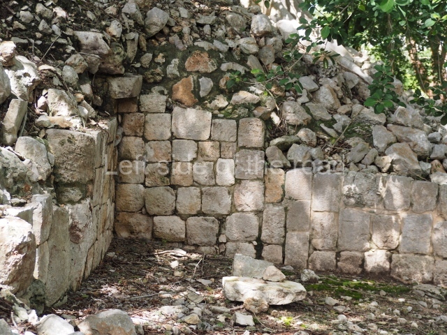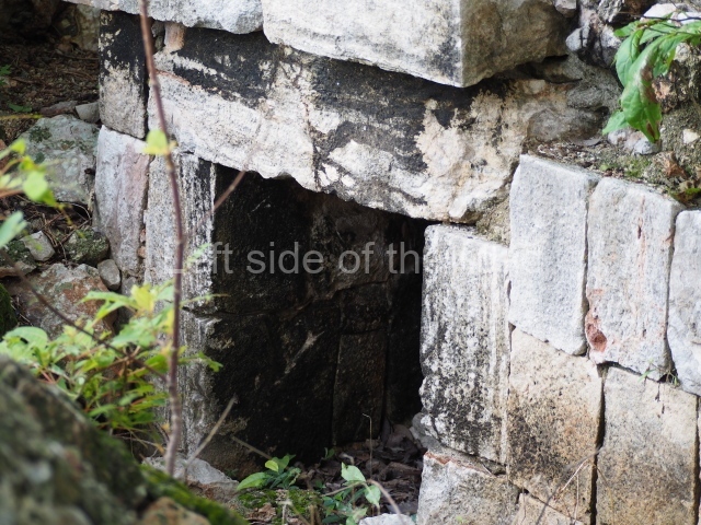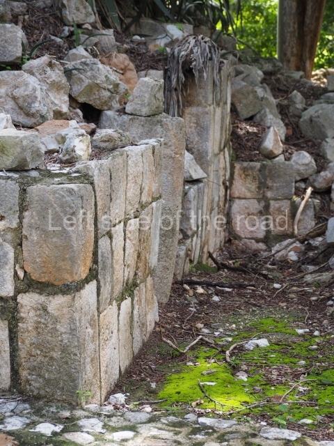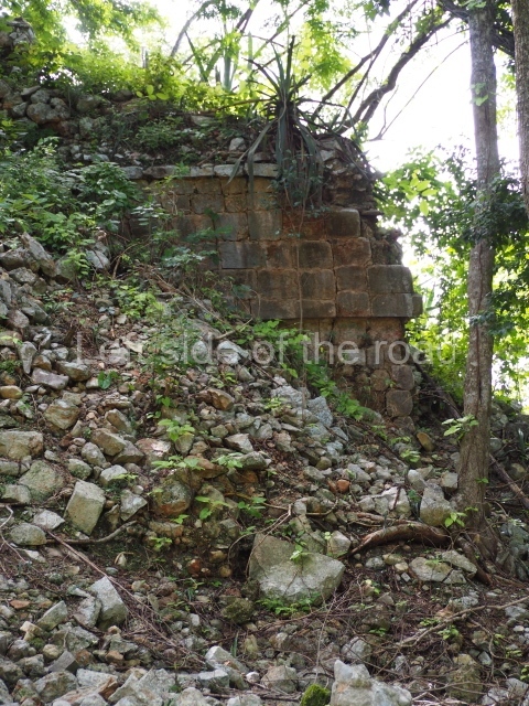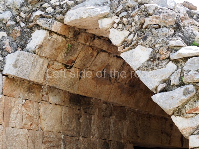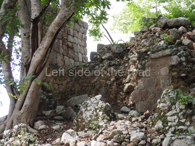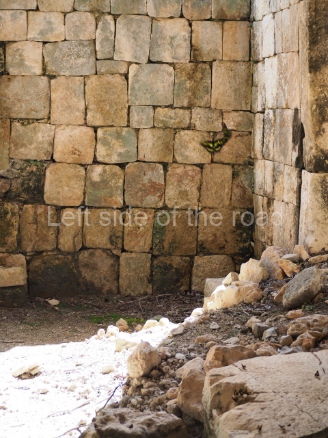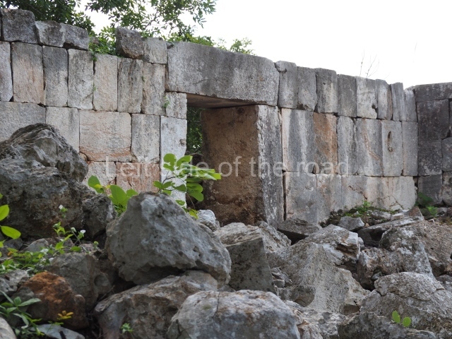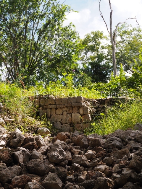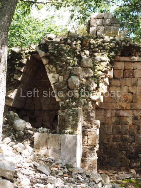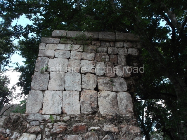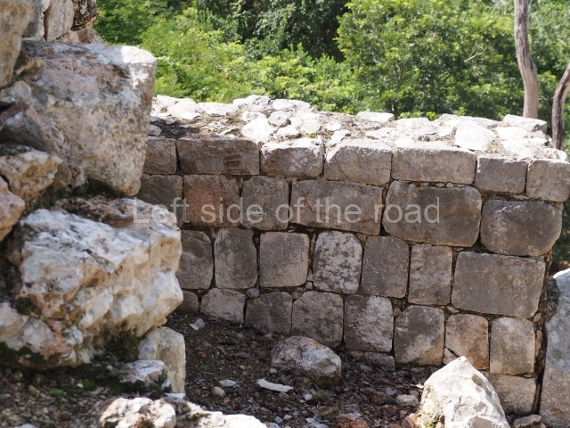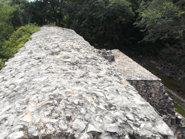 The first building that can be visited is situated at the top of a natural elevation some 15 m above ground level and consists of three south-facing rooms; the central one is connected to another interior space and its facade is partly covered by a projecting stairway leading to the roof or top floor. The northern section bounds a plaza at the top of the hill, at the centre of which the Maya built a cistern. Here, a new concrete ring protects the mouth of the chultun and prevents accidents. Originally, there was a carved stone ring with four perforations to channel the water.