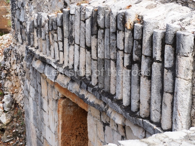 This monumental building once contained ten rooms, each with their own entrance. The name of the palace is conventional and suggests that it was the residence of the Xcalumkm rulers. It stands on a large rectangular platform and its south facade has a stairway leading to the second level. At the top and bottom of the stairway, the corners are decorated with three smooth colonnettes crowned by a triple moulding. The impression is of small constructions that summarise the Classic Puuc architecture. In front of the building and the platform stands a monolithic column of a later date. It probably formed part of another monumental construction, but during the Postclassic it must have been used either as an altar or a place for depositing offerings. Behind the stairway a vaulted passage facilitates the circulation between the rooms on this side. The building takes its name from the long colonnettes that decorate the frieze or upper section of the wall. Due to various episodes of plundering, only three of the original rooms are still standing today. The one on the west side contains a stone sculpture that was rescued near the site. It represents a seated aged female (xnuk, in Yucatec Maya), a mythical figure that appears in the legends of rural communities and who is said to grant special favours in exchange for children or human lives.