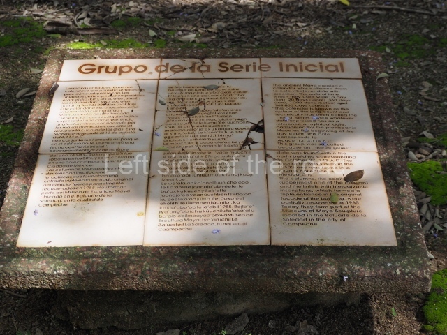 Situated south of the previous space, this is composed of a platform 3 m high on which four monumental buildings were erected, although nowadays only the north and south ones are still standing. The south building has four entrances formed by three columns. Its facade displays carefully cut blocks of limestone which were once decorated with a variety of painted stucco motifs. Inside, it has an elegant and very high corbel-vault ceiling made out of blocks specially cut to fit specific points. The group takes its name from the north building because this construction once boasted a long hieroglyphic inscription containing an ‘initial series’, that is, the appropriate information to match the Maya date with our calendar. The Maya date in question is ‘9.15.12.6.9. 7 Muluc 1 or 2 Kan kin’, which is equivalent to 27 October AD 743. Unfortunately, the inscription was stolen and nowadays graces a private collection in Mexico City. The central section of the rear wall of the north building is recessed, this being the place where the hieroglyphic inscription was found.