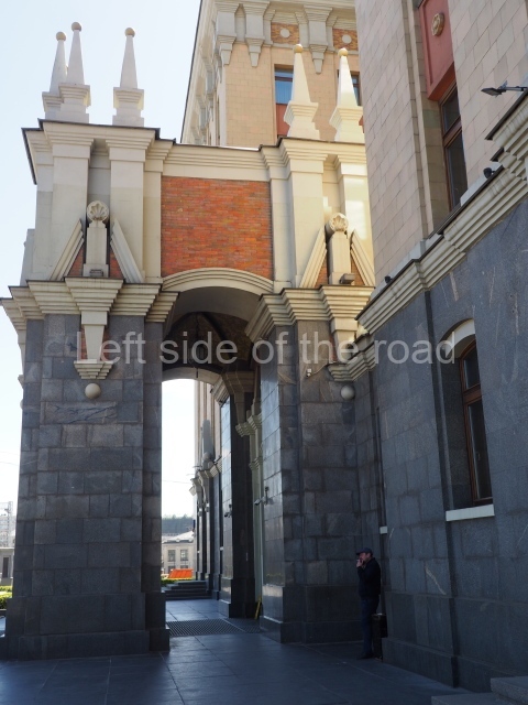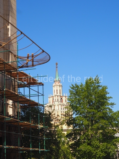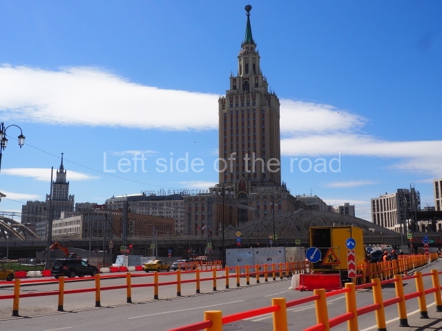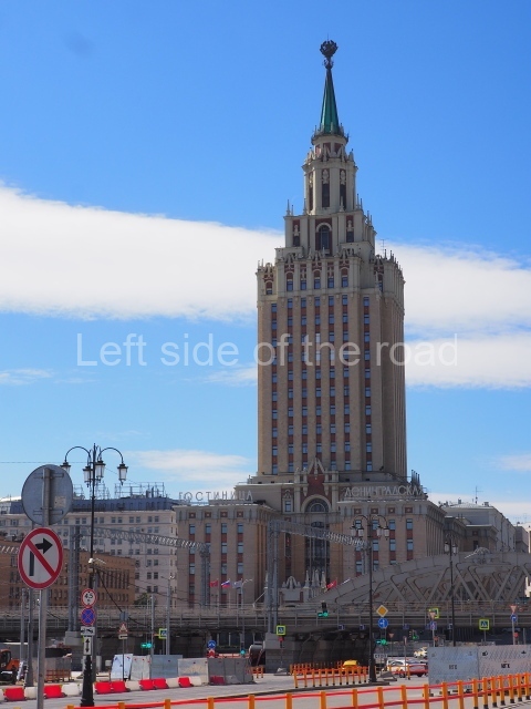 The tower of the Hilton Moscow Leningradskaya Hotel dominates Komsomolskaya Square, with its three railway stations (the Leningradsky, Yaroslavsky and Kazansky) located nearby, along with a main ring road of downtown Moscow.