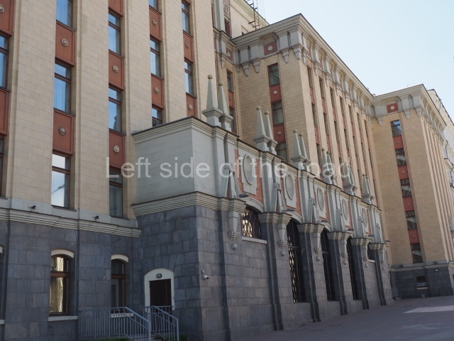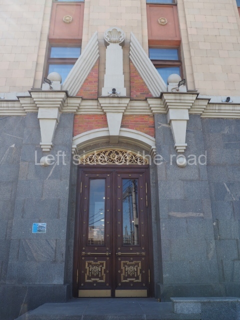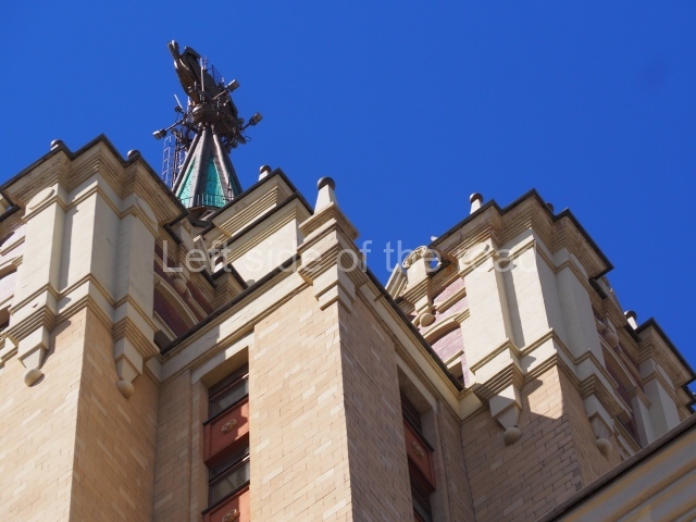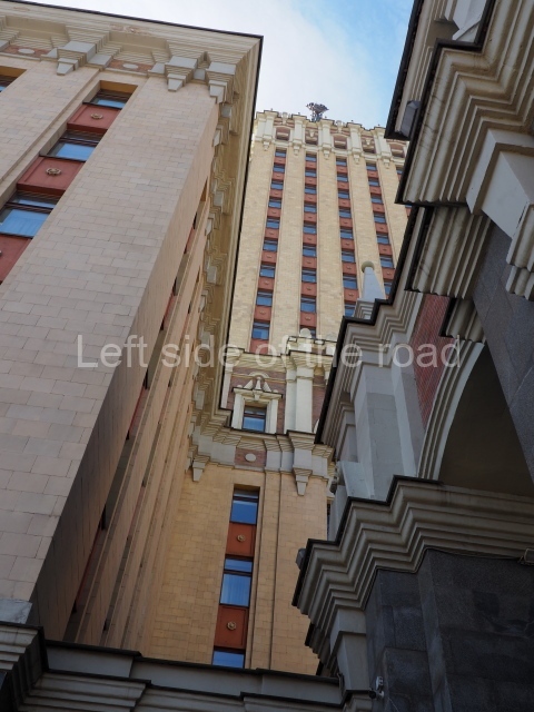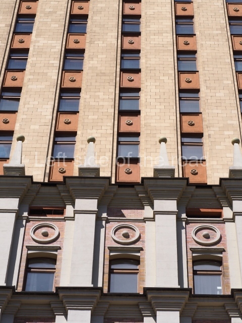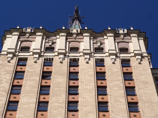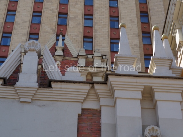 The influence of medieval Russian architecture was more evident in the exterior design of the building than in other 1950s skyscrapers. Contemporaries noted that the white-red-gold colouring of the walls ‘recalls the favourite colours of ancient Russian architecture’, the central section is stylistically close to the Kremlin towers. The main entrance is designed in the form of a terem porch. It is decorated with multi-cornered cornices, fanciful pediments, hanging weights and pinnacles. The ribs and emblem of the octagonal spire, the rosettes between the pylons and the orbs on the obelisks are covered in gold.