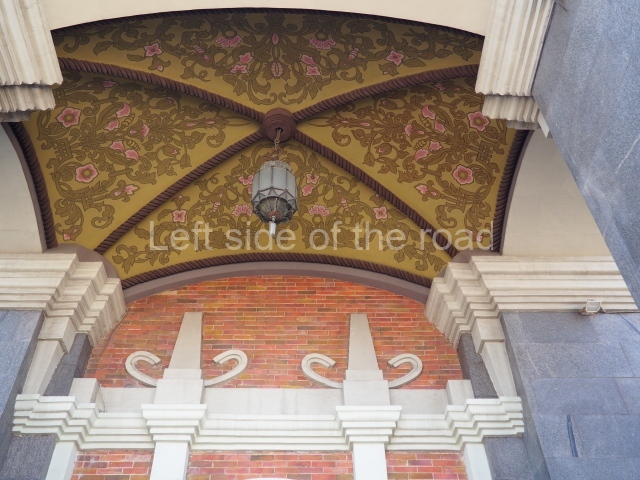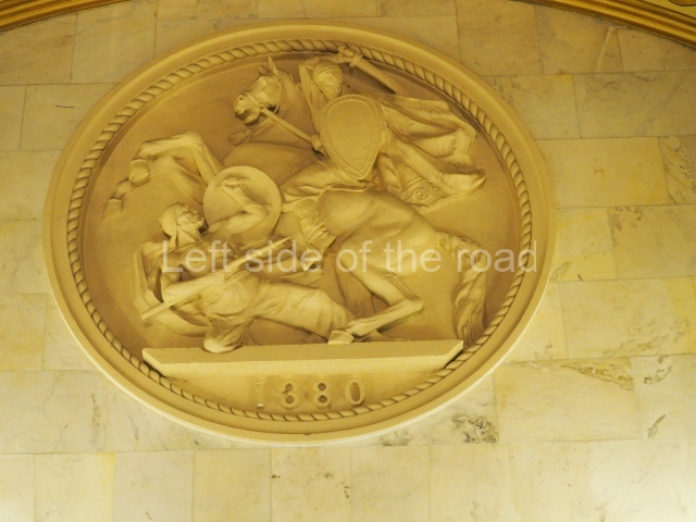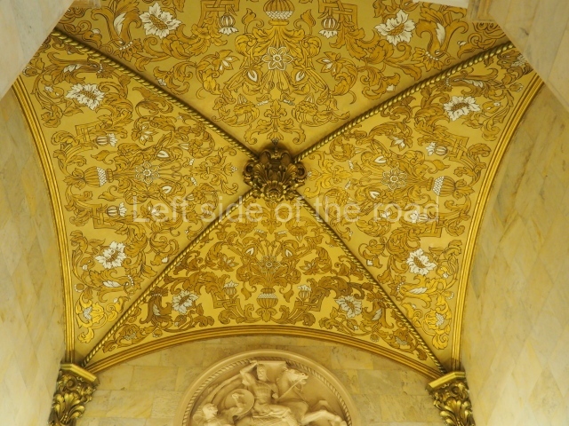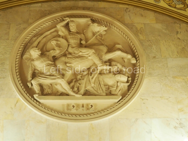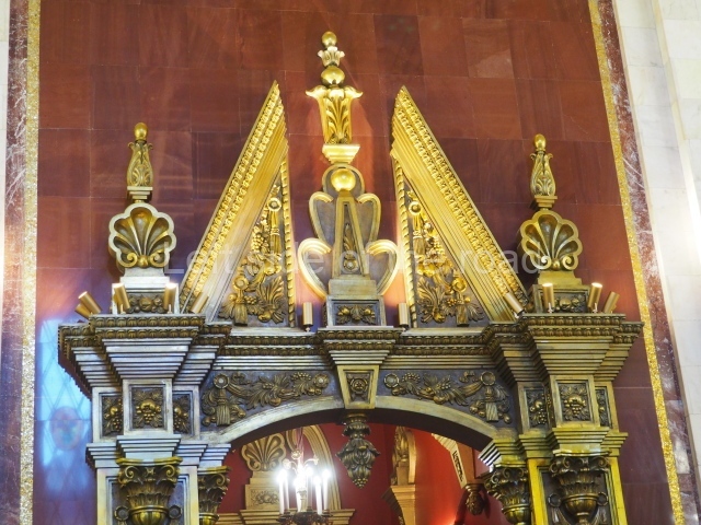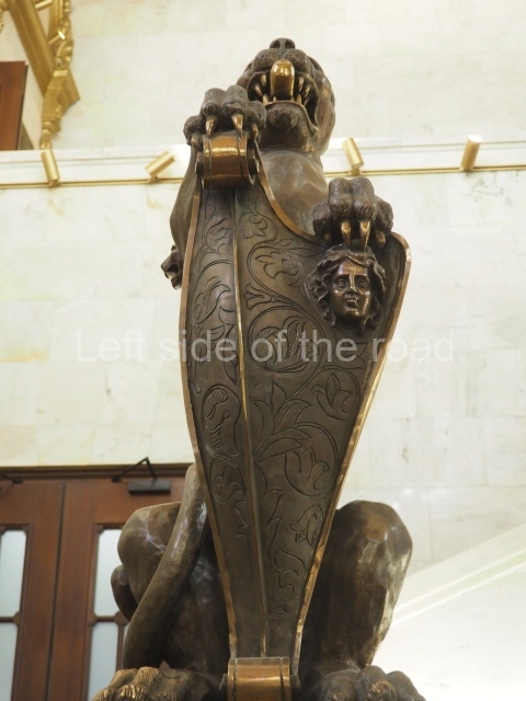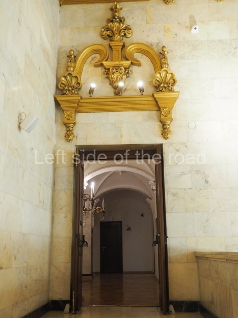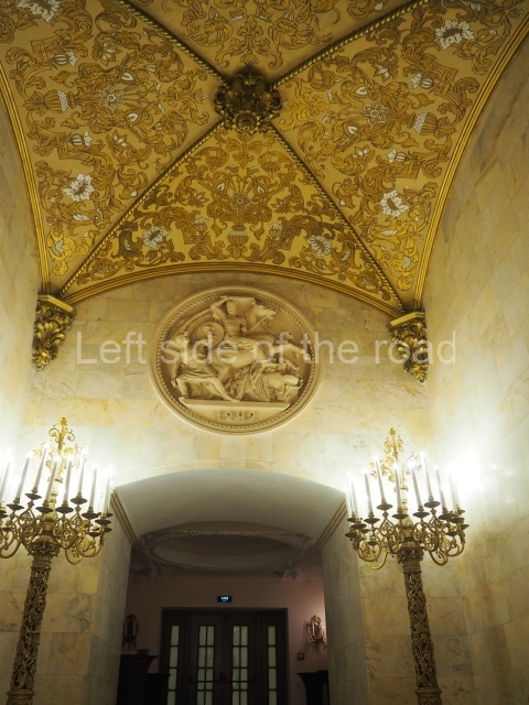 The stylistic borrowings in the interiors of the hotel are even more significant. Elements of decoration were copied from samples of pre-Petrine palaces and churches. The lift hall, decorated with golden smalt and Shoksha porphyry, is made in the form of an altar niche. The chandeliers in the halls and on the staircases are stylised as paniculars. Motifs from Russian history were used in the decoration of the interiors: on the ground floor, two round medallions are placed above the stairwells. One of them symbolises the Russian victory at the Kulikovo Field (1380), the other the victory at the Battle of the Ice (1242).