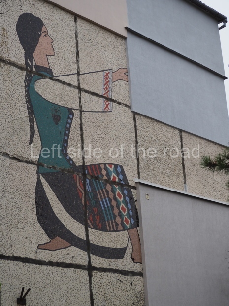The next to be found in this area is a few hundred meters up the road in the direction of the bus station. This is of a young woman, in profile, dressed in the traditional folk costume of the region. However, we don’t know the full story of the image. Ceramic tiles were the rendering of choice on these buildings and it was obviously decided that to enhance the location artists would be commissioned to create mosaics from these tiles.