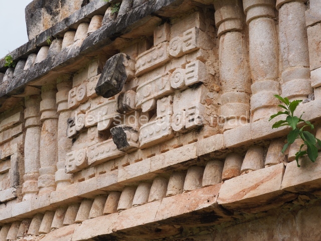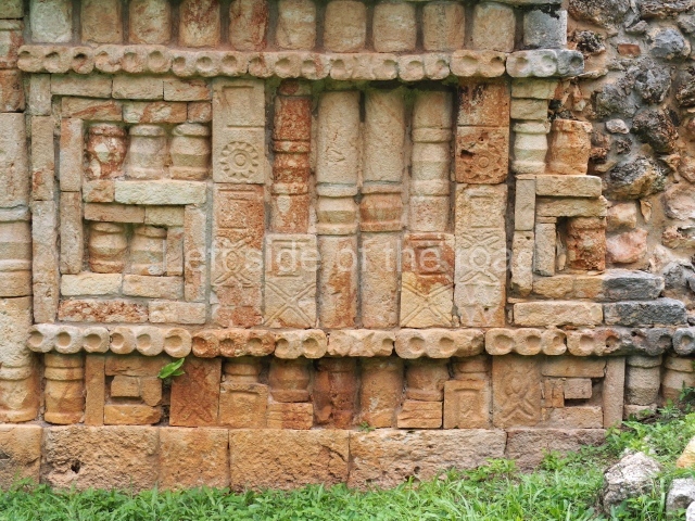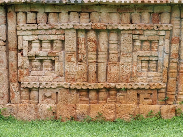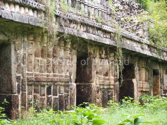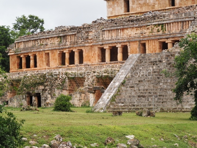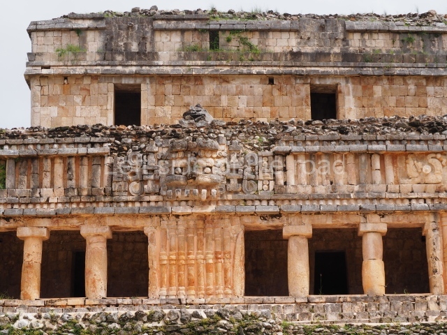 This is a fairly simple, three-room structure with a central portico defined by two columns, lintels and capitals with carved figures and anthropomorphic deities. It is the largest building in the south group. A two-level structure, its main facade faces east. On the ground floor the rooms are arranged around a solid volume. The central room on the facade has three doorways. Nearly all of the decoration is articulated by horizontal lines of colonnettes.