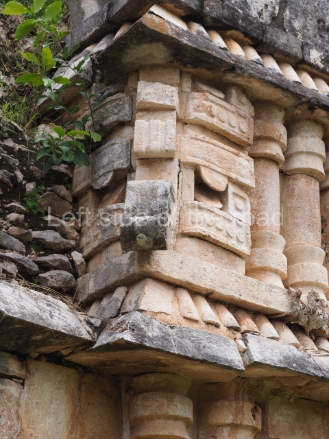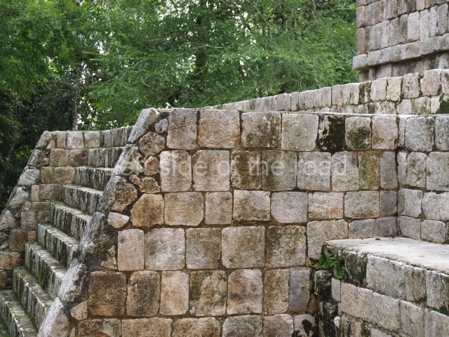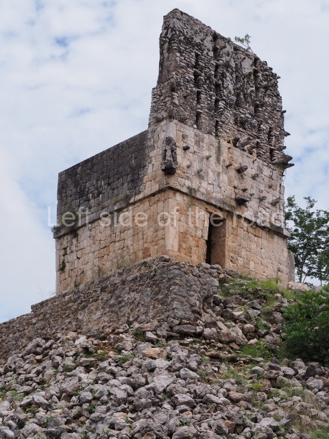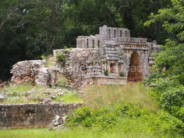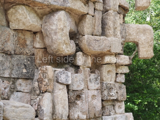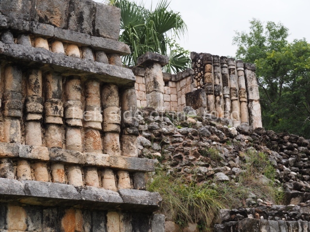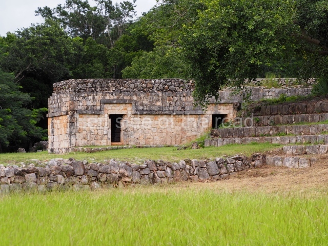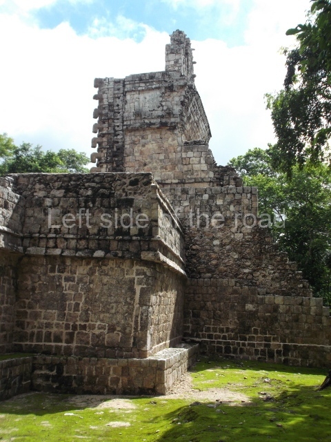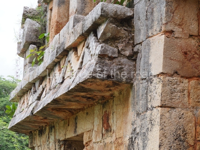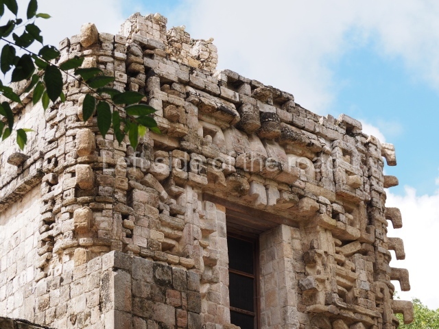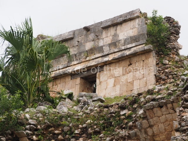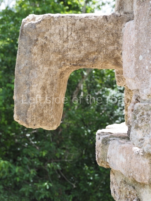 Situated next to the south end of the causeway and built on a stepped platform, the reconstructed building we see today is defined by its high corbel vault and an equally high roof comb. Nowadays, the facade is bare and simple, with medial moulding that must have contrasted with the roof comb which still displays traces of butts for stucco anthropomorphic figures. The building originally contained five rooms, of which only one has survived.