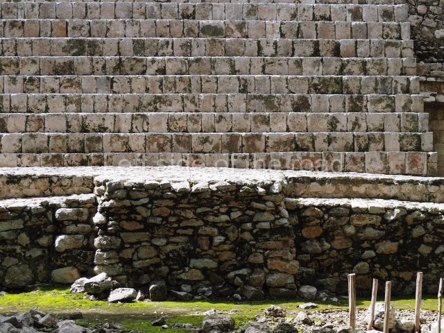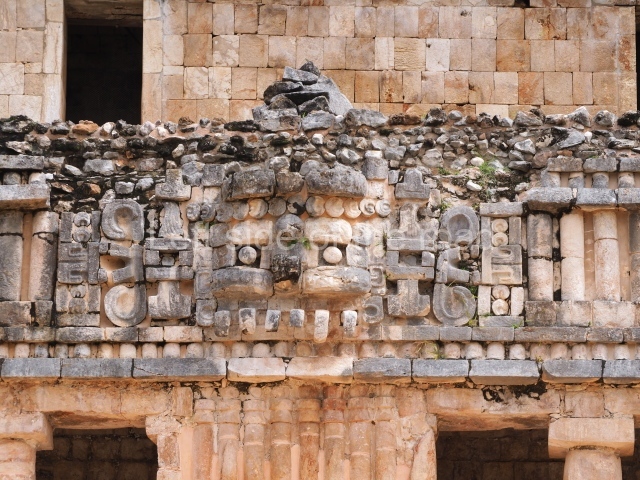 This is the best known building at Sayil, being noted for its sheer scale and decoration. In certain publications it is referred to as the Great Palace or the North Palace. It was built on ground that had been levelled and adopts the form of a vaulted group on three stepped tiers comprising over 90 rooms; its basic function was to serve as the residence of the governor’s family and closest circle. The main facade faces south and rises from a platform which also marks the beginning of the causeway that leads to the other groups that form the urban landscape of Sayil. The first two levels are defined by ‘tripartite’ entrances which eventually lead to each of the rooms inside the building. The width of these opening was achieved by a novel technique in the Maya area: the use of modestly decorated, monolithic columns, which permitted the creation of large, well-lit surfaces covered either by flat roofs or corbel vaults. The facades display a harmonious and balanced combination of various decorative panels: on each level, the facades have a different type of decoration, the most notable being the middle section with its complicated mosaic designs, typical of the Puuc style. On the bottom level, the west facade once displayed medial moulding combined with zoomorphic masks, the latter no longer visible. On the east facade, the smooth panels are combined with a frieze decorated with colonnettes. The second level offers a magnificent example of Puuc architecture at its height, combining simple entrances with much wider ones and a decorative repertoire defined by the use of colonnettes on the lower frieze. Medial and upper mouldings decorate the short sections of these same elements which alternate from wall to frieze between the doorways, the portico openings and the sculptural decoration. The walls are decorated with colonnettes with ataduras or moulded bindings in the middle and at the ends, while the frieze, simple and bare, serves to accentuate the wall decoration. On the frieze above the central openings are robust stucco masks representing the front view of a long-nosed deity, flanked by serpents shown in profile. The decoration of the lower levels of the Palace contrasts enormously with that of the top level, which is much simpler. This level was added at later date and part of the lower levels must have been filled in to support the weight of it.