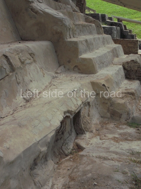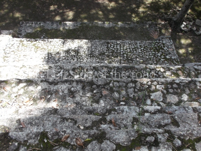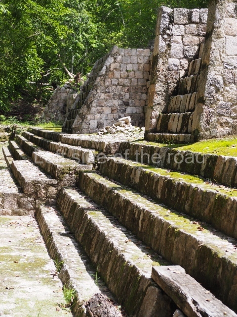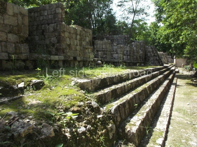 This is a large quadrangular courtyard on whose north side stands a building with several room. In the middle are the ruins of a stairway and three rooms on each side. The middle rooms is flanked by stacks of stylised masks and the frieze on the medial moulding displays two folds that evoke the ‘broken mouldings’ that were popular during one of the Puuc architecture phases. Several other buildings at Santa Rosa Xtampak combine Chenes and Puuc features – a common situation given the physical and temporal (c. AD 600-800) proximity of the two regions. Another series of constructions nearby (south side of the quadrangle) display a wide stairway leading to the rooms. Between the steps it is possible to see the mouth of a chultun. These underground cisterns for collecting rain water were very common at sites in the Chenes and Puuc regions, both in the monumental precincts as described here and also in the sections occupied by modest dwellings.
