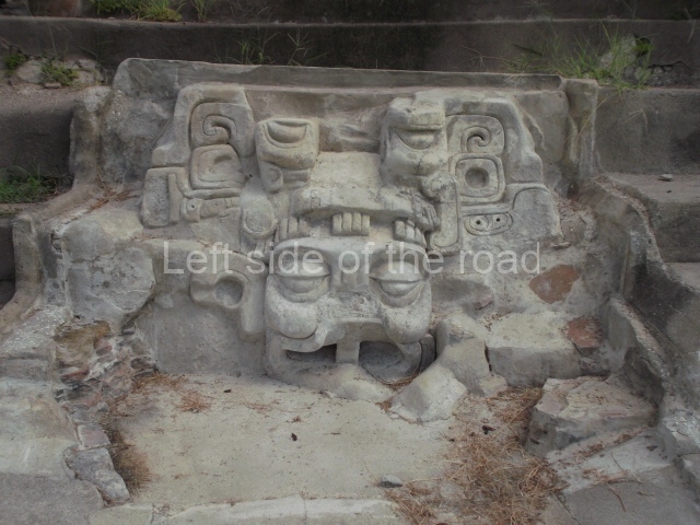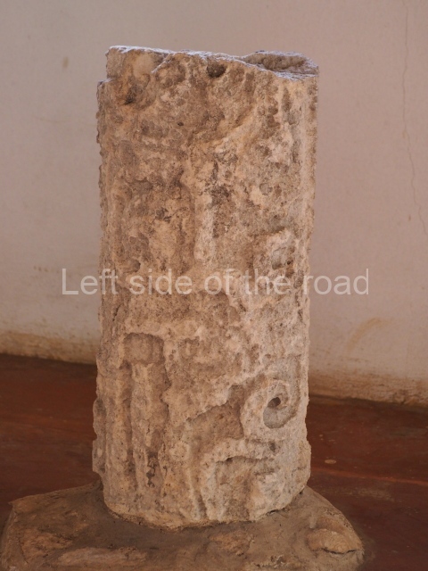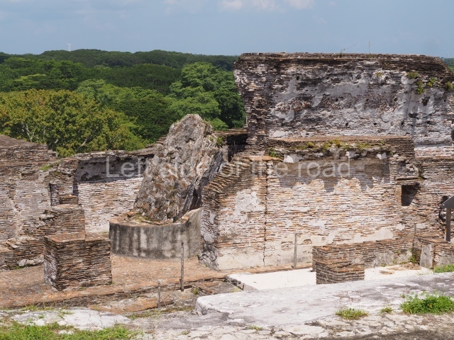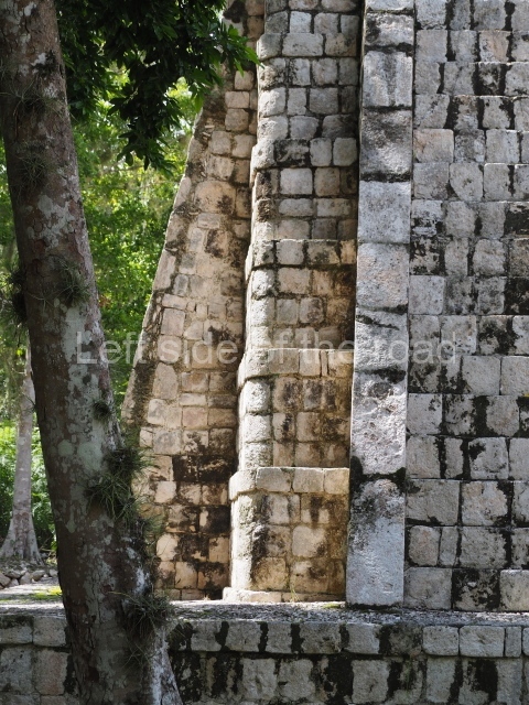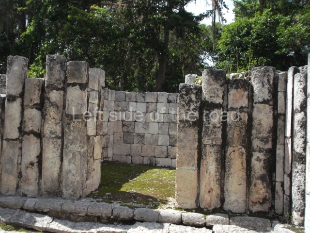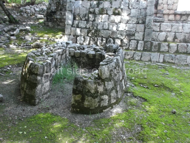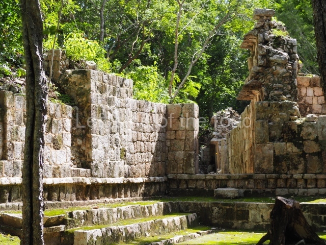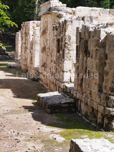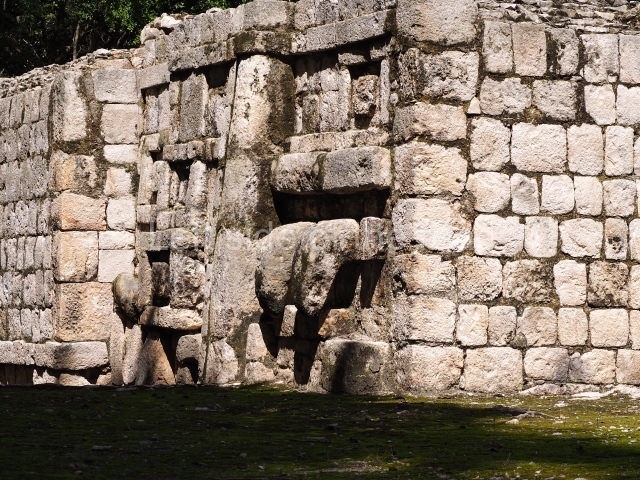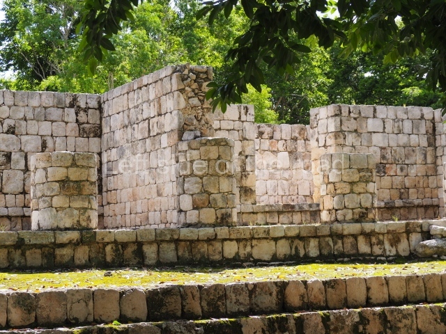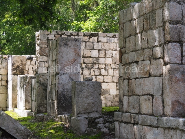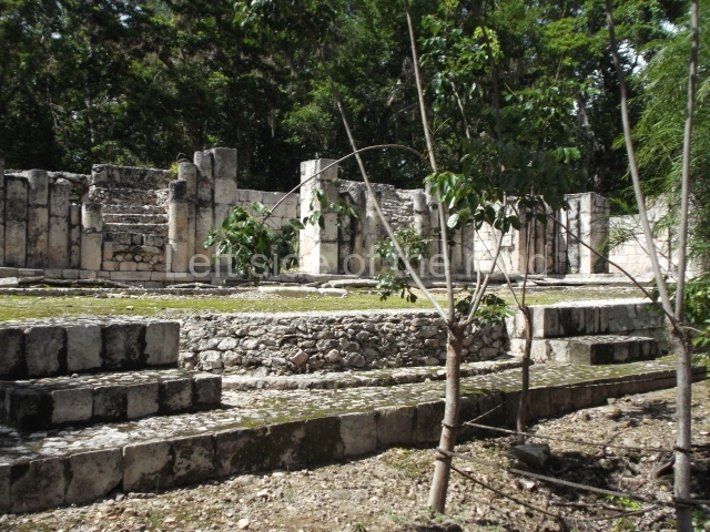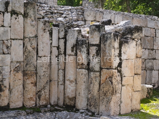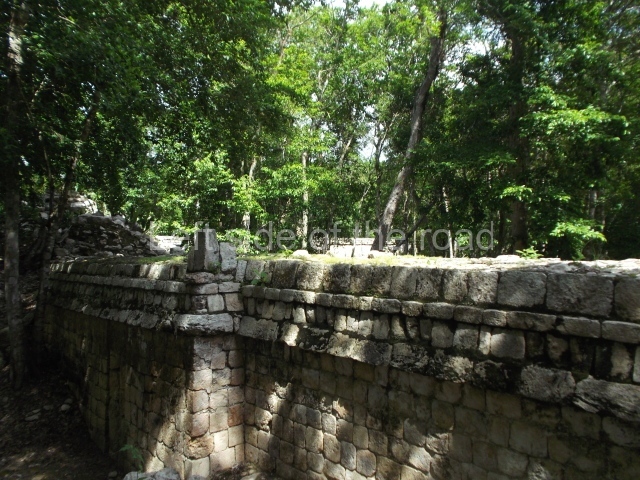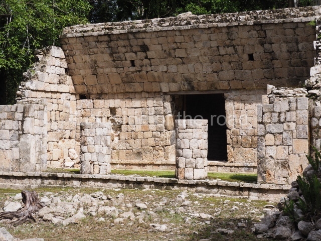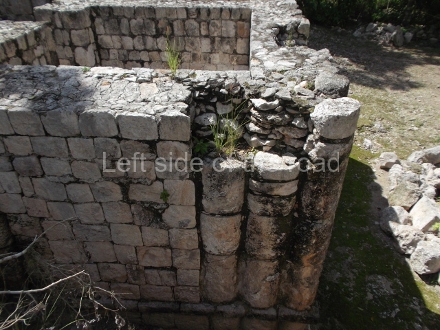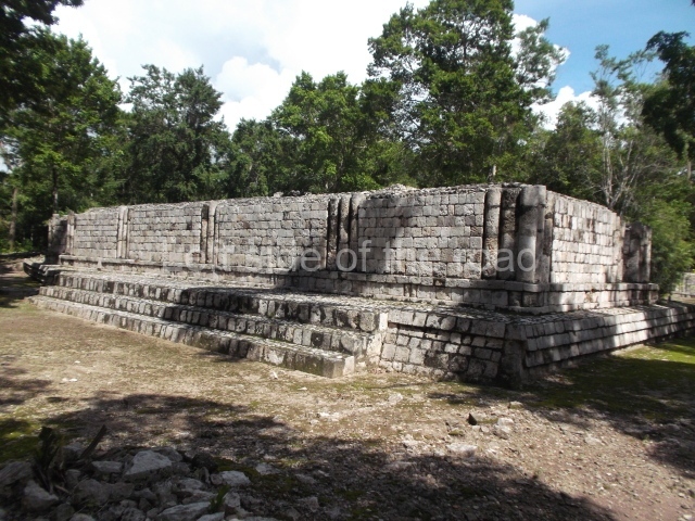 The entrance to this architectural group is via the north-west corner, given that the east, south and west ranges are connected at their corners. All of them once had corbel-vault rooms. The north range is an independent construction and it was here that researchers found various cylinders with reliefs depicting a god with large pumpkins that extend downwards, creating a type of fabric on which he seems to walk or dance. The sculptural style corresponds to the Terminal Classic (between AD 800 and 900). In the middle of the quadrangle is a low platform. The east range displays thick columns forming entrances. These supports are crowned by mouldings with three elements, almost identical to those reported at Ek’ Balam in eastern Yucatan.