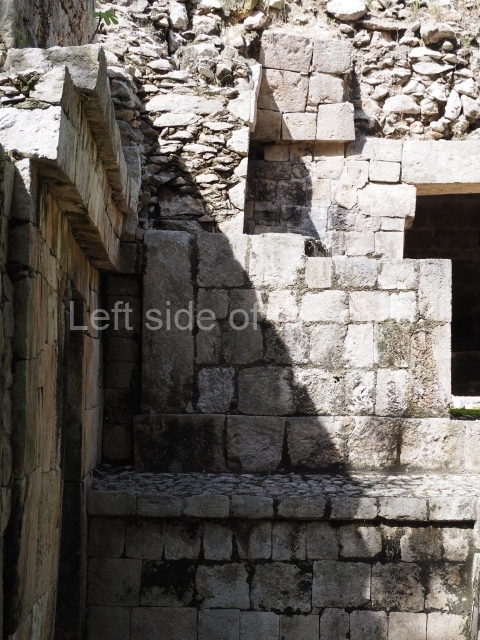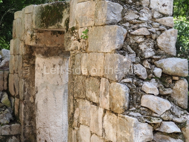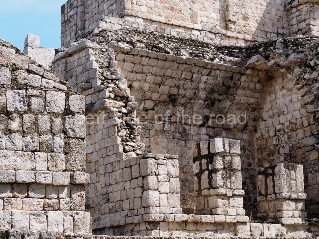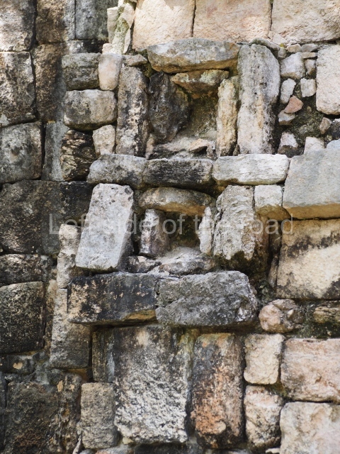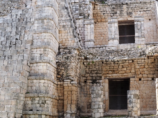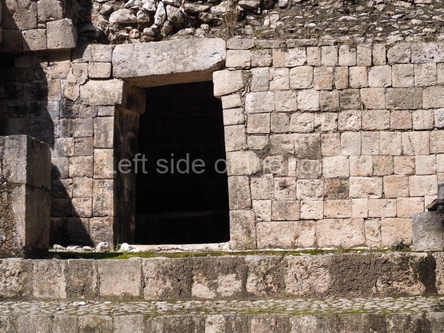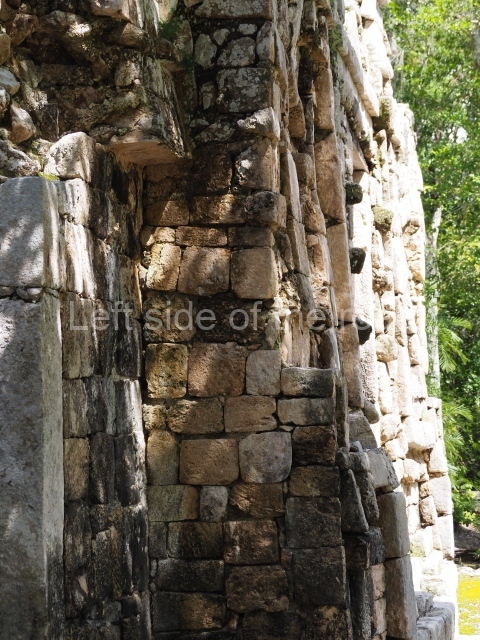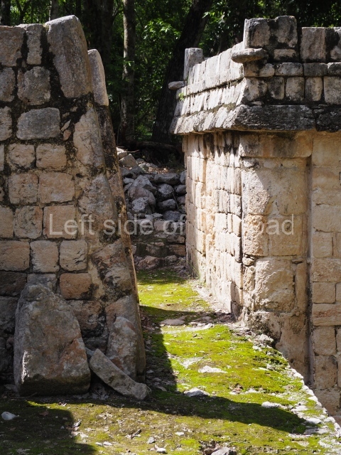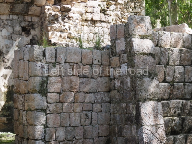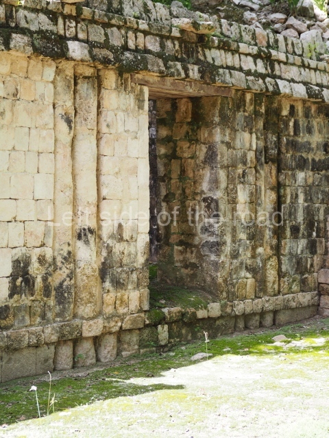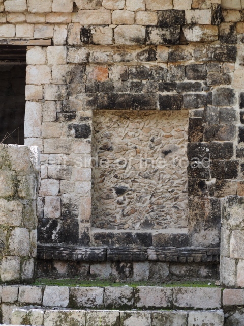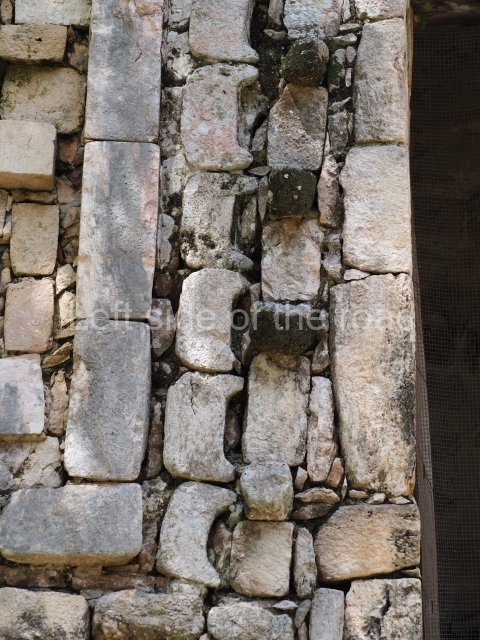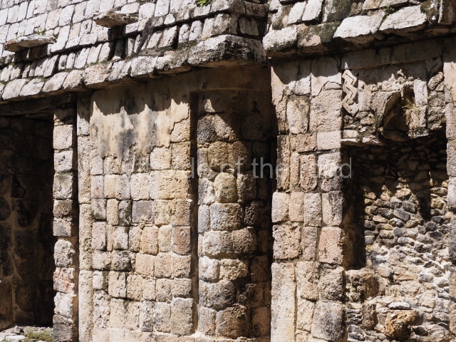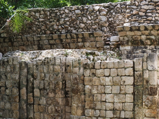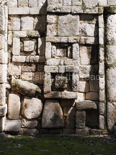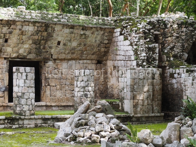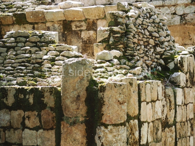 Several points indicate that this architectural group was created at different times. In the south-east section of the quadrangle, various veneer stones with unconnected reliefs have been used as part of the wall but evidently recycled from an earlier construction. Beyond the wall a passageway leads to rooms where the corbel-vault ceiling seem to be misaligned – another indication of the gradual construction of the group.