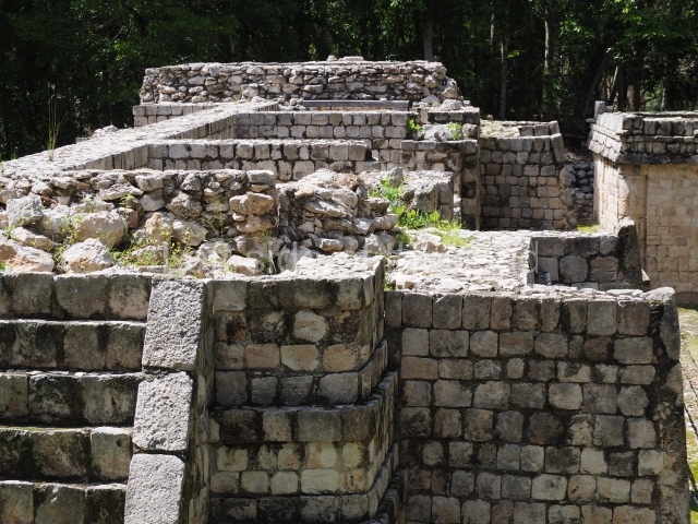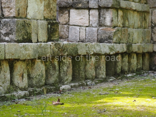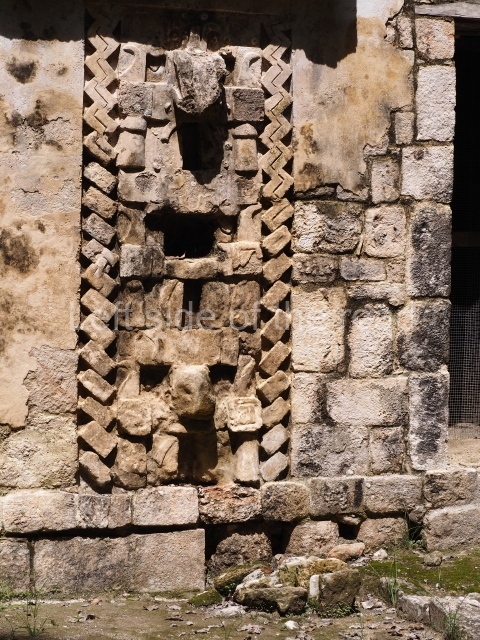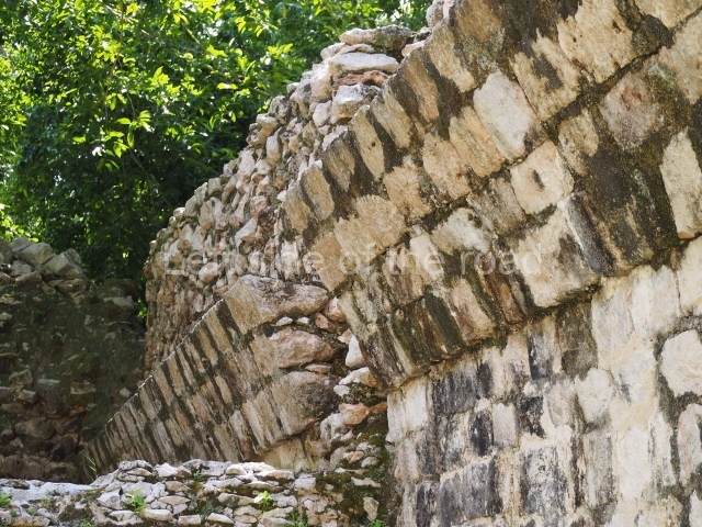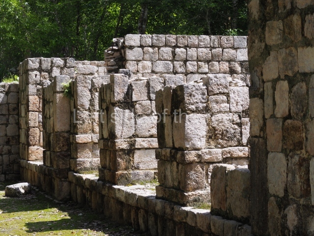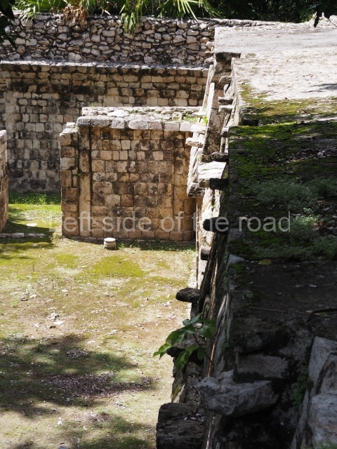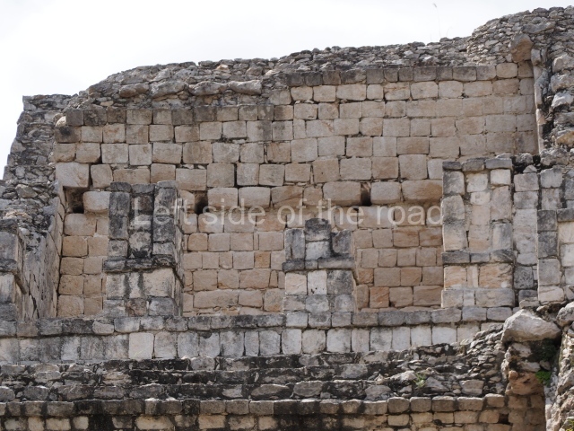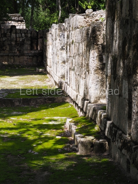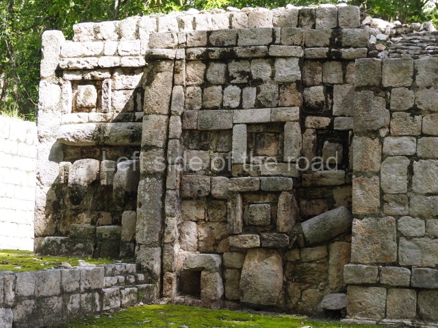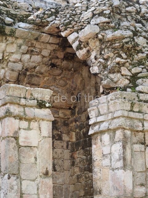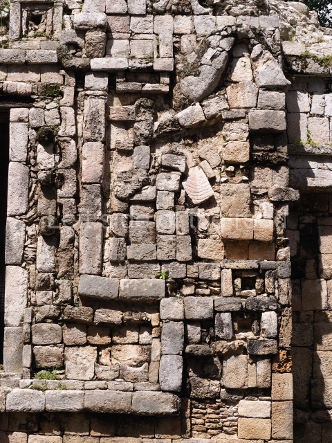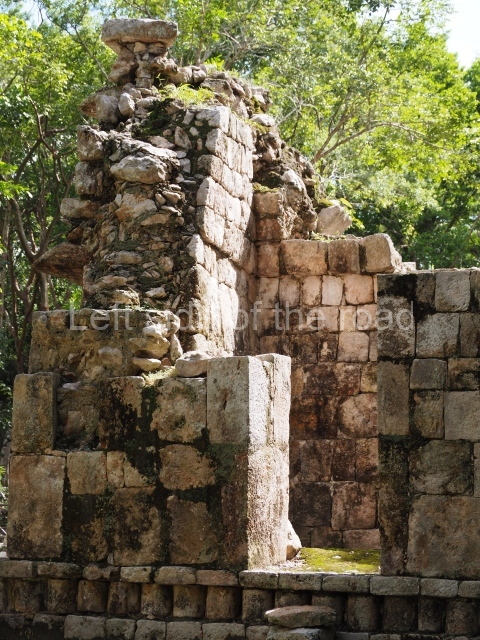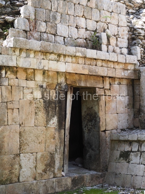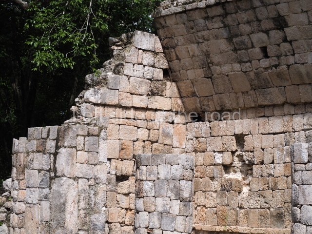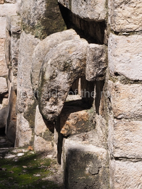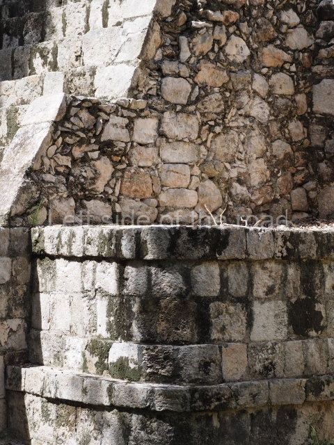 Several points indicate that this architectural group was created at different times. In the south-east section of the quadrangle, various veneer stones with unconnected reliefs have been used as part of the wall but evidently recycled from an earlier construction. Beyond the wall a passageway leads to rooms where the corbel-vault ceiling seem to be misaligned – another indication of the gradual construction of the group.