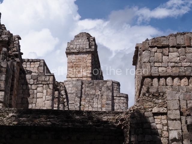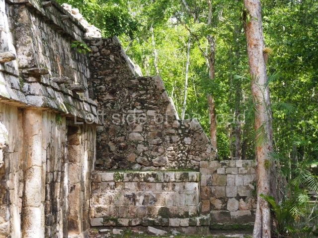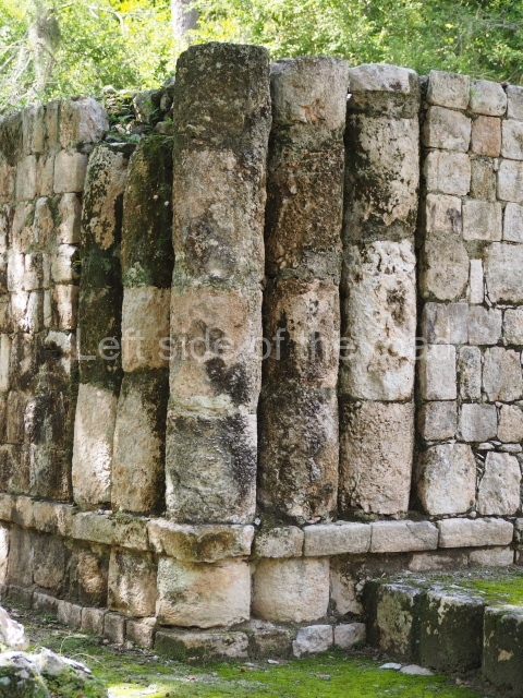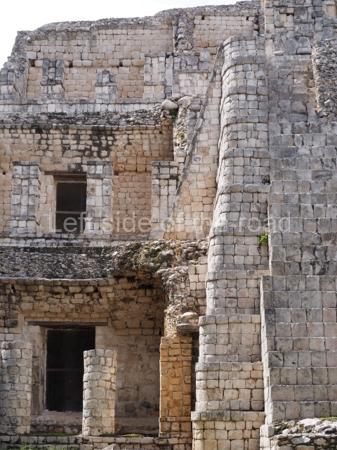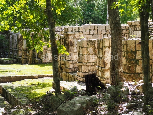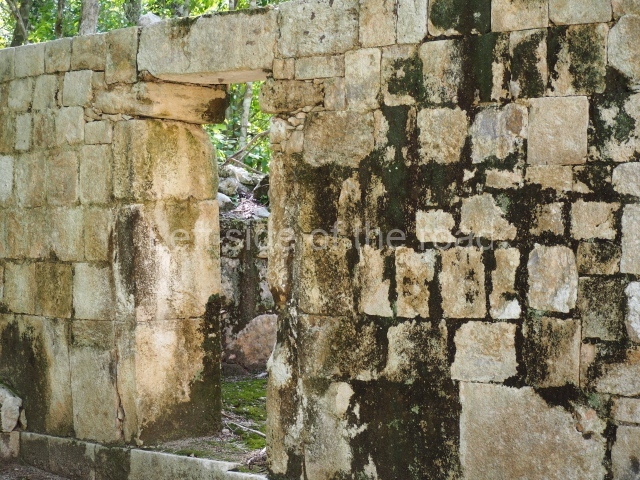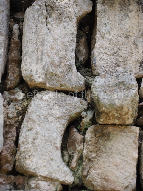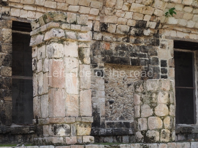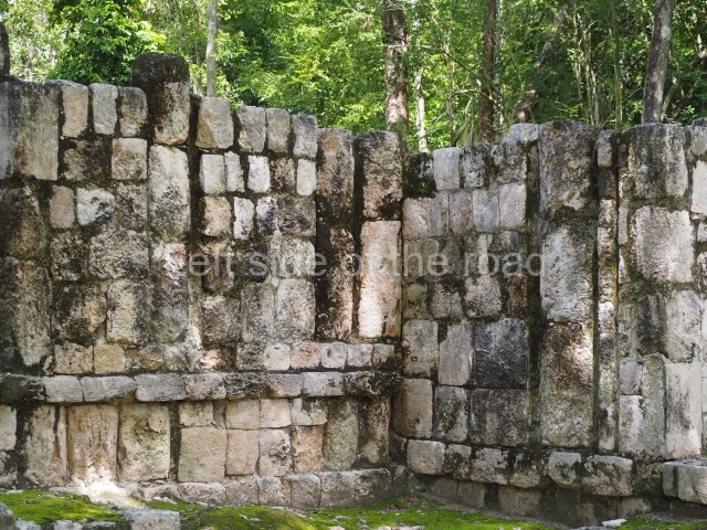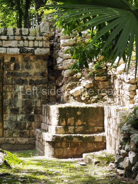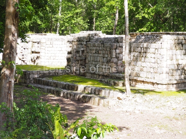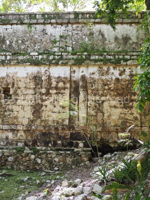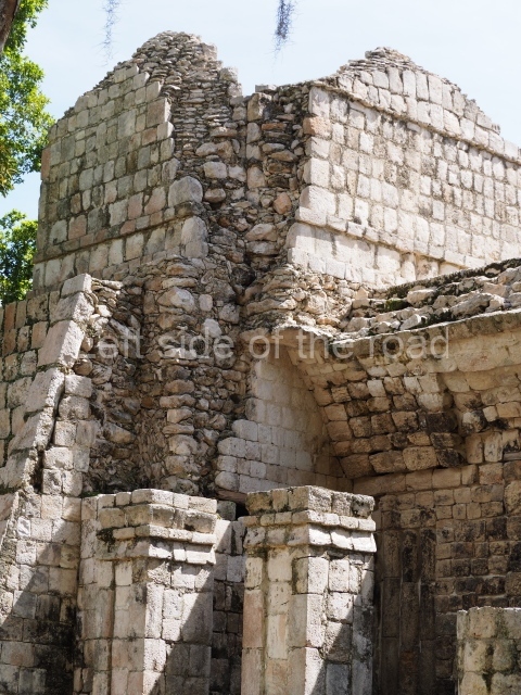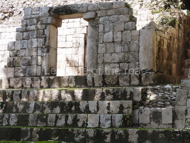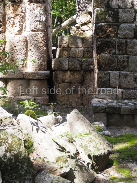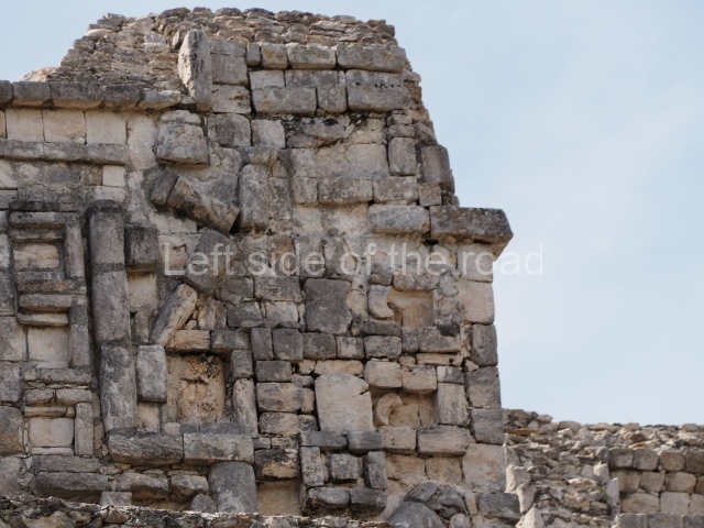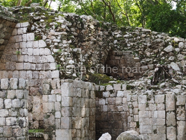 Several points indicate that this architectural group was created at different times. In the south-east section of the quadrangle, various veneer stones with unconnected reliefs have been used as part of the wall but evidently recycled from an earlier construction. Beyond the wall a passageway leads to rooms where the corbel-vault ceiling seem to be misaligned – another indication of the gradual construction of the group.