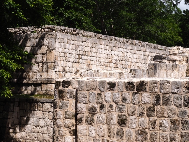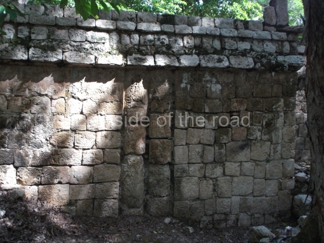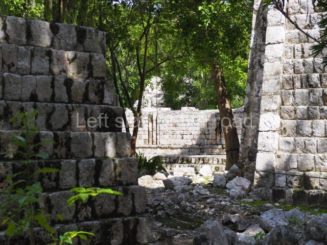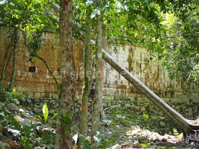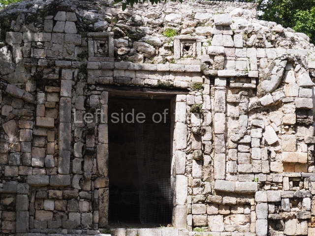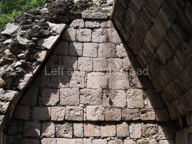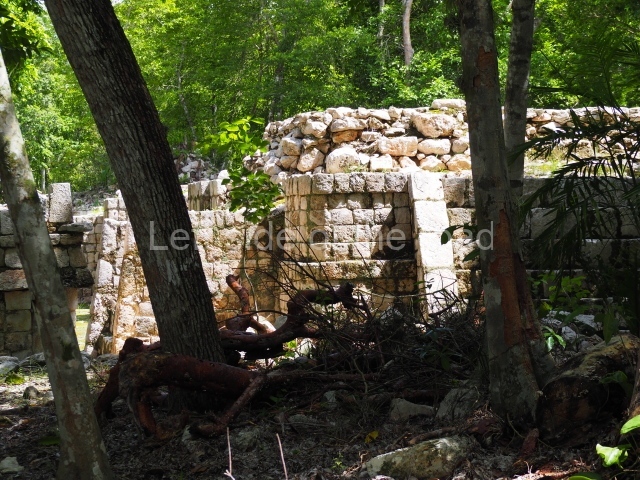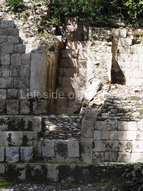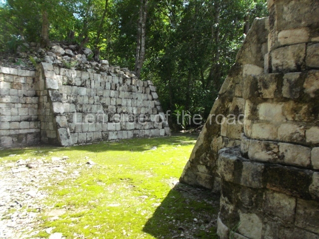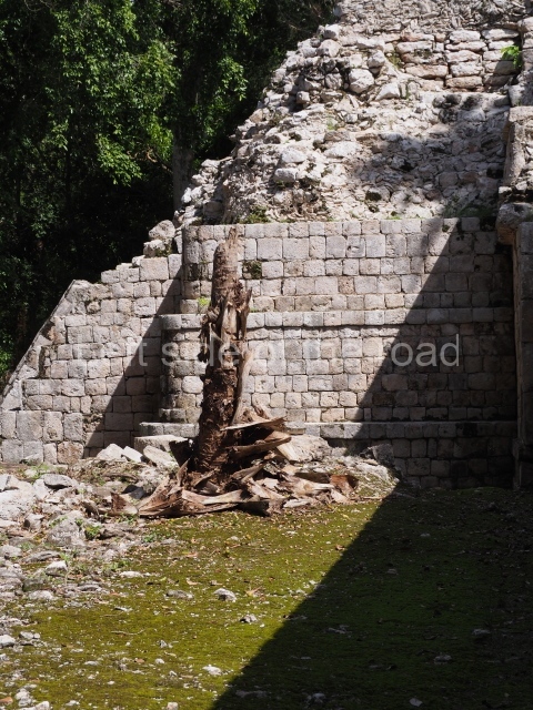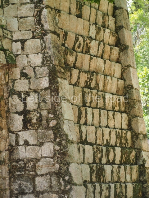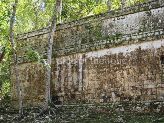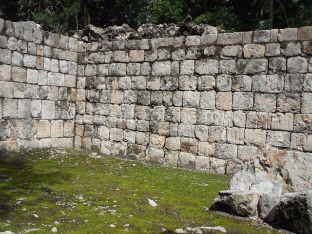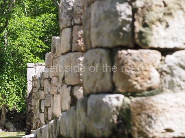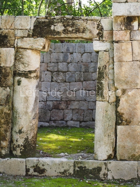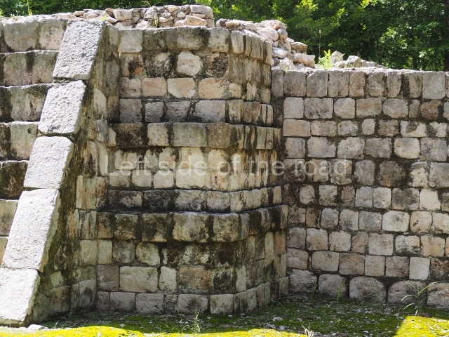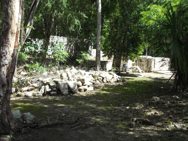 Several points indicate that this architectural group was created at different times. In the south-east section of the quadrangle, various veneer stones with unconnected reliefs have been used as part of the wall but evidently recycled from an earlier construction. Beyond the wall a passageway leads to rooms where the corbel-vault ceiling seem to be misaligned – another indication of the gradual construction of the group.