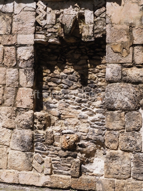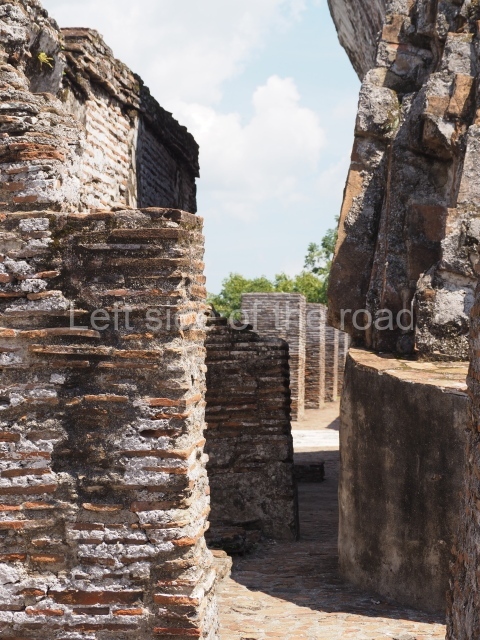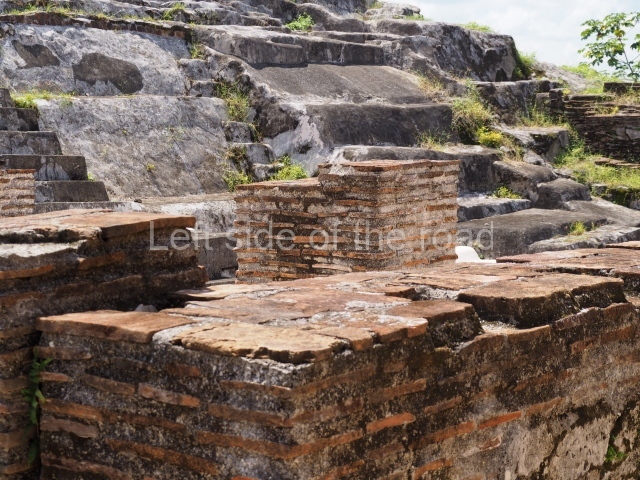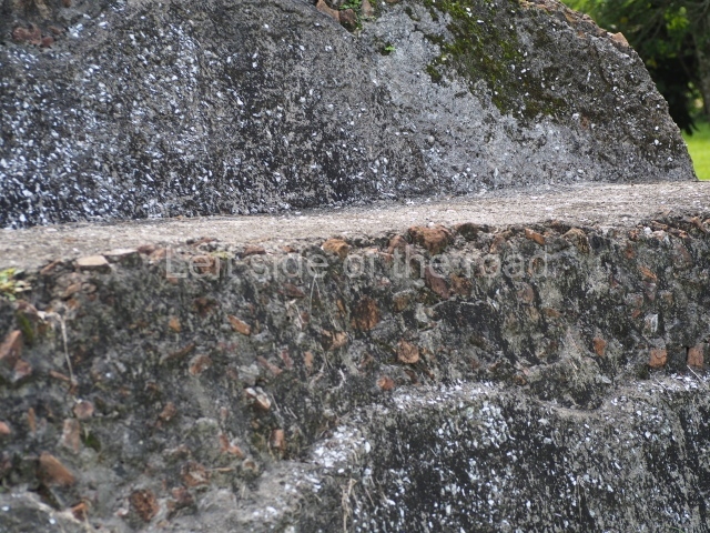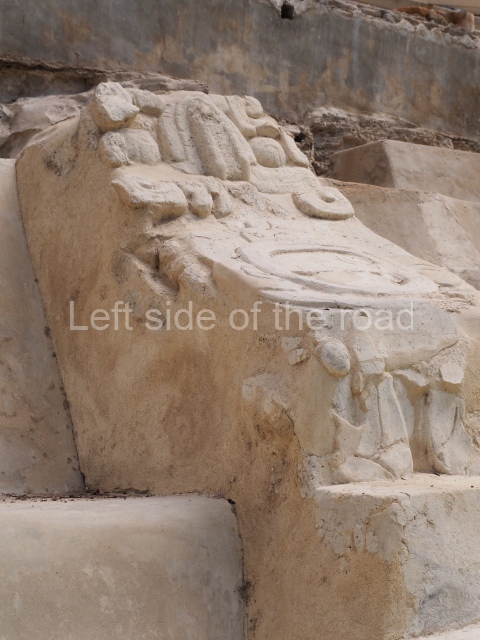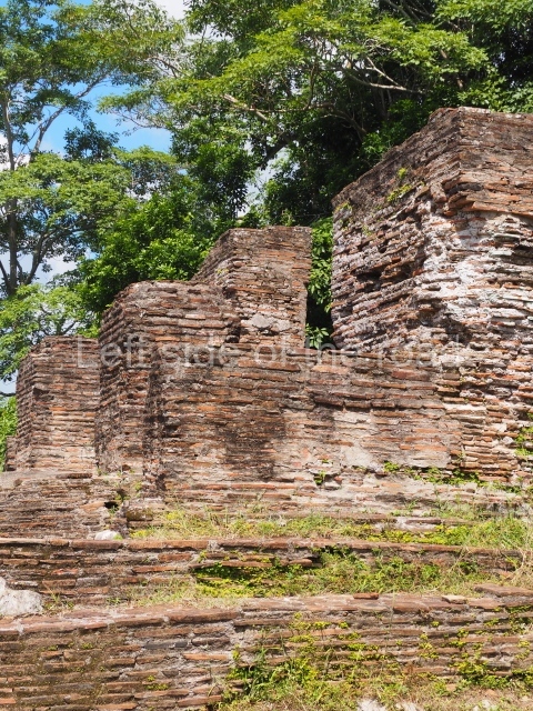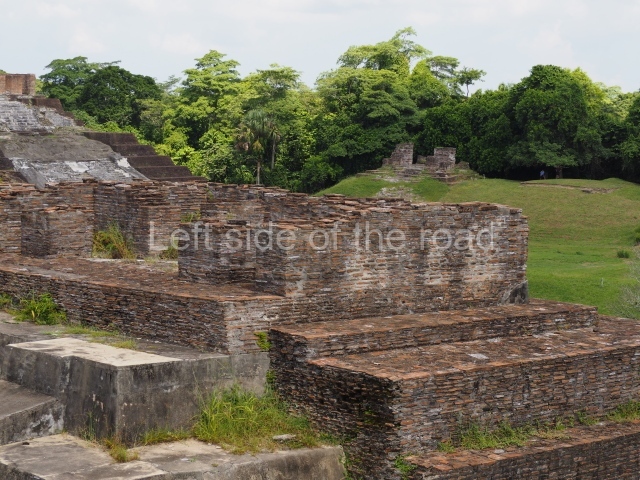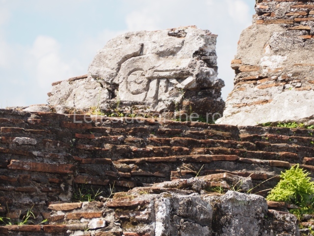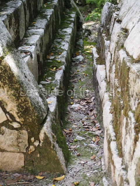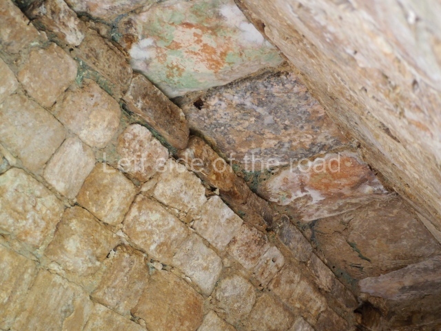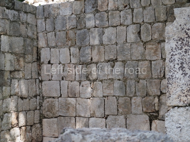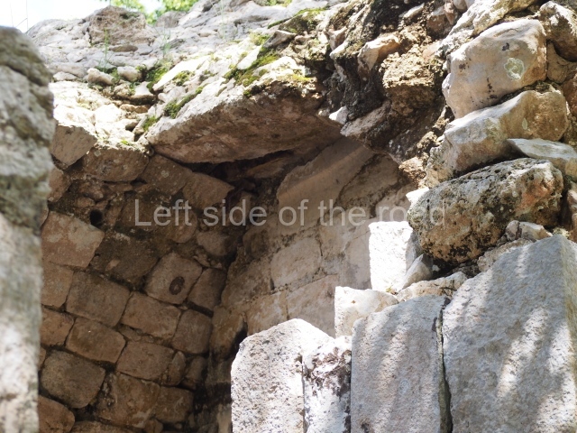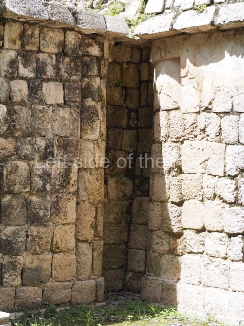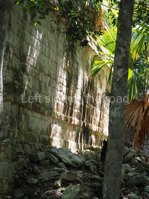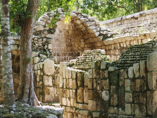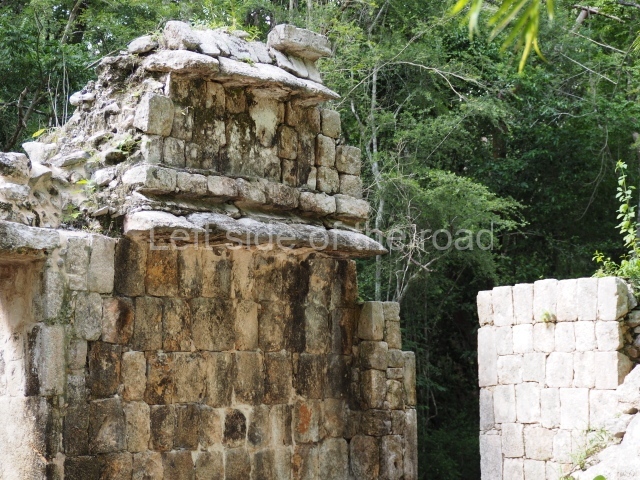 Several points indicate that this architectural group was created at different times. In the south-east section of the quadrangle, various veneer stones with unconnected reliefs have been used as part of the wall but evidently recycled from an earlier construction. Beyond the wall a passageway leads to rooms where the corbel-vault ceiling seem to be misaligned – another indication of the gradual construction of the group.