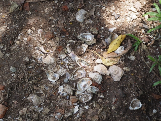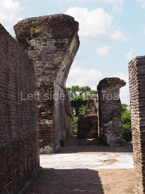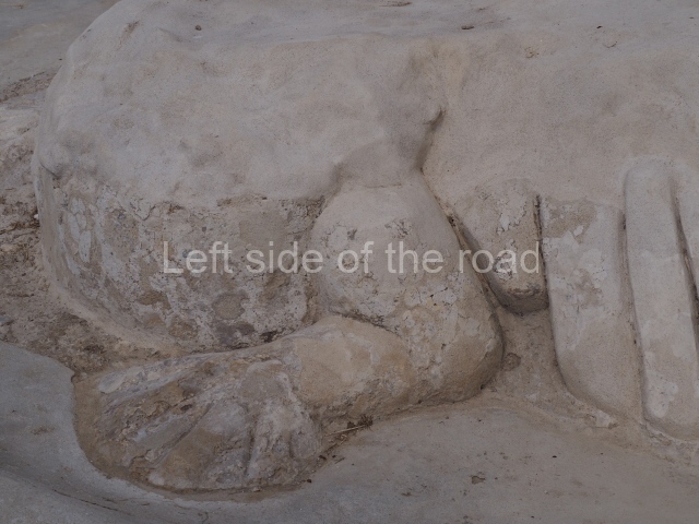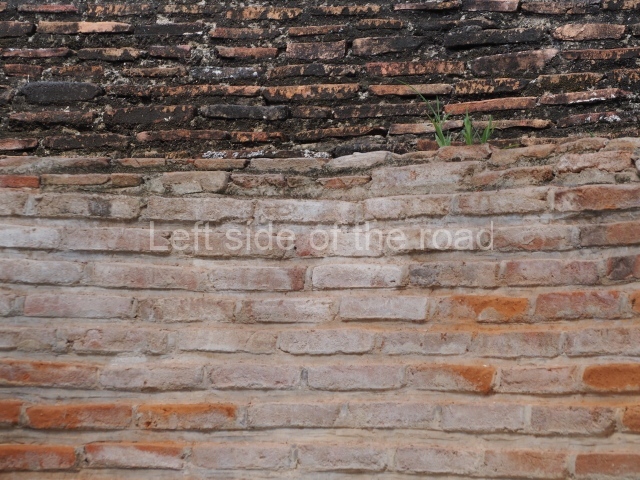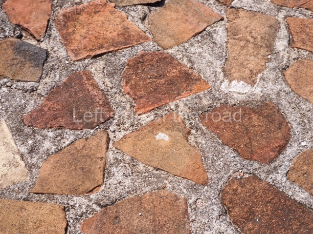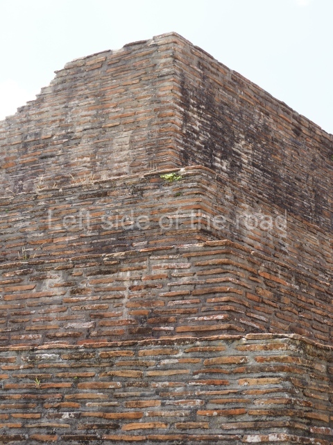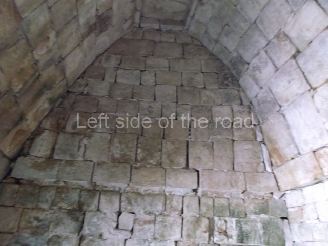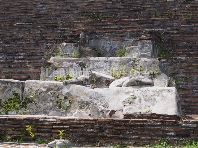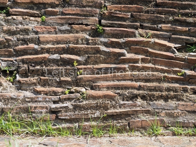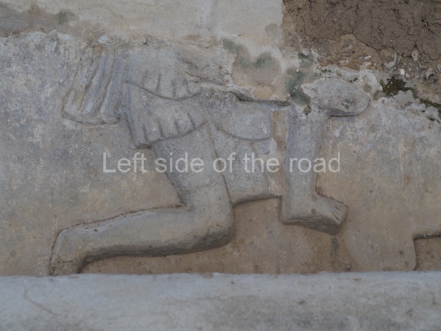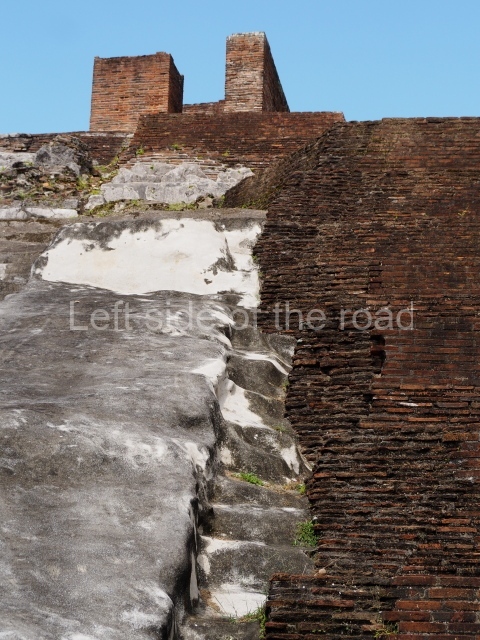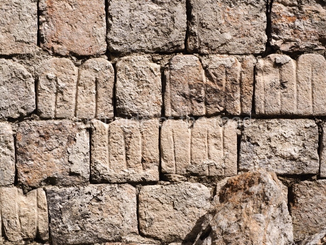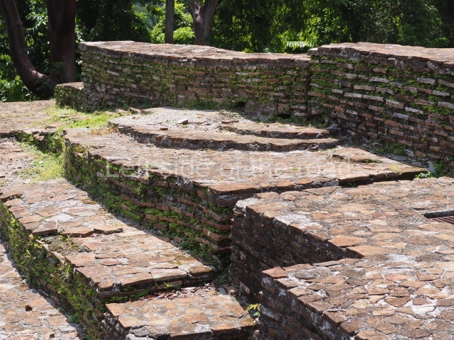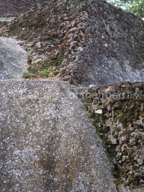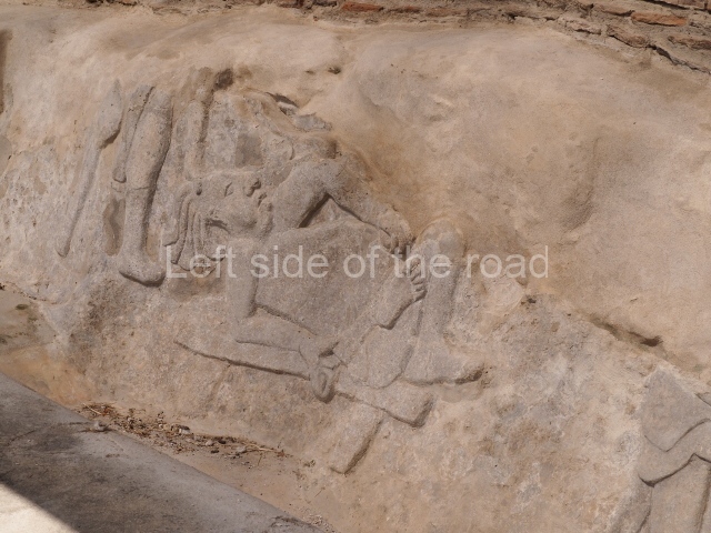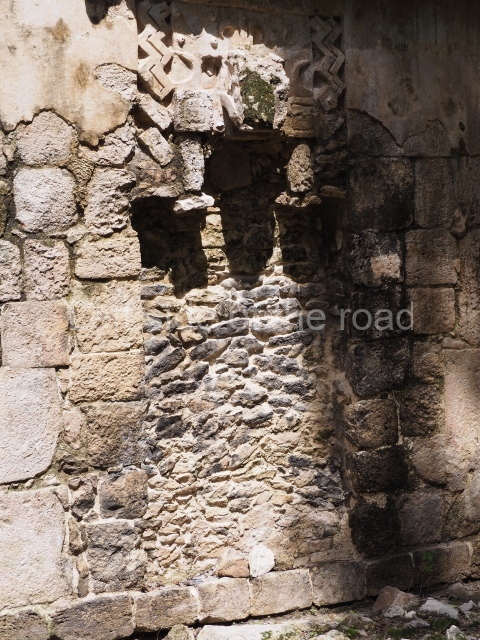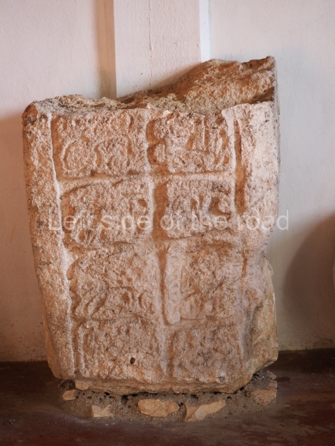 Several points indicate that this architectural group was created at different times. In the south-east section of the quadrangle, various veneer stones with unconnected reliefs have been used as part of the wall but evidently recycled from an earlier construction. Beyond the wall a passageway leads to rooms where the corbel-vault ceiling seem to be misaligned – another indication of the gradual construction of the group.