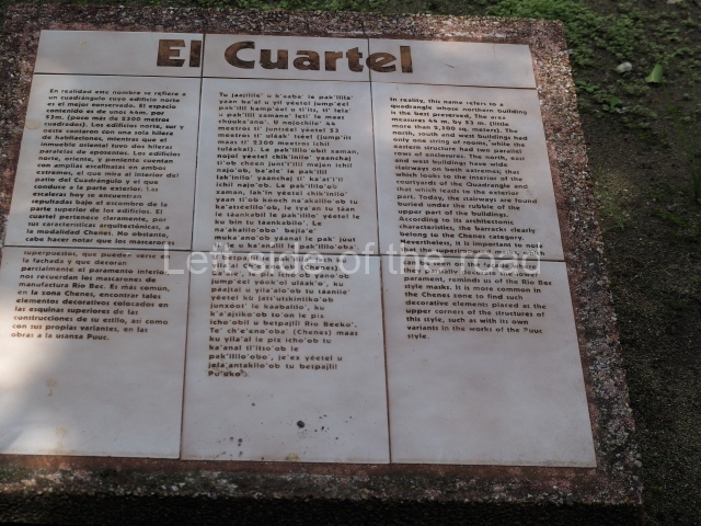 The name of this architectural group (cuartel is the Spanish word for ‘barracks’) does not actually have any military associations. It was thus called by the locals in the mid-19th century (when the site was reported by John Stephens). In this respect, it resembles the ‘Nunnery’ Quadrangle at Uxmal, which again has no logical basis but spread in the 16th century when the first Spaniards visited it.