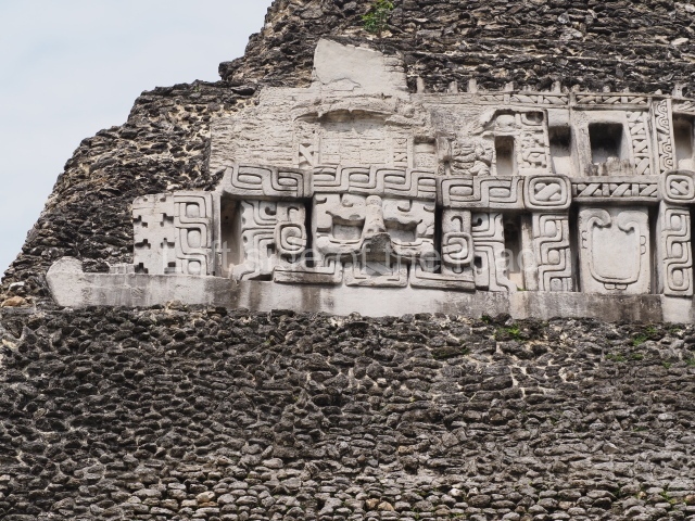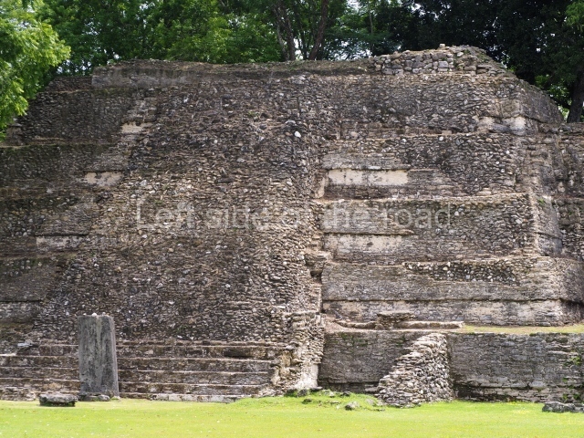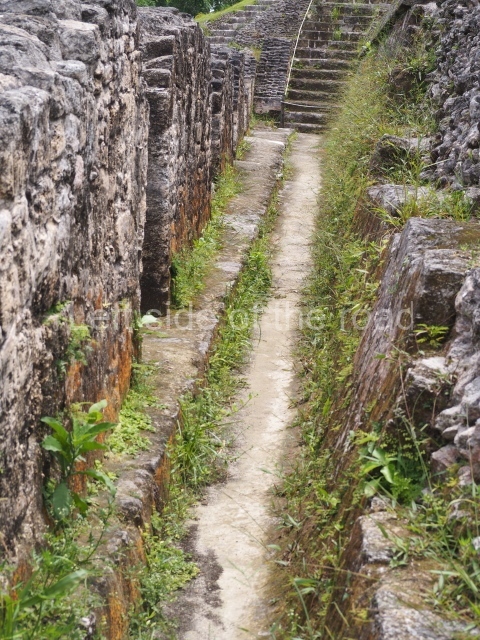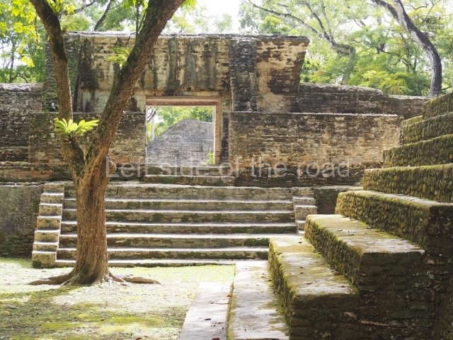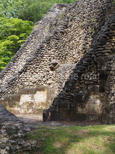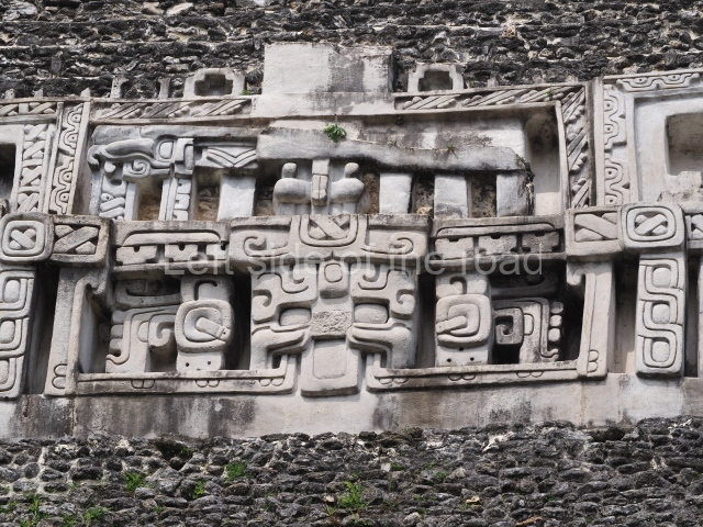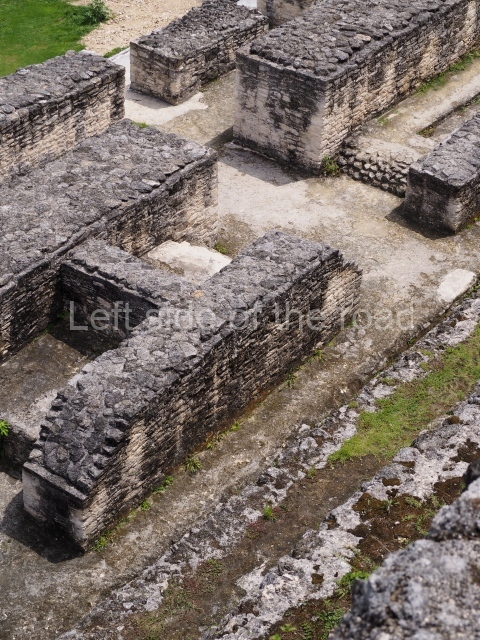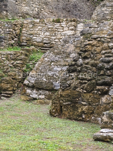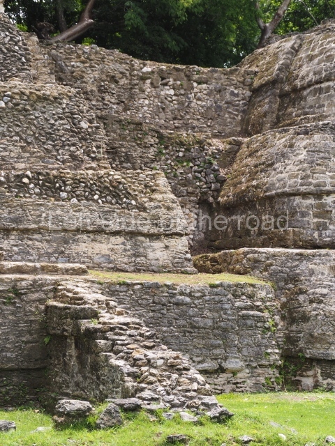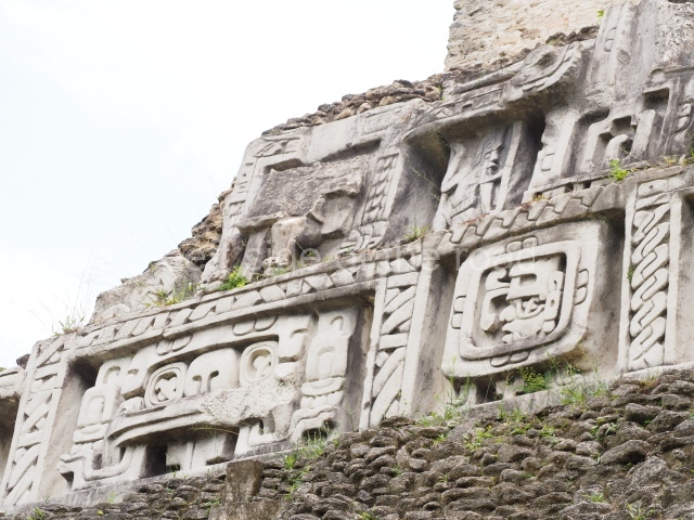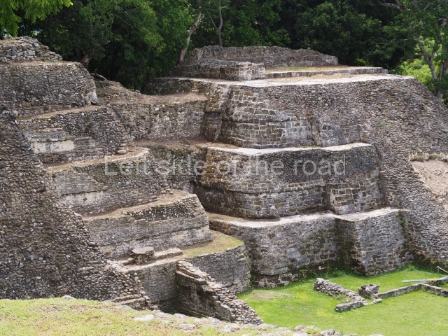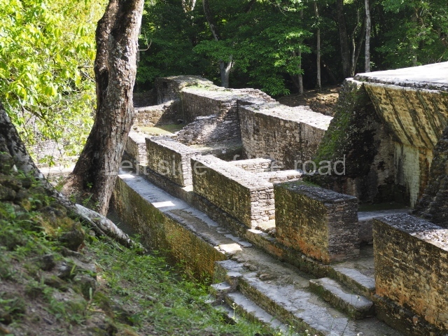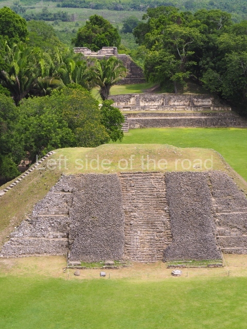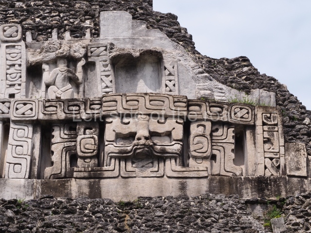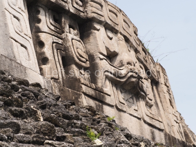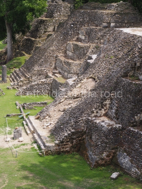 Access is from the north-east and the first area entered is Plaza B, the largest on the site. Structures B1, B2 and B3 seal the west side of the plaza. According to Joyce Kelly, this group formed an E-Group complex or astronomical marker of the solstices and equinoxes, like the one at Uaxactun in Guatemala. A royal burial from the Late Classic (AD 600 to 800) was discovered at Structure B1 with grave goods containing objects made from jade, carved shell and bone, ceramic vessels and a jade and shell mosaic belt mask. On the south side of the plaza lies structure B4, an elongated platform with a stairway at the front and mask remains on the balustrades. The explorations conducted by Joseph Ball and Jaime Awe have revealed a long occupational sequence, commencing in 1200 BC, which means that the site was one of the earliest settlements in the region. The reconstructed facade we see today dates from between 600 and 300 BC. The south-west corner of Plaza B leads to Plaza F, which has various low platforms that have not yet been restored. On the west side of this small plaza a double-flight stairway leads to the residential Groups E and D in the south-central area of the site. This section has been partially restored and contains excellent examples of Maya vaults and rooms with elegant benches for resting, not unlike those depicted in polychrome Maya vases.