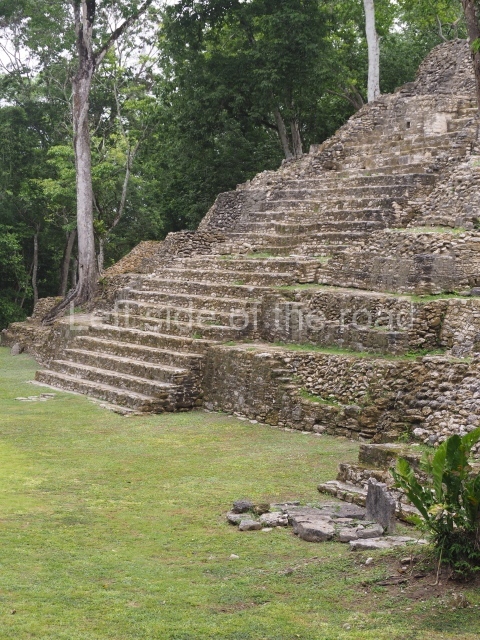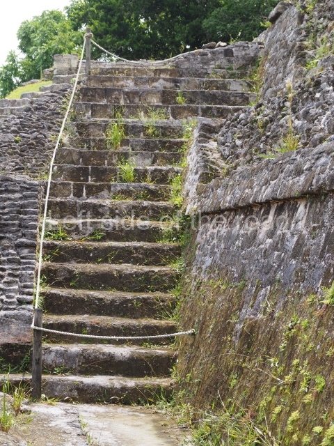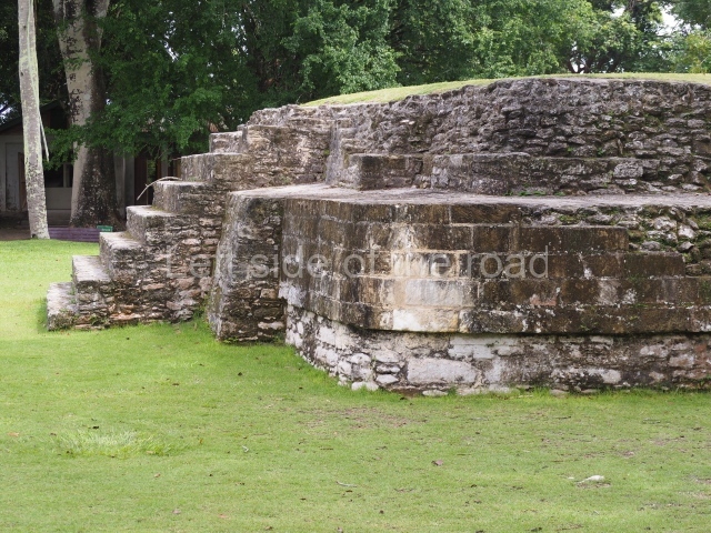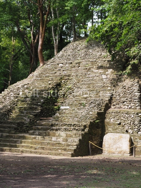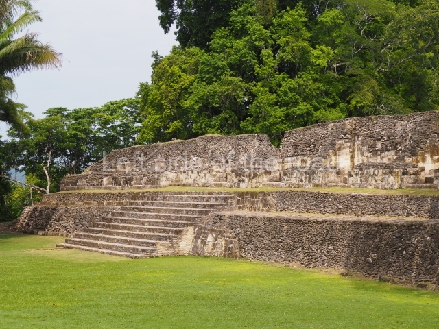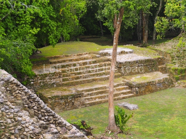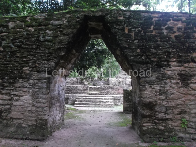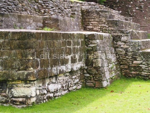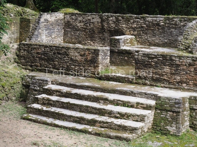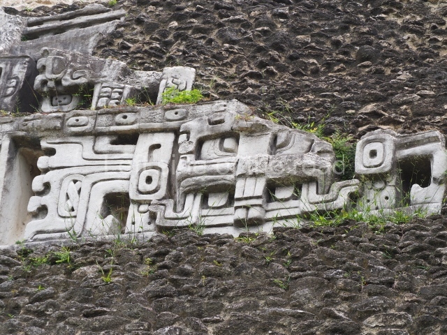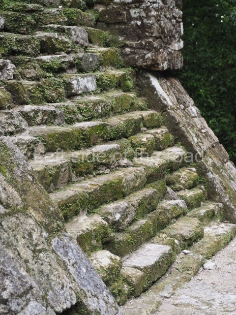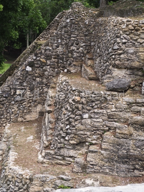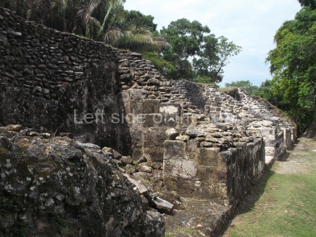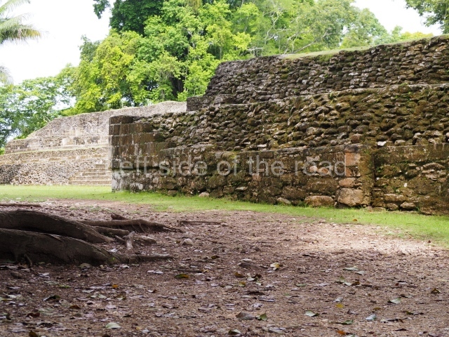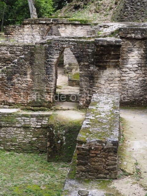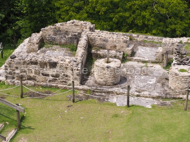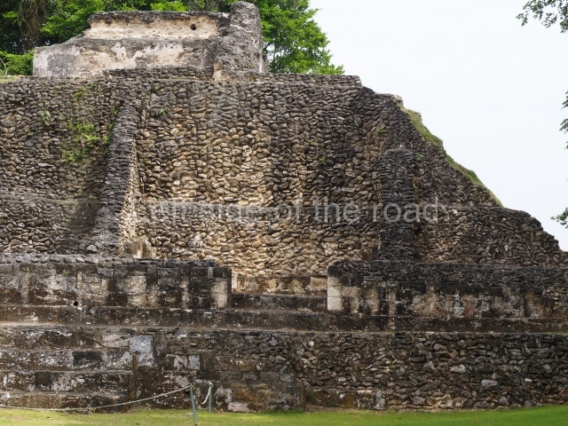 Access is from the north-east and the first area entered is Plaza B, the largest on the site. Structures B1, B2 and B3 seal the west side of the plaza. According to Joyce Kelly, this group formed an E-Group complex or astronomical marker of the solstices and equinoxes, like the one at Uaxactun in Guatemala. A royal burial from the Late Classic (AD 600 to 800) was discovered at Structure B1 with grave goods containing objects made from jade, carved shell and bone, ceramic vessels and a jade and shell mosaic belt mask. On the south side of the plaza lies structure B4, an elongated platform with a stairway at the front and mask remains on the balustrades. The explorations conducted by Joseph Ball and Jaime Awe have revealed a long occupational sequence, commencing in 1200 BC, which means that the site was one of the earliest settlements in the region. The reconstructed facade we see today dates from between 600 and 300 BC. The south-west corner of Plaza B leads to Plaza F, which has various low platforms that have not yet been restored. On the west side of this small plaza a double-flight stairway leads to the residential Groups E and D in the south-central area of the site. This section has been partially restored and contains excellent examples of Maya vaults and rooms with elegant benches for resting, not unlike those depicted in polychrome Maya vases.