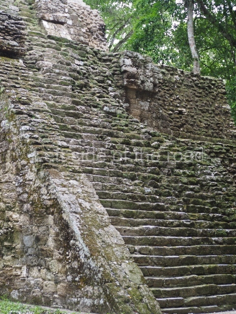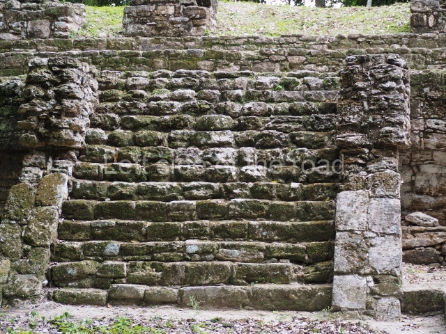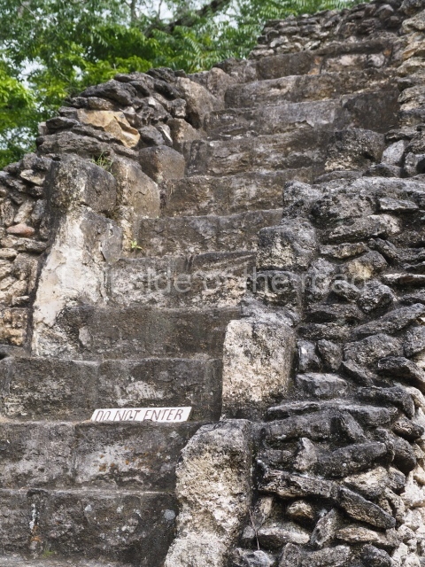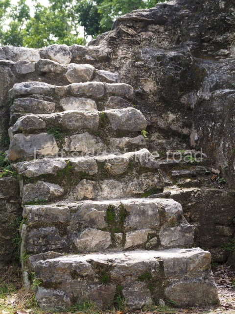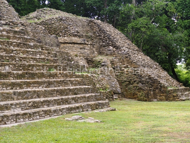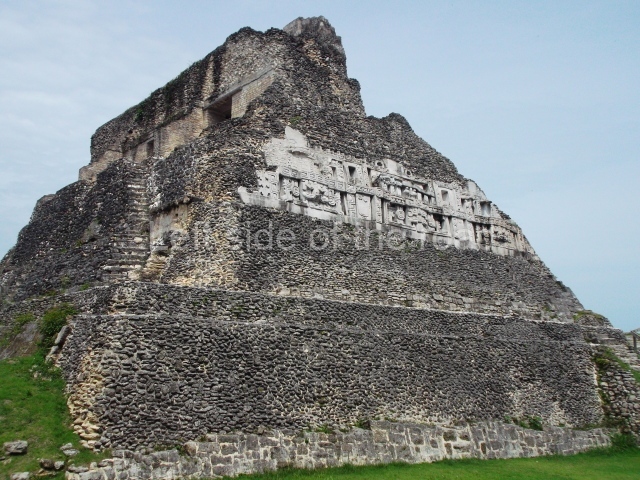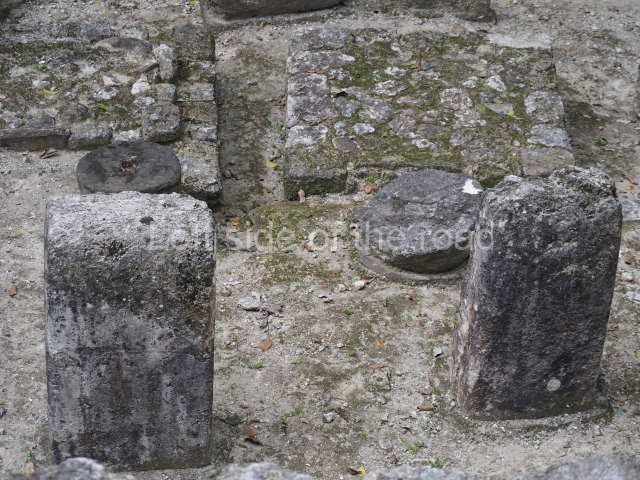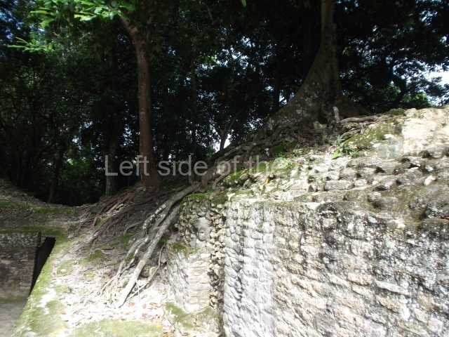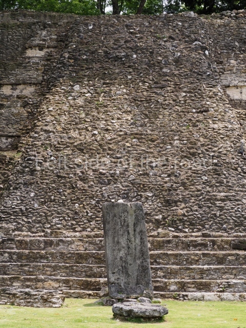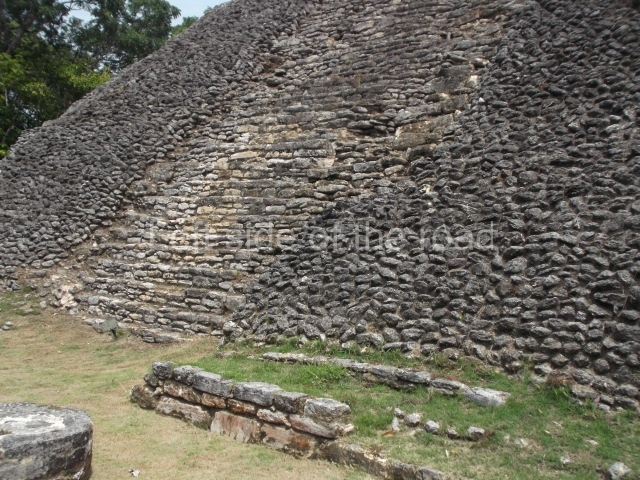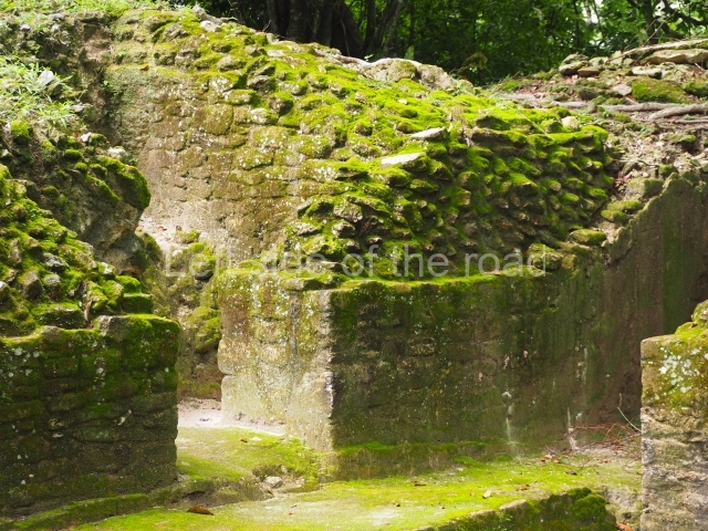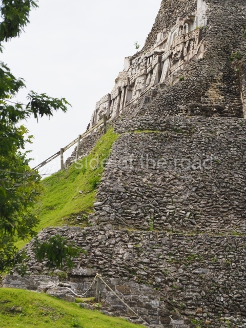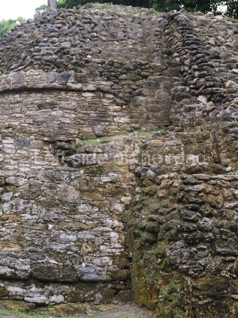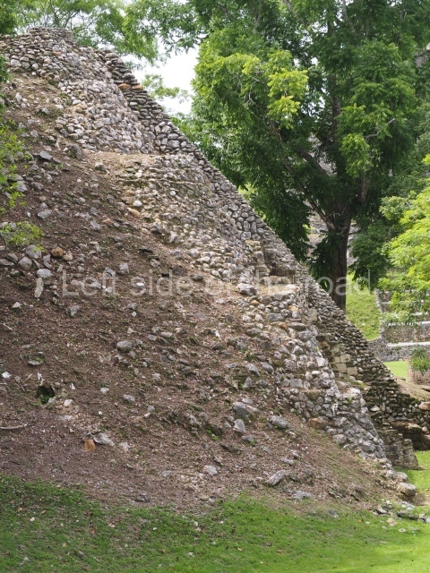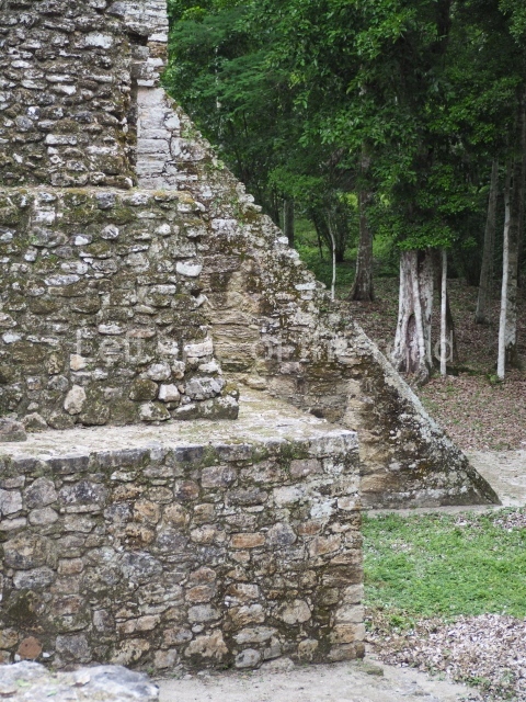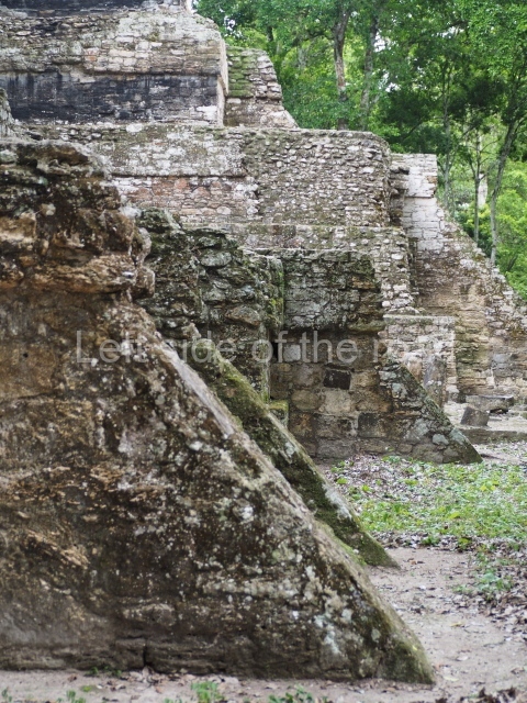 Access is from the north-east and the first area entered is Plaza B, the largest on the site. Structures B1, B2 and B3 seal the west side of the plaza. According to Joyce Kelly, this group formed an E-Group complex or astronomical marker of the solstices and equinoxes, like the one at Uaxactun in Guatemala. A royal burial from the Late Classic (AD 600 to 800) was discovered at Structure B1 with grave goods containing objects made from jade, carved shell and bone, ceramic vessels and a jade and shell mosaic belt mask. On the south side of the plaza lies structure B4, an elongated platform with a stairway at the front and mask remains on the balustrades. The explorations conducted by Joseph Ball and Jaime Awe have revealed a long occupational sequence, commencing in 1200 BC, which means that the site was one of the earliest settlements in the region. The reconstructed facade we see today dates from between 600 and 300 BC. The south-west corner of Plaza B leads to Plaza F, which has various low platforms that have not yet been restored. On the west side of this small plaza a double-flight stairway leads to the residential Groups E and D in the south-central area of the site. This section has been partially restored and contains excellent examples of Maya vaults and rooms with elegant benches for resting, not unlike those depicted in polychrome Maya vases.