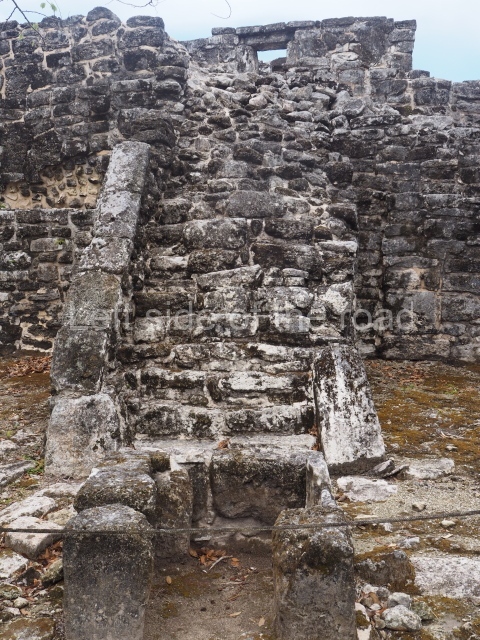 We are now in the south-east section of the Great Acropolis, in a partly excavated building, approximately 50 m in length with a broad stairway leading to a two-room construction. An associated stela is inscribed with the date AD 790.