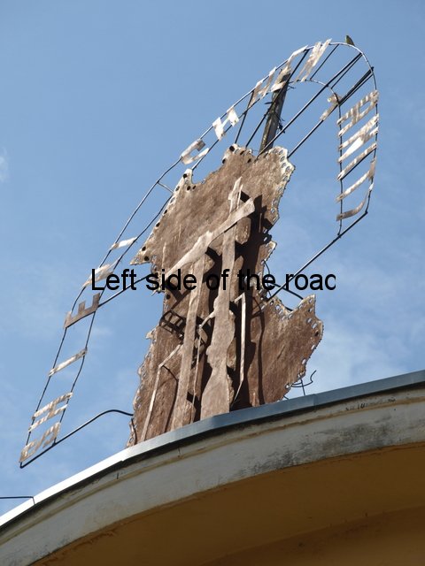 If you look closely at her face you can see that there are traces of red pigment on her lips, as if she was wearing lipstick. In her arms she holds a substantial sheaf of corn. This is quite a common way to demonstrate that she is a farm worker, such images appearing on the monument to the First Party Cell in Proger and in a monumental manner on the ‘Toka Jonë – Our Land’ statue in the main central square of Lushnje. Although common I can’t remember seeing men carrying the sheaves, either in statuary or painted representations.